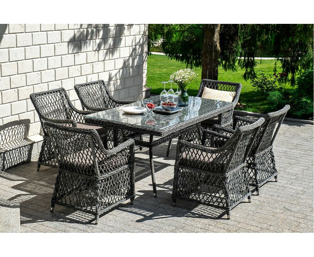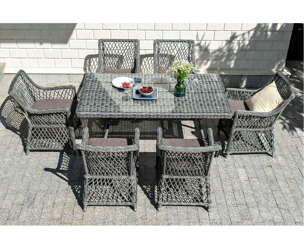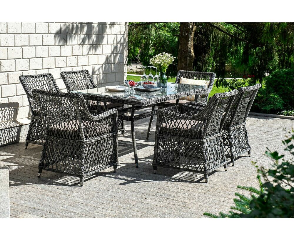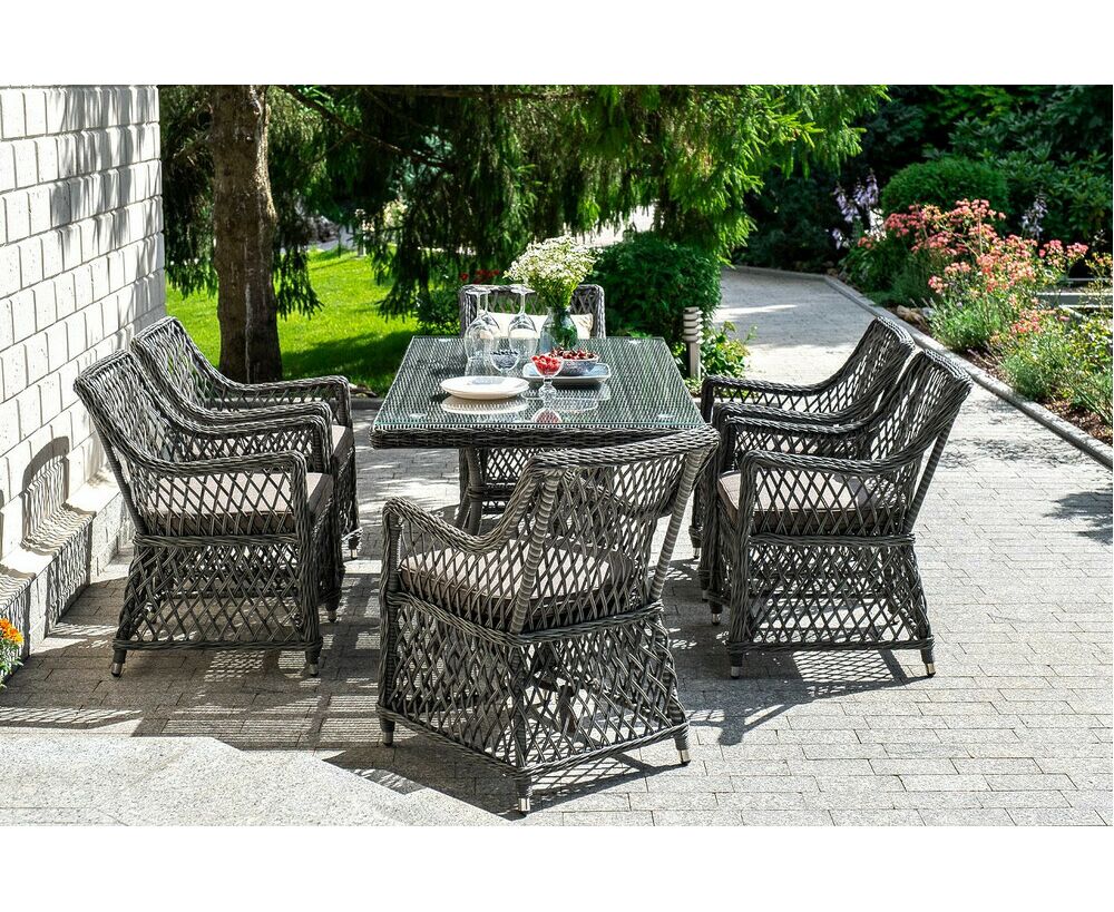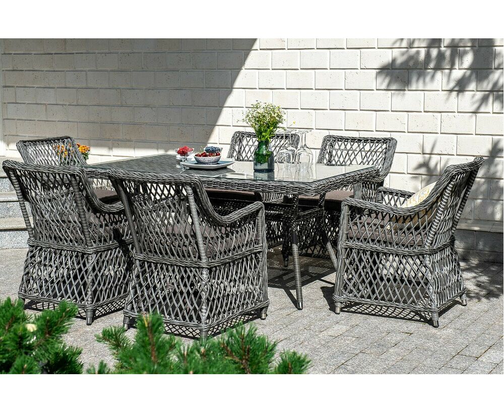 Кресла предполагают подушки со съемными влагоотталкивающими чехлами в комплекте. "Латте" плетеный стол из искусственного ротанга 160х90см, цвет графит 1шт. 1 600Х900Х750, "Латте" плетеное кресло из искусственного ротанга, цвет графит 6шт. 550Х660Х850,