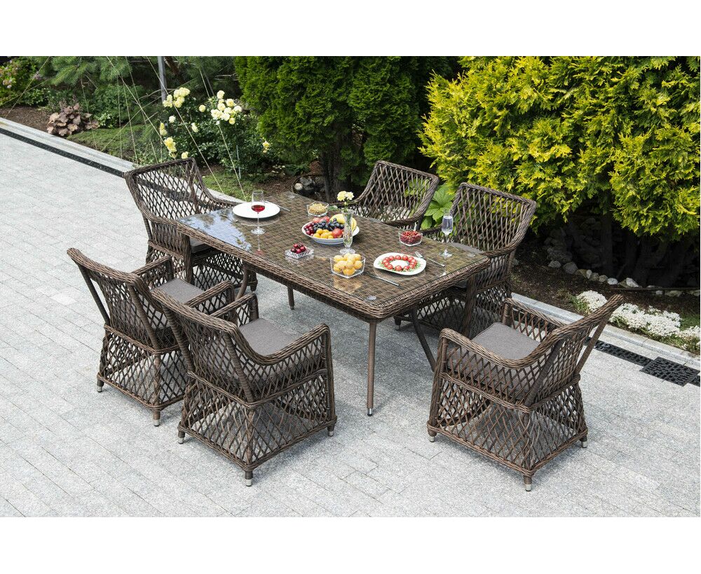 Комплект гармонично сочетает в себе алюминий, из которого выполнен каркас и декор из искусственного ротанга насыщенного шоколадного оттенка. Прекрасным дополнением мебели стали мягкие подушки из всепогодной ткани со съемными чехлами.