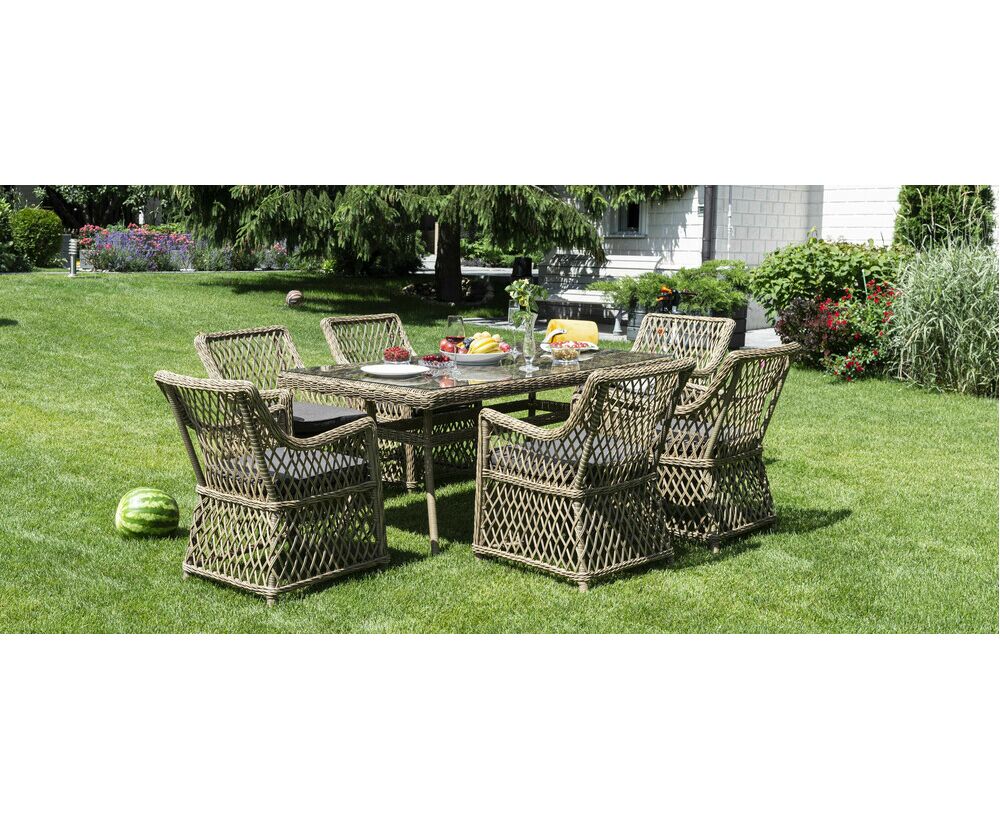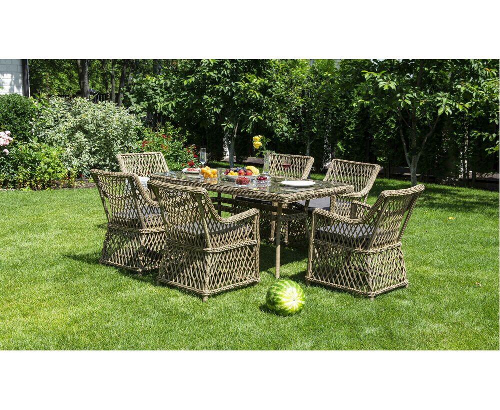 Элитная обеденная группа «Латте» для обустройства зоны отдыха на открытом пространстве. В комплекте прямоугольный обеденный стол 1600х900х750 мм и 6 кресел 680х550х840 мм.