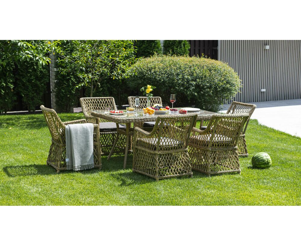 "Латте" плетеный стол из искусственного ротанга 160х90см, цвет соломенный 1шт. 1 600Х900Х750, "Латте" плетеное кресло из искусственного ротанга, цвет соломенный 6шт. 550Х660Х850,