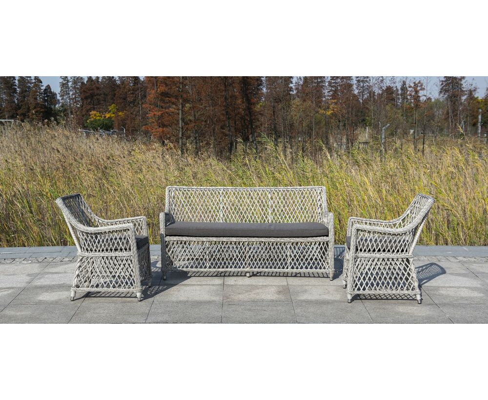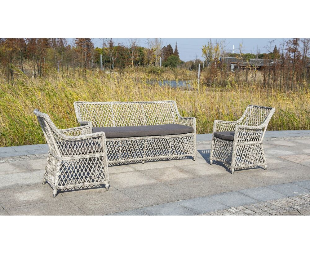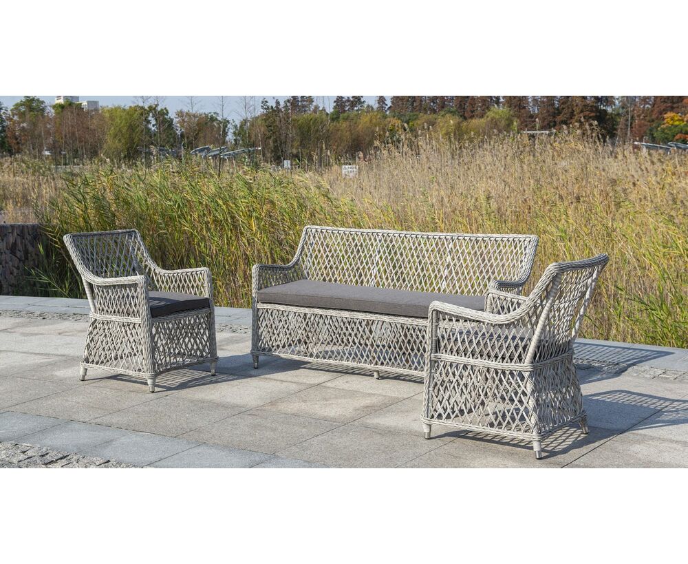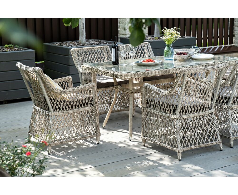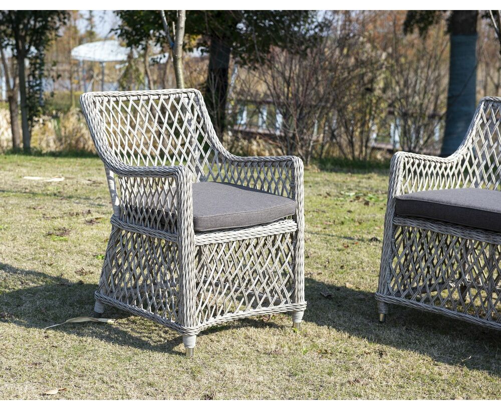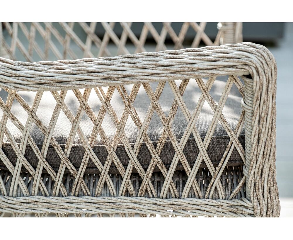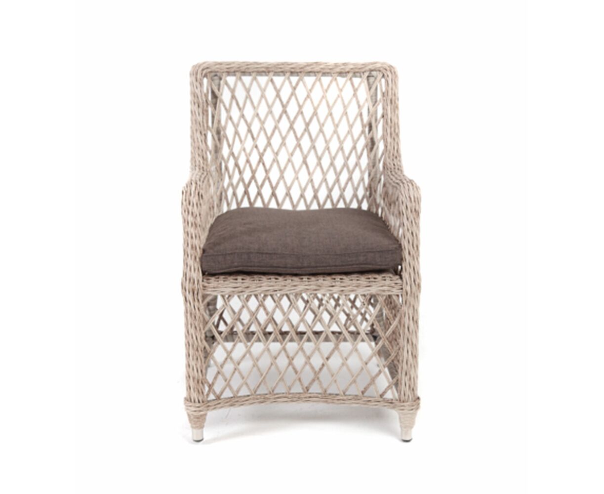 Каркас сделан из прочного алюминия. Сверху конструкции - ручное плетение из круглого искусственного ротанга. Стул бежевого цвета.