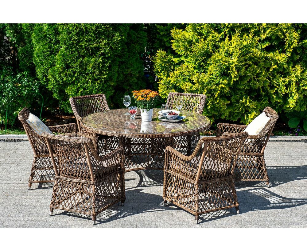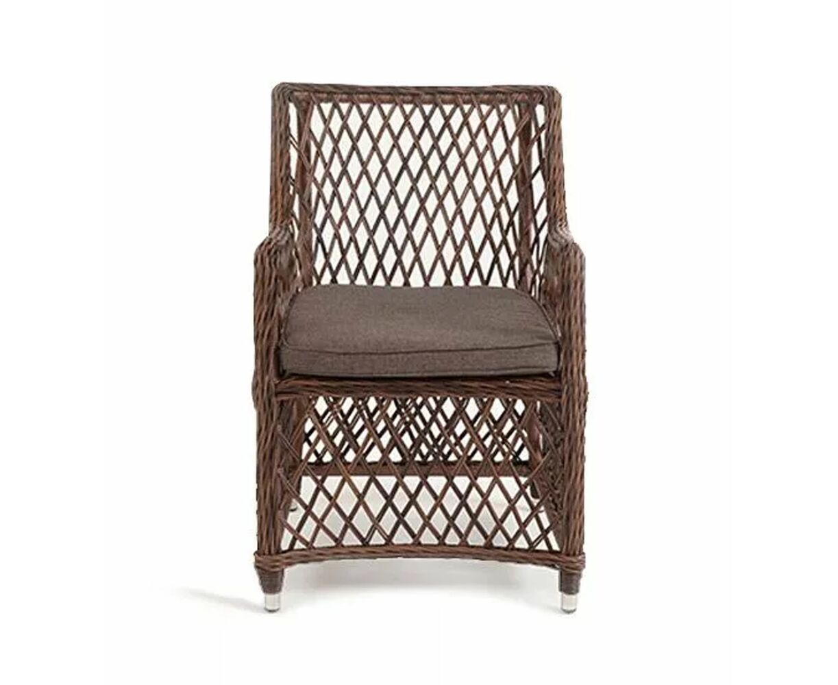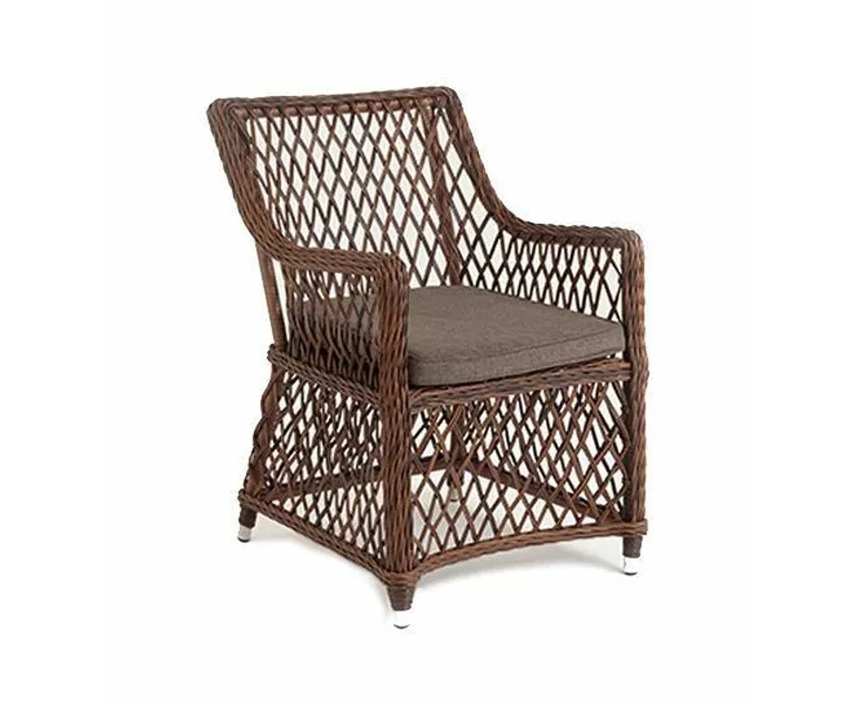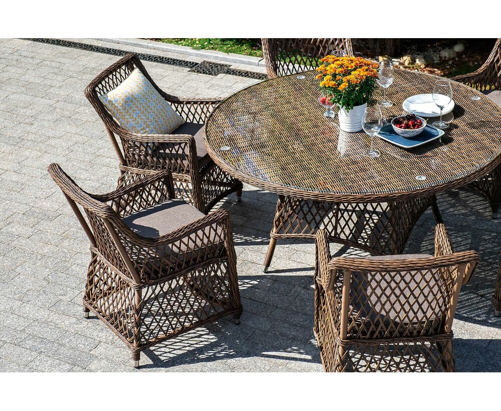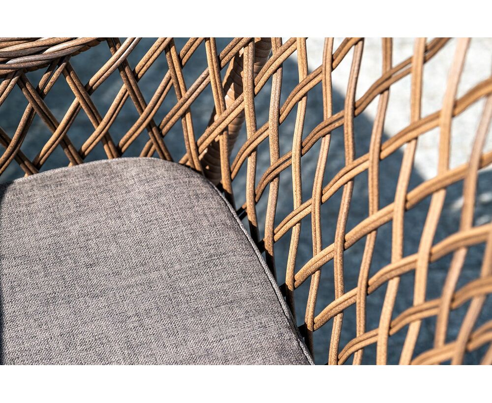 Каркас сделан из прочного алюминия. Сверху конструкции - ручное плетение из круглого искусственного ротанга. Стул коричневого цвета.