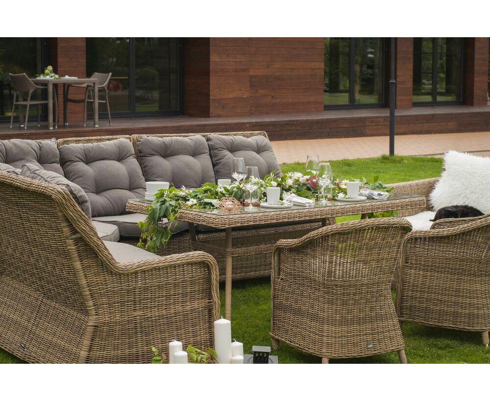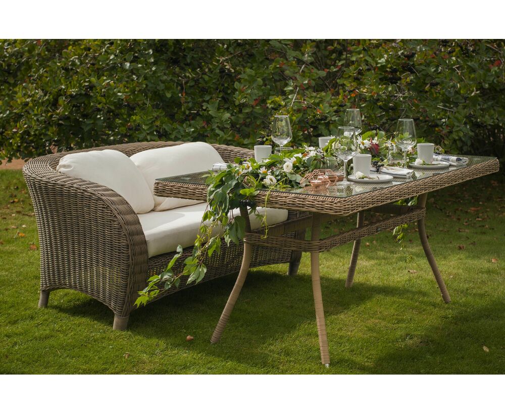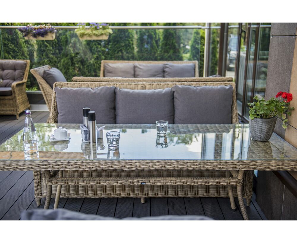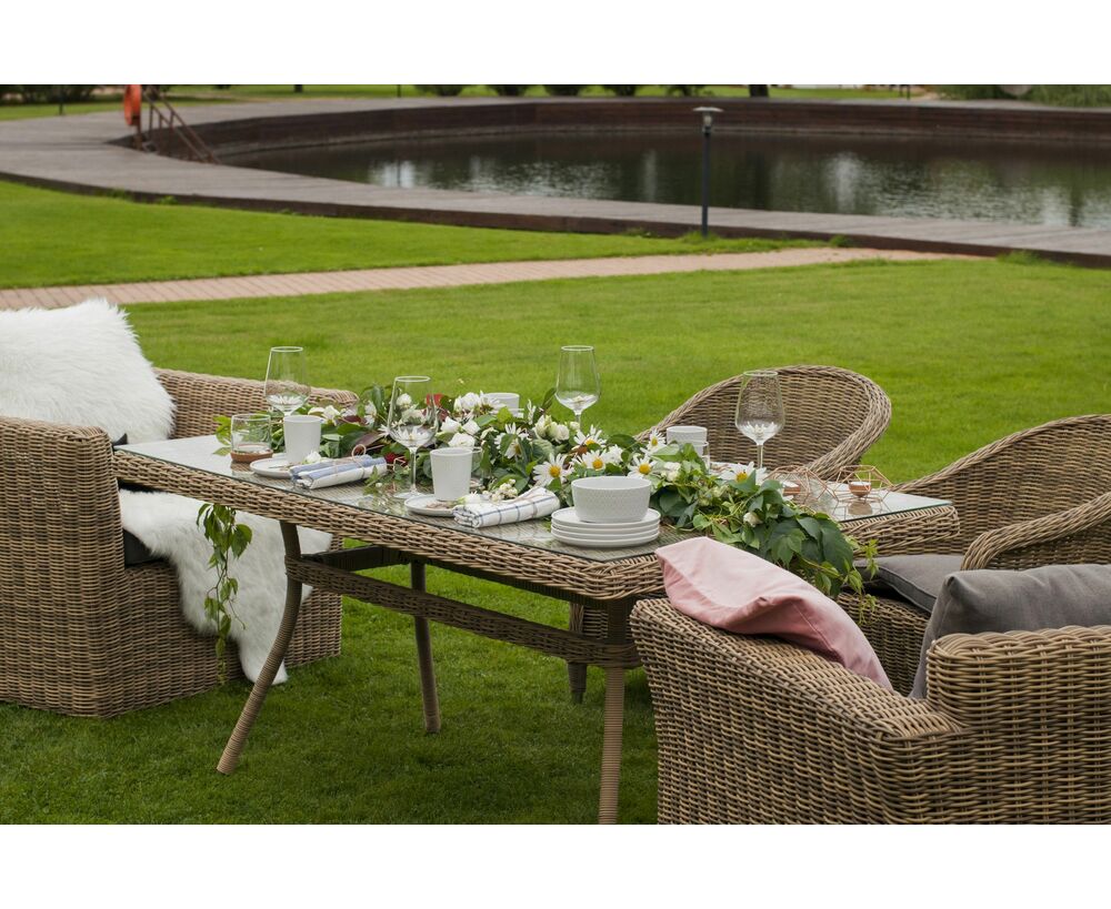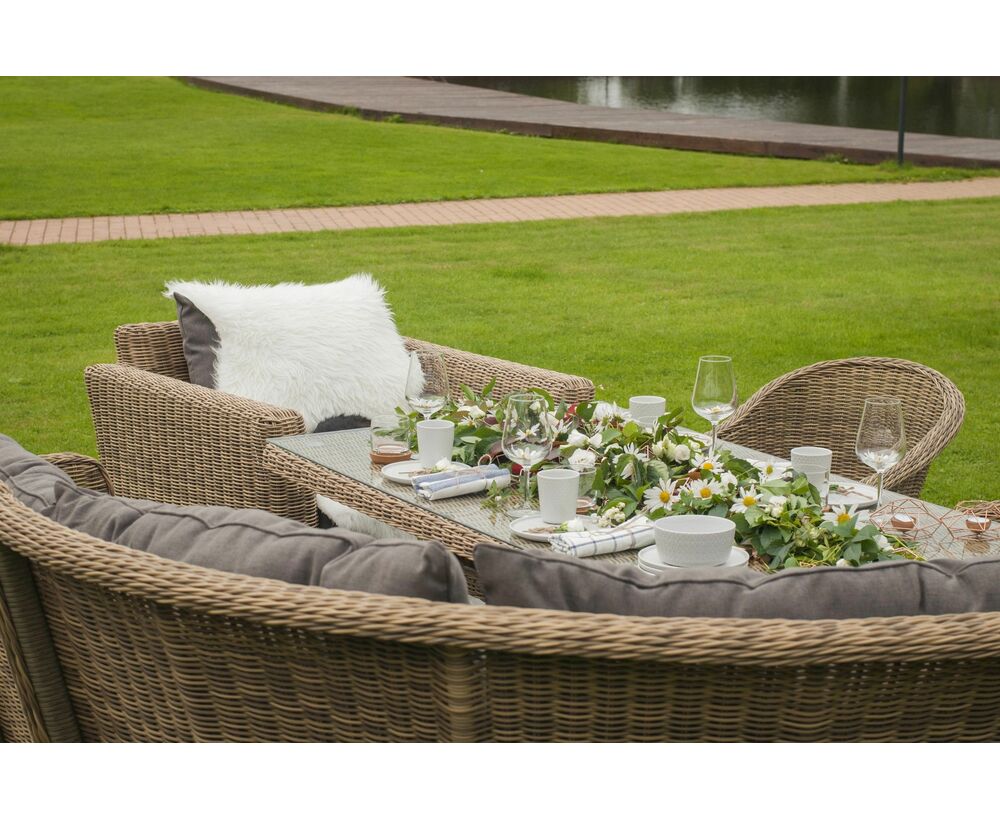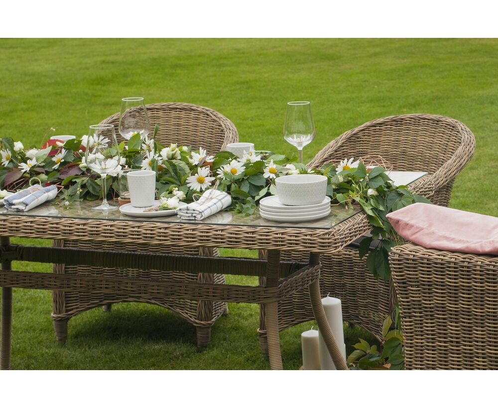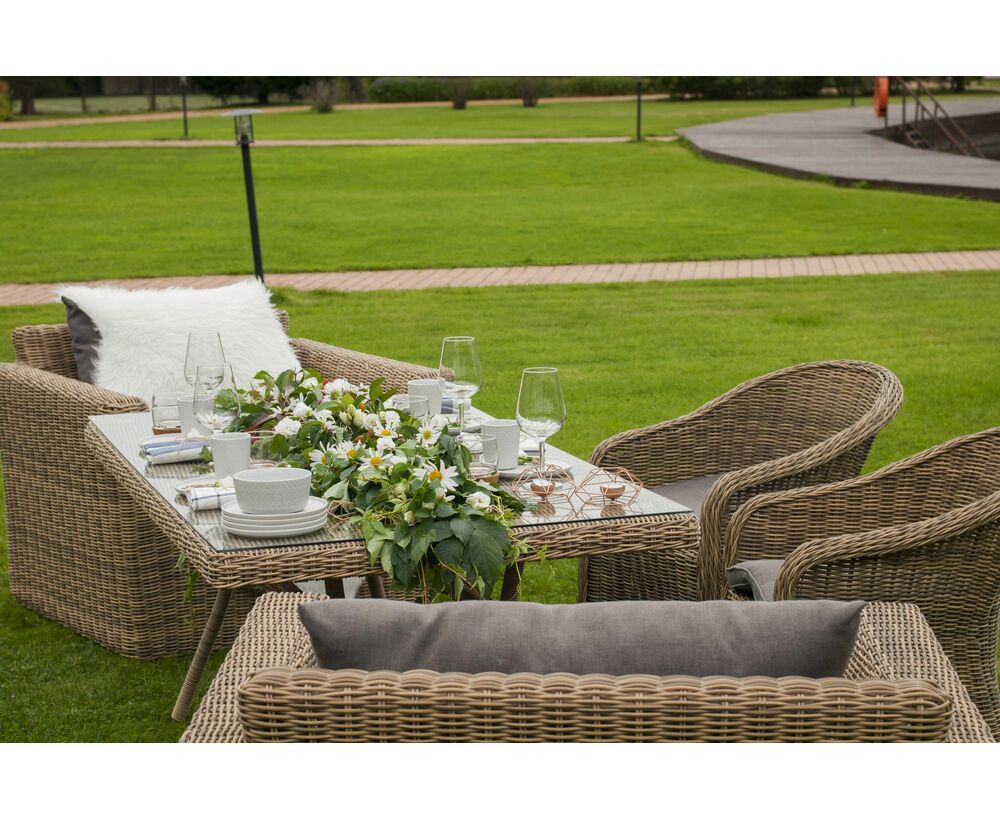 Размеры плетеного стола: 1600×900×750 мм. Рассчитан на 6 персон.