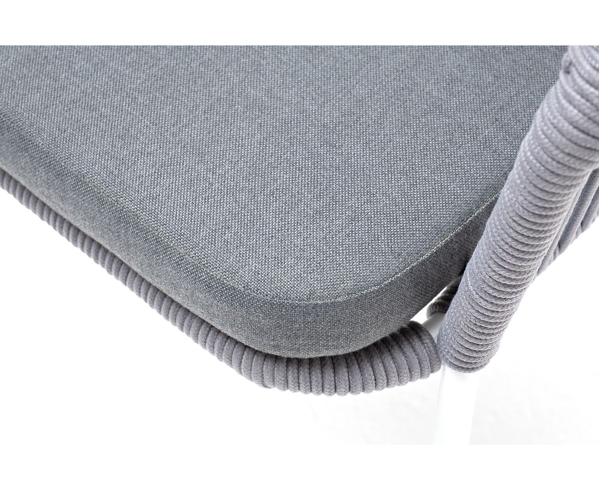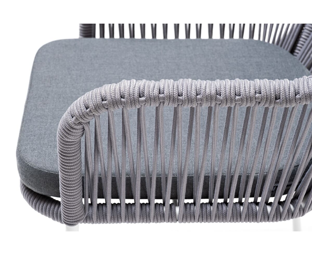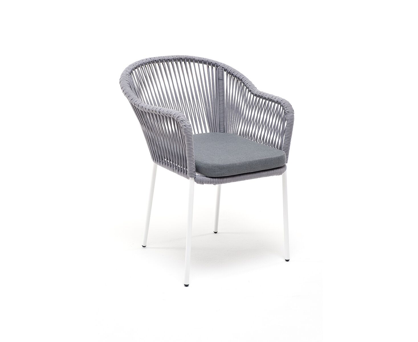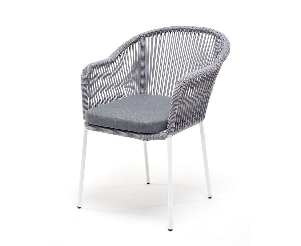 "Лион" стул плетеный из роупа, каркас из стали белый муар, роуп светло-серый круглый, ткань светло-серая