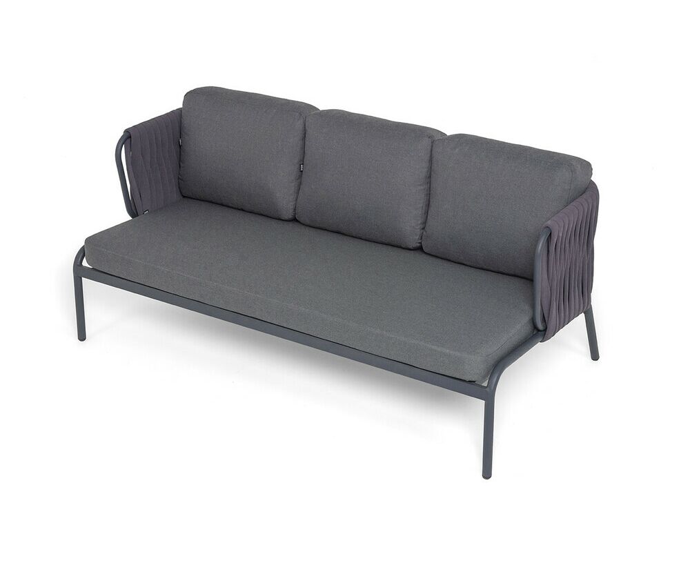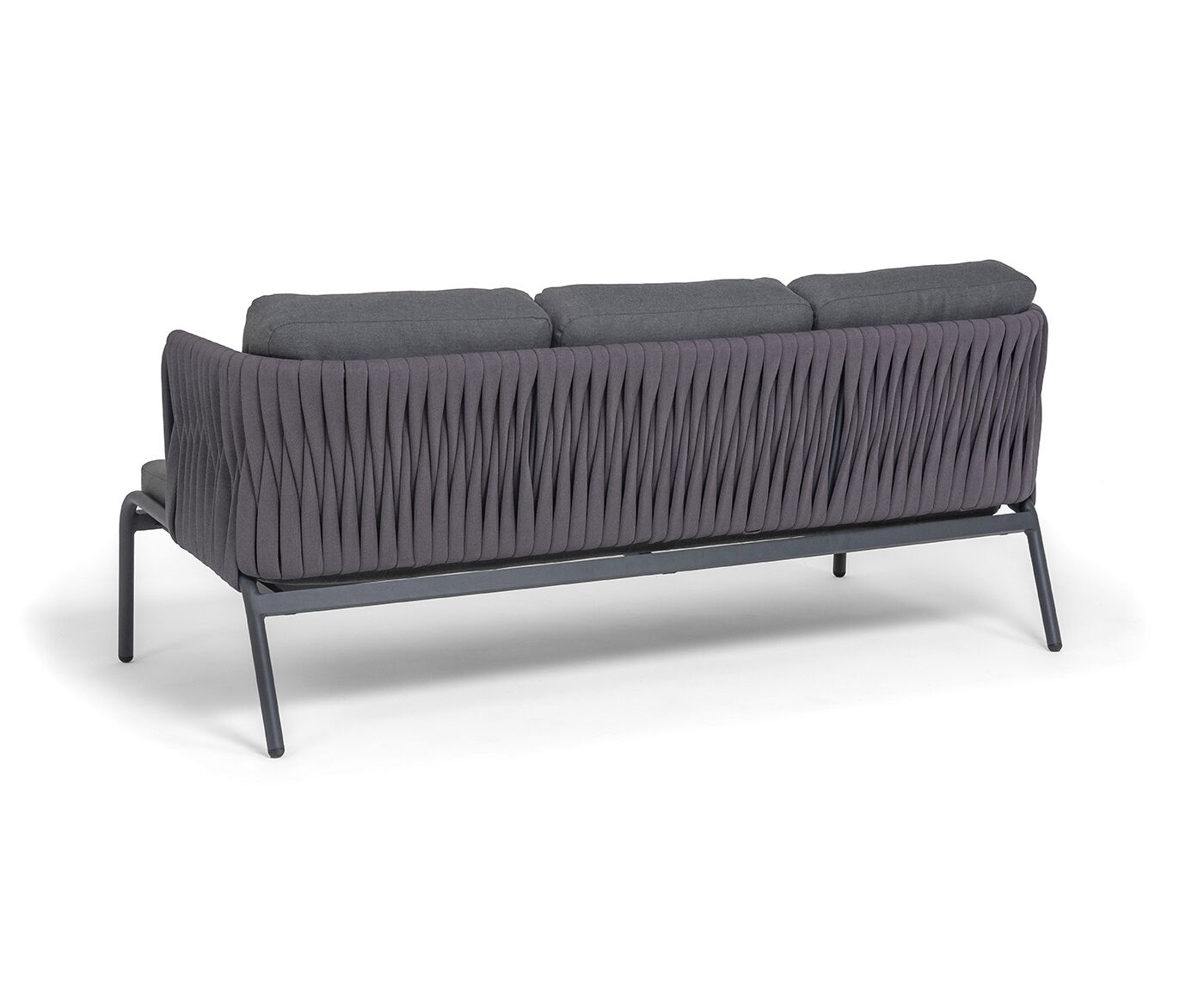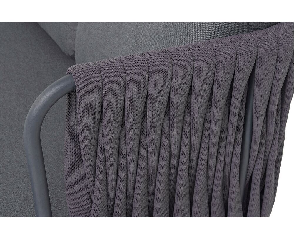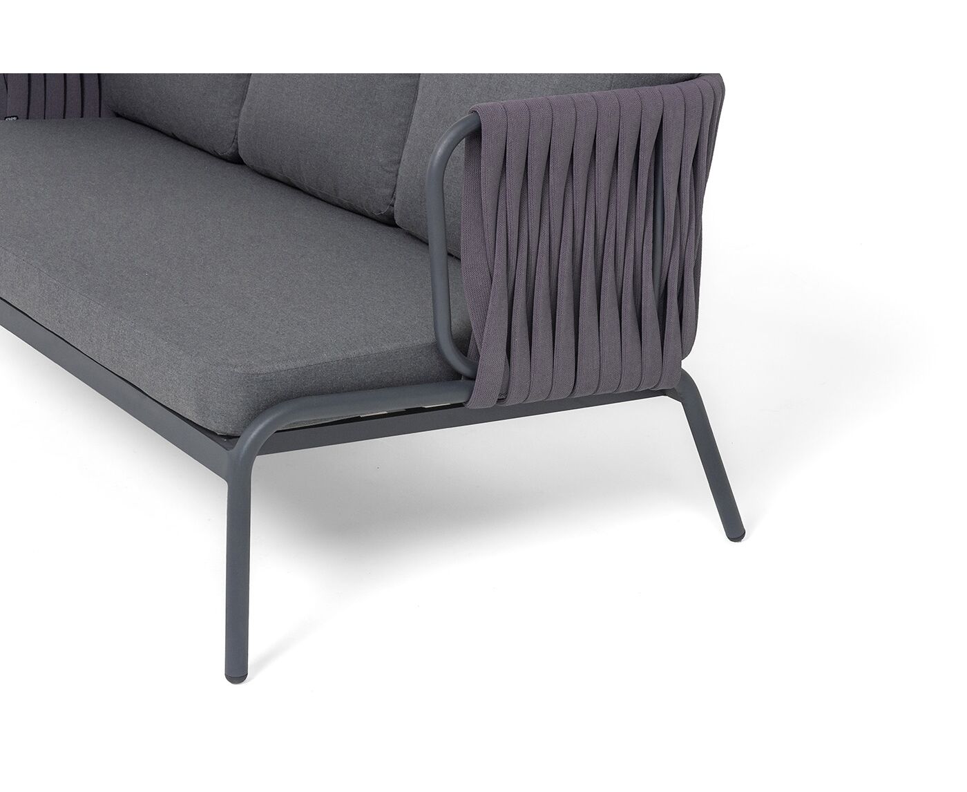 Диван имеет алюминиевый каркас, окрашенный порошковой краской в темно-серый (RAL7024) цвет. Боковины каркаса и спинка вручную оплетены роупом - эластичными синтетическими лентами, изготовленными из высокопрочных полиэфирных волокон. Цвет оплетки в тон каркасу - темно-серый.
