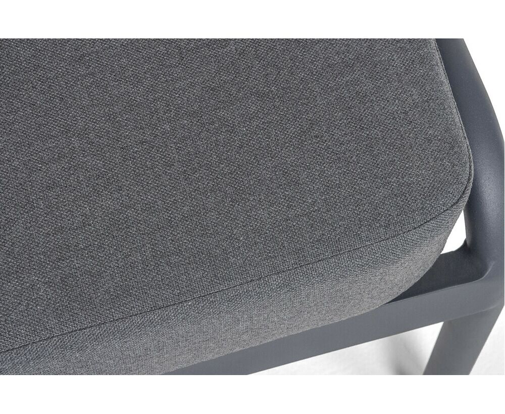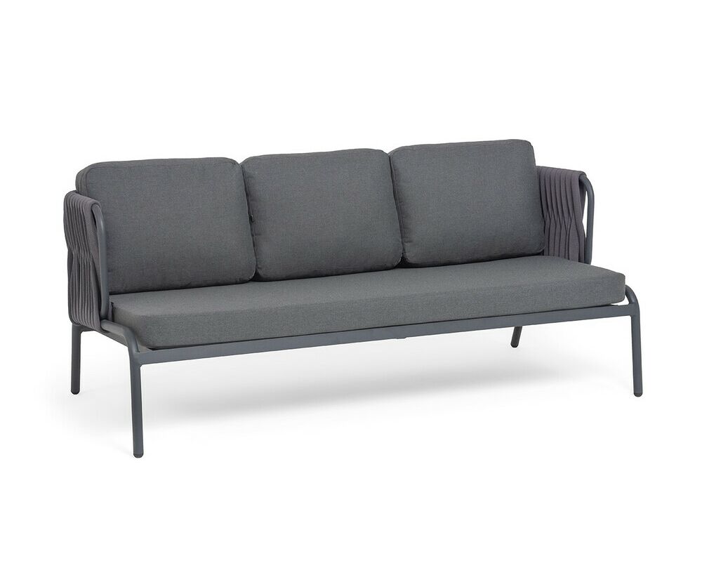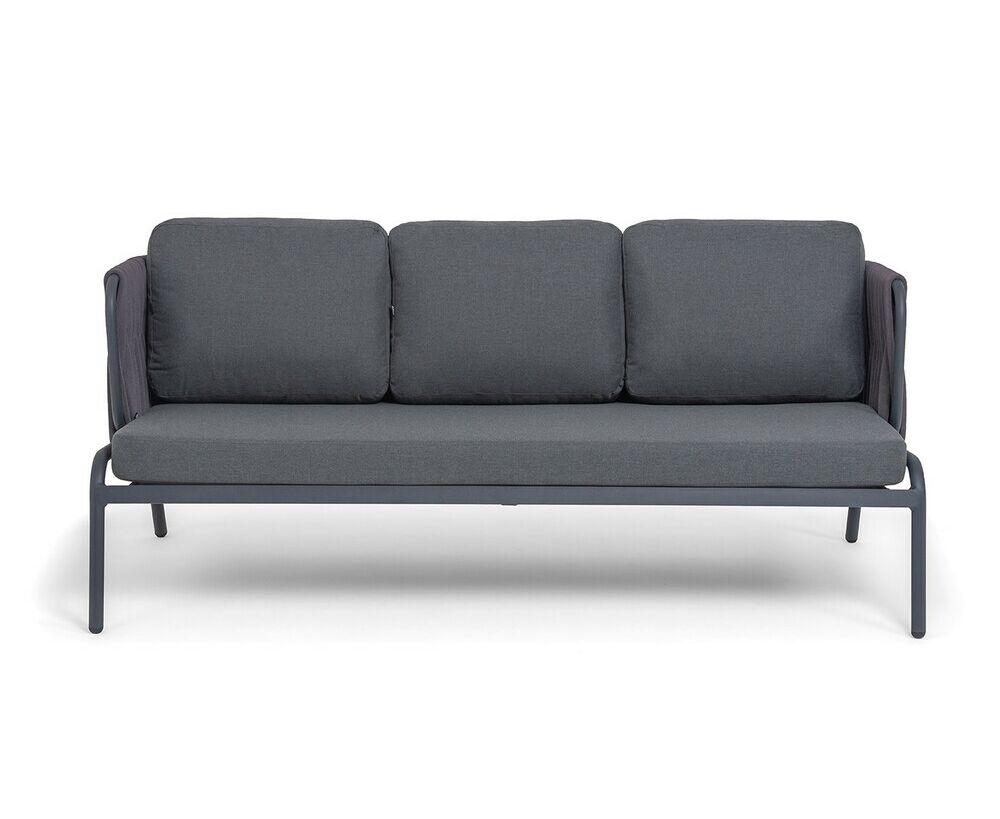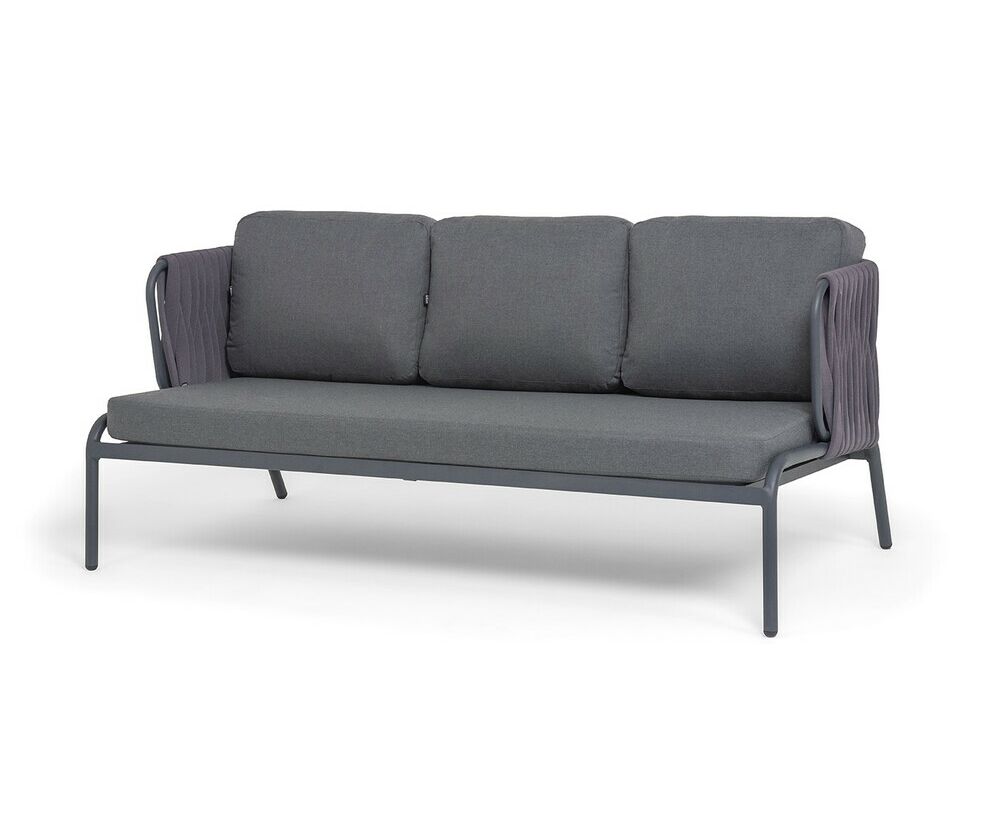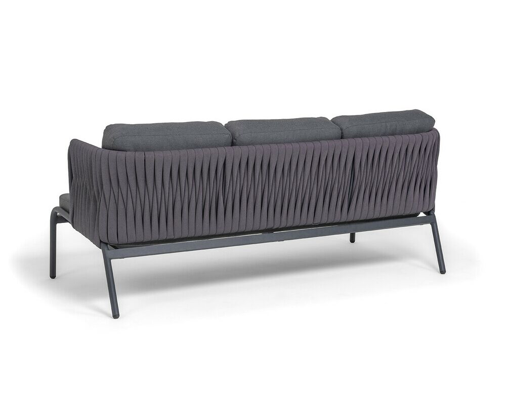 Диван имеет алюминиевый каркас, окрашенный порошковой краской в темно-серый (RAL7024) цвет. Боковины каркаса и спинка вручную оплетены роупом - эластичными синтетическими лентами, изготовленными из высокопрочных полиэфирных волокон. Цвет оплетки в тон каркасу - темно-серый.