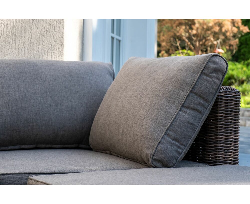Модули дивана и оттоманка укомплектованы подушками со съемными чехлами серо-коричневого цвета. Они состоят из полиэстера с плотностью 230гр/м2. Защитные качества материала усилены путем его обработки влагоотталкивающими составами.