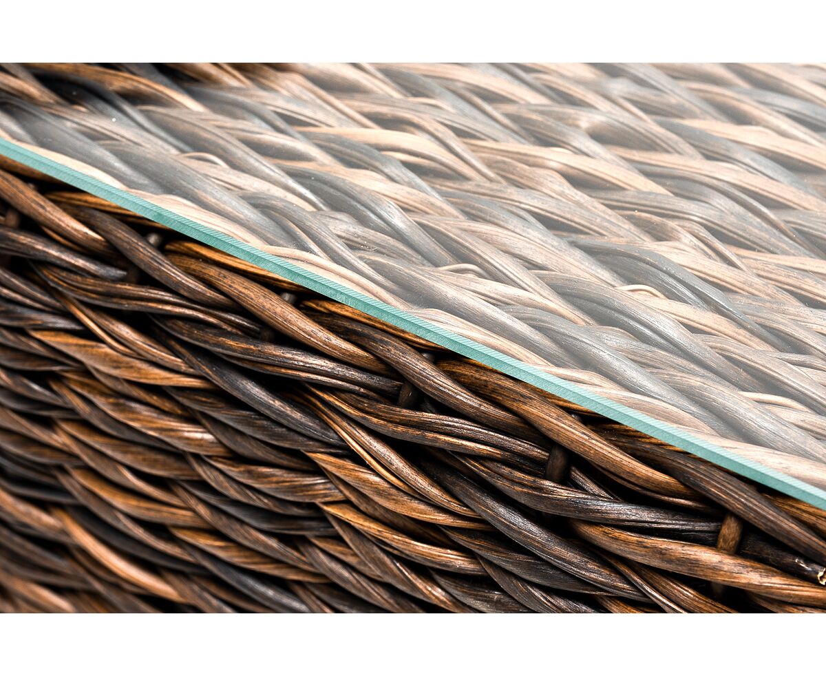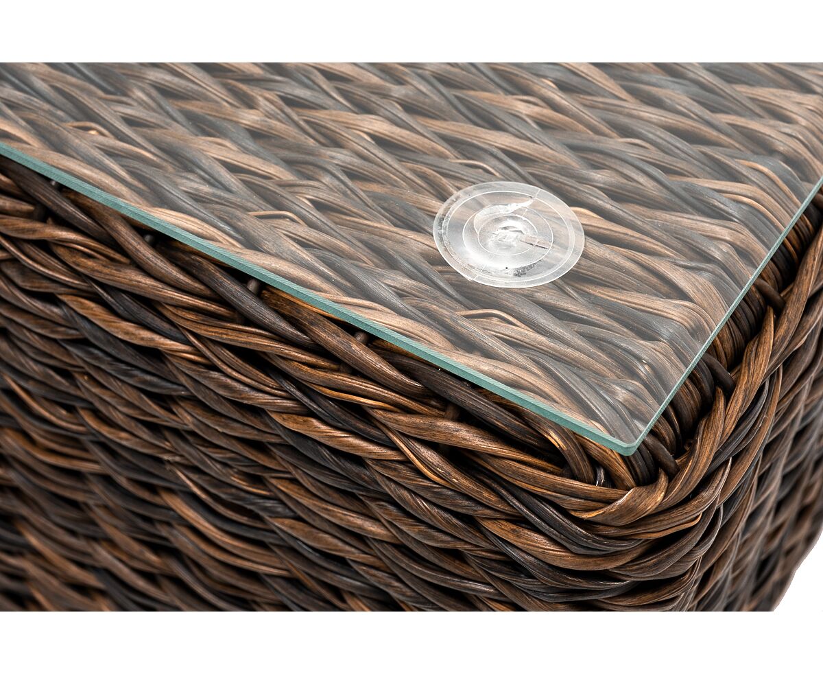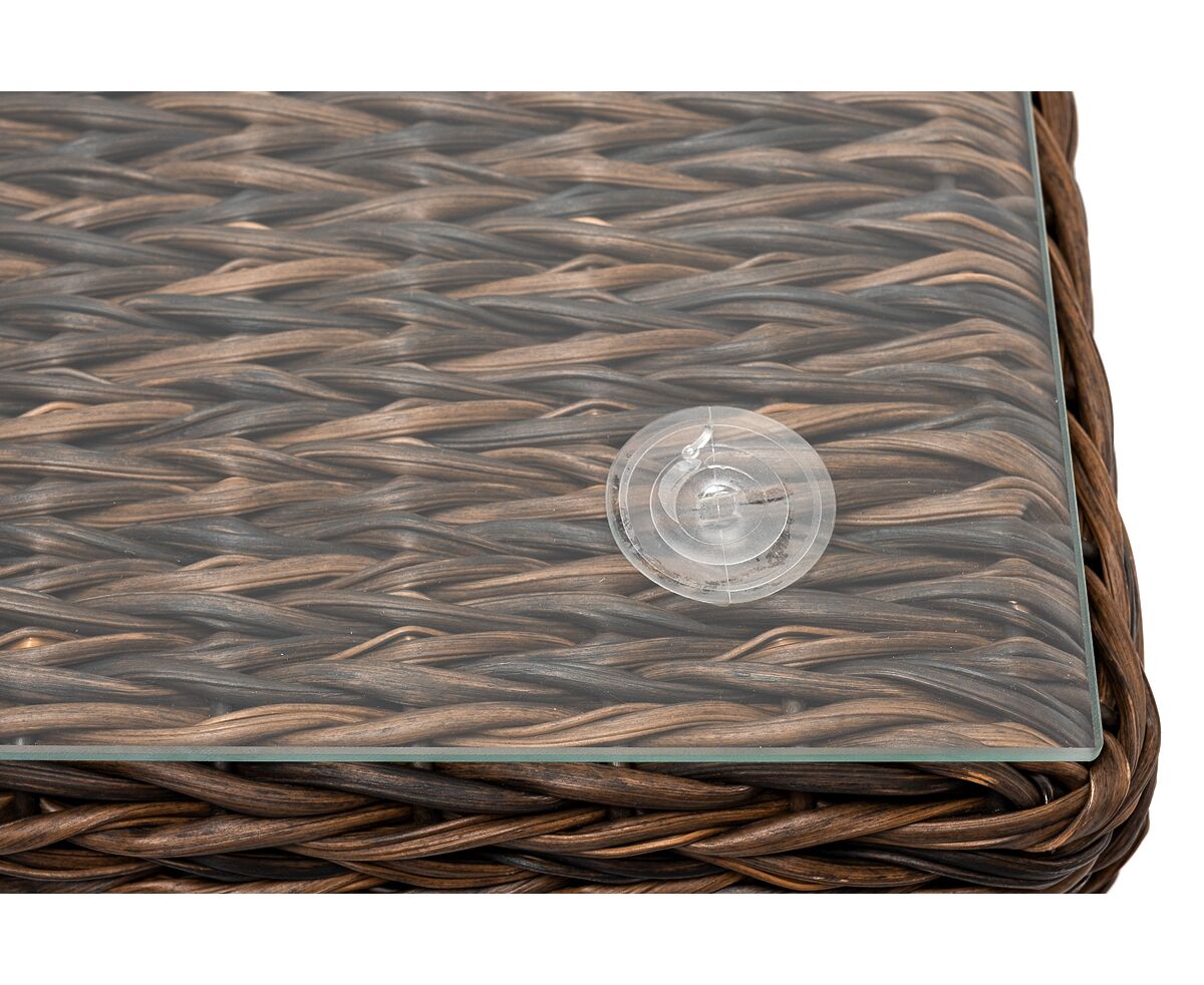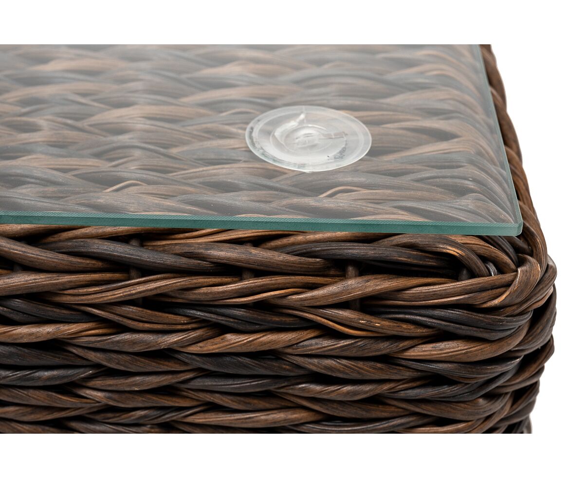 Размер модели – 740×740×300 мм. Компактные габариты позволяют удобно разместить мебельный элемент в месте с ограниченным свободным пространством. Столик имеет прочный алюминиевый каркас. Ручное плетение вида "гиацинт" сделано из искусственного ротанга и представлено в коричневом цвете.