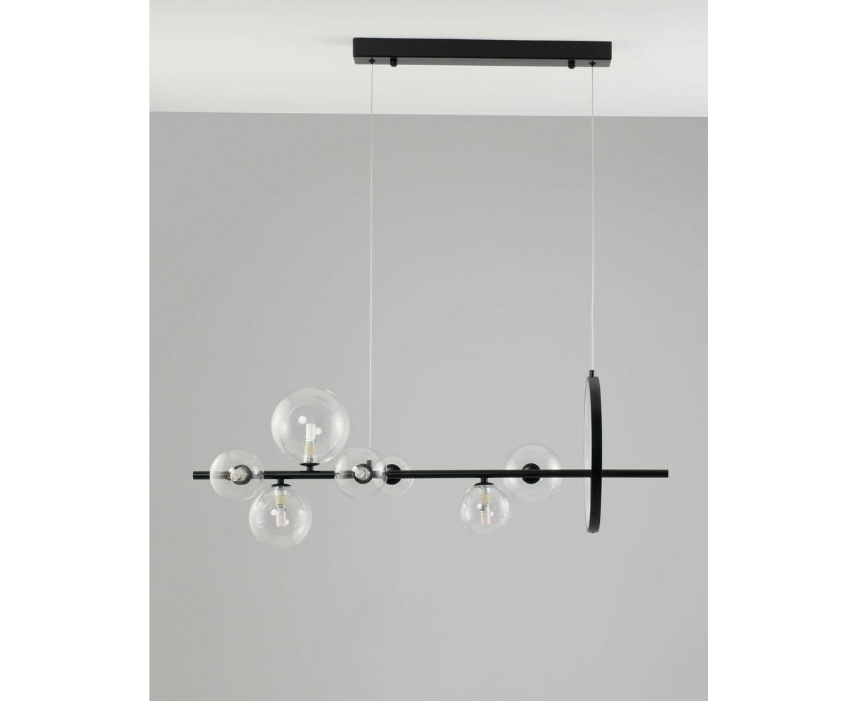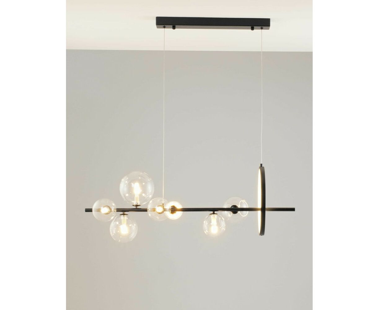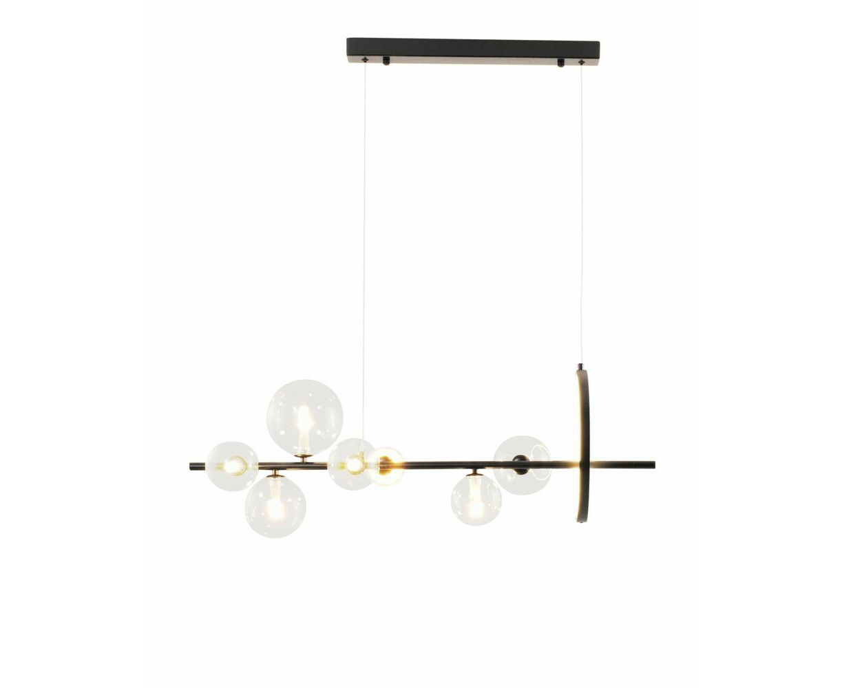 Современная подвесная люстра Dakisa. Металлический каркас длиной 90 см дополнен 7 плафонами из прозрачного стекла и круглой вставкой с LED лентой. Оригинальный дизайн люстры украсит любой современный интерьер зала, барной или обеденной зоны, а также впишется в интерьеры ресторанов и кафе. При необходимости общую высоту люстры можно отрегулировать с помощью подвесных тросов при монтаже. Площадь освещения составляет 40 кв.м