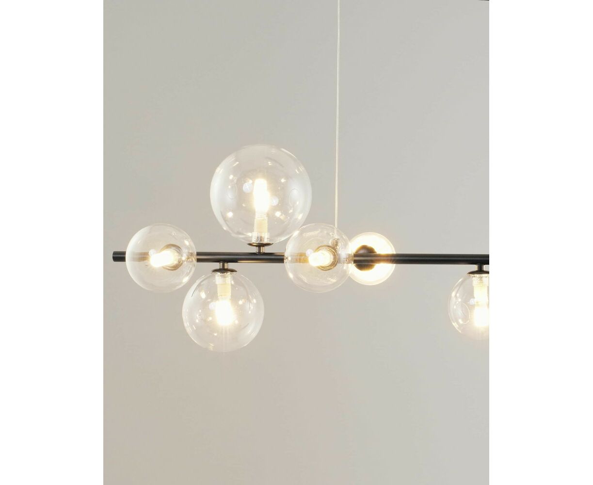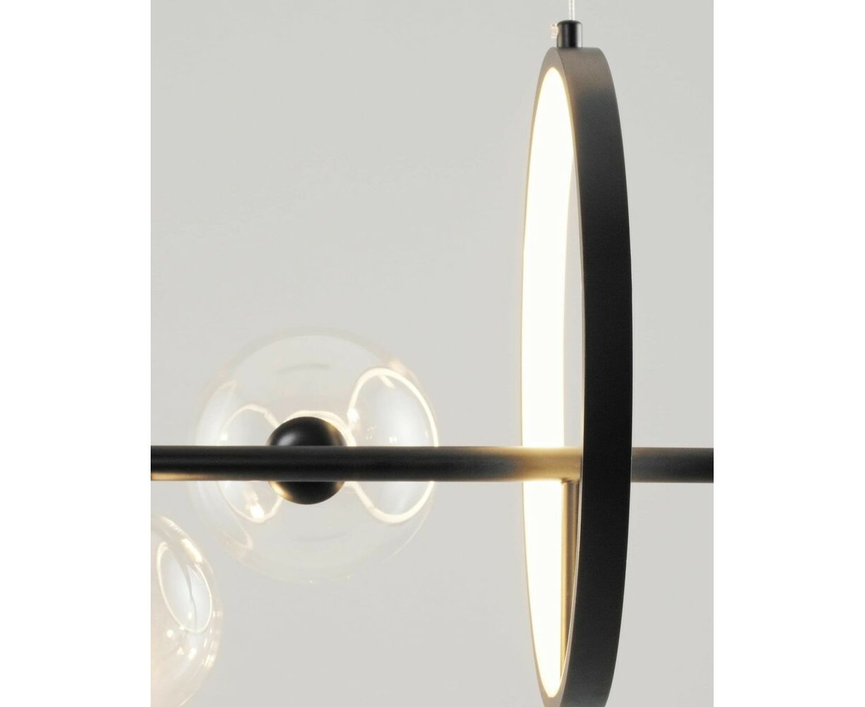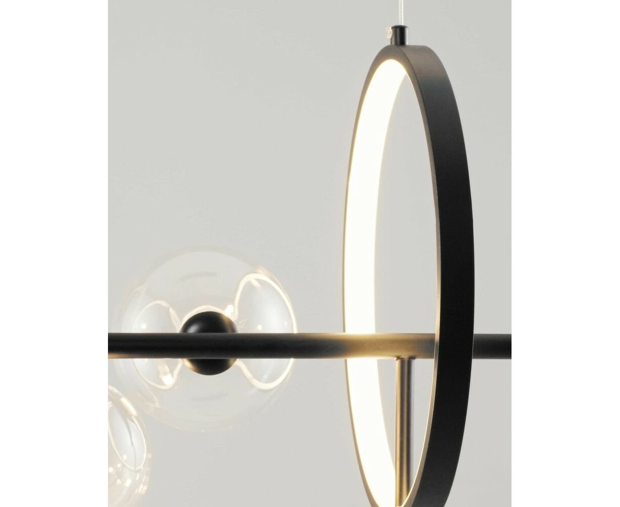 Современная подвесная люстра Dakisa. Металлический каркас длиной 90 см дополнен 7 плафонами из прозрачного стекла и круглой вставкой с LED лентой. Оригинальный дизайн люстры украсит любой современный интерьер зала, барной или обеденной зоны, а также впишется в интерьеры ресторанов и кафе. При необходимости общую высоту люстры можно отрегулировать с помощью подвесных тросов при монтаже. Площадь освещения составляет 40 кв.м