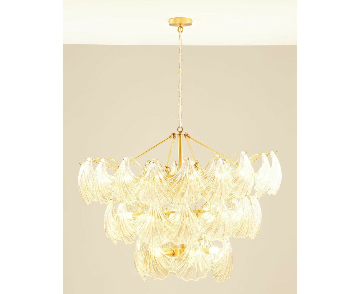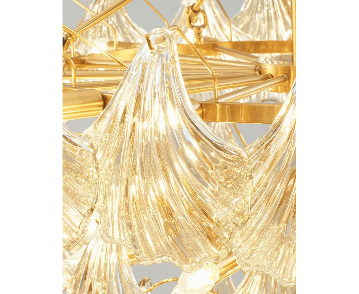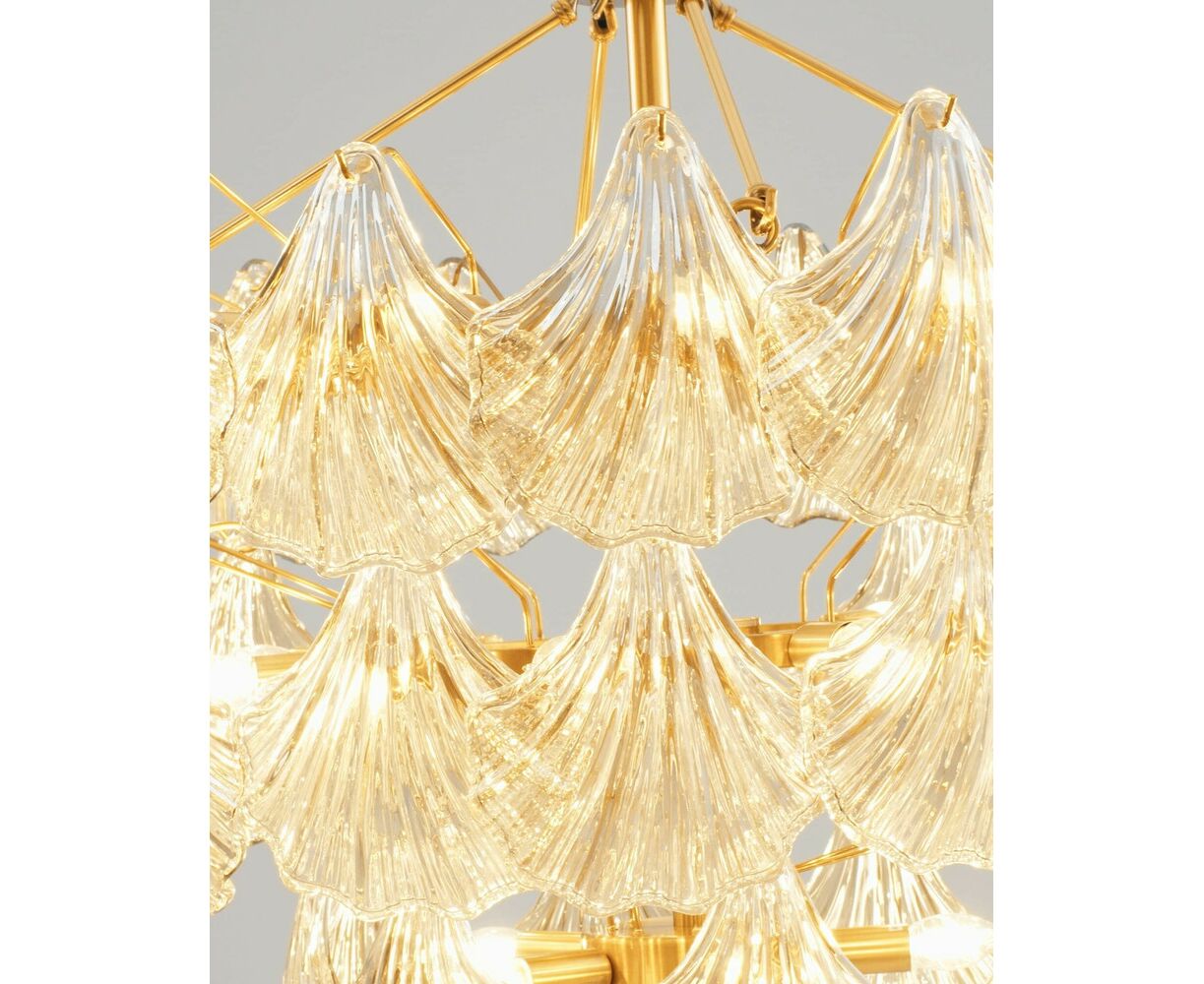 Роскошная люстра итальянского бренда в изысканном стиле. Стеклянные элементы в форме ракушек дают мягкий атмосферный свет и создают на стенах и потолке красивую игру света и тени. А сочетание латуни и фигурного стекла - это проверенное временем решение, которое подчеркивает хороший вкус. Люстра равномерно освещает площадь 50 кв.м. Диаметр 100 см. В комплекте представлены бра Moderli V10411-1W Justine.