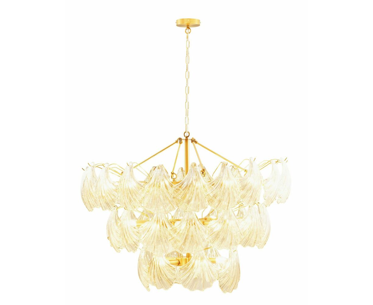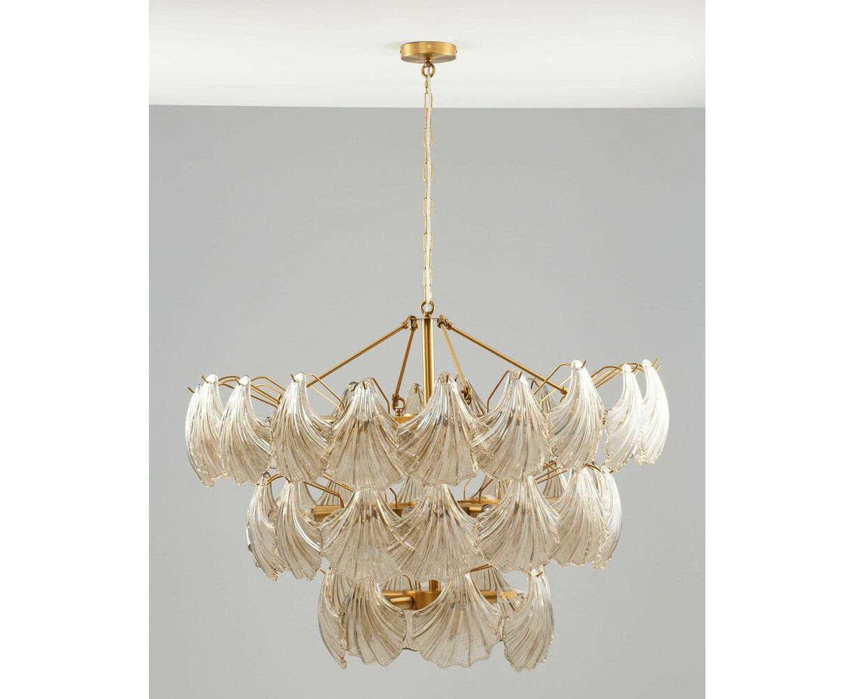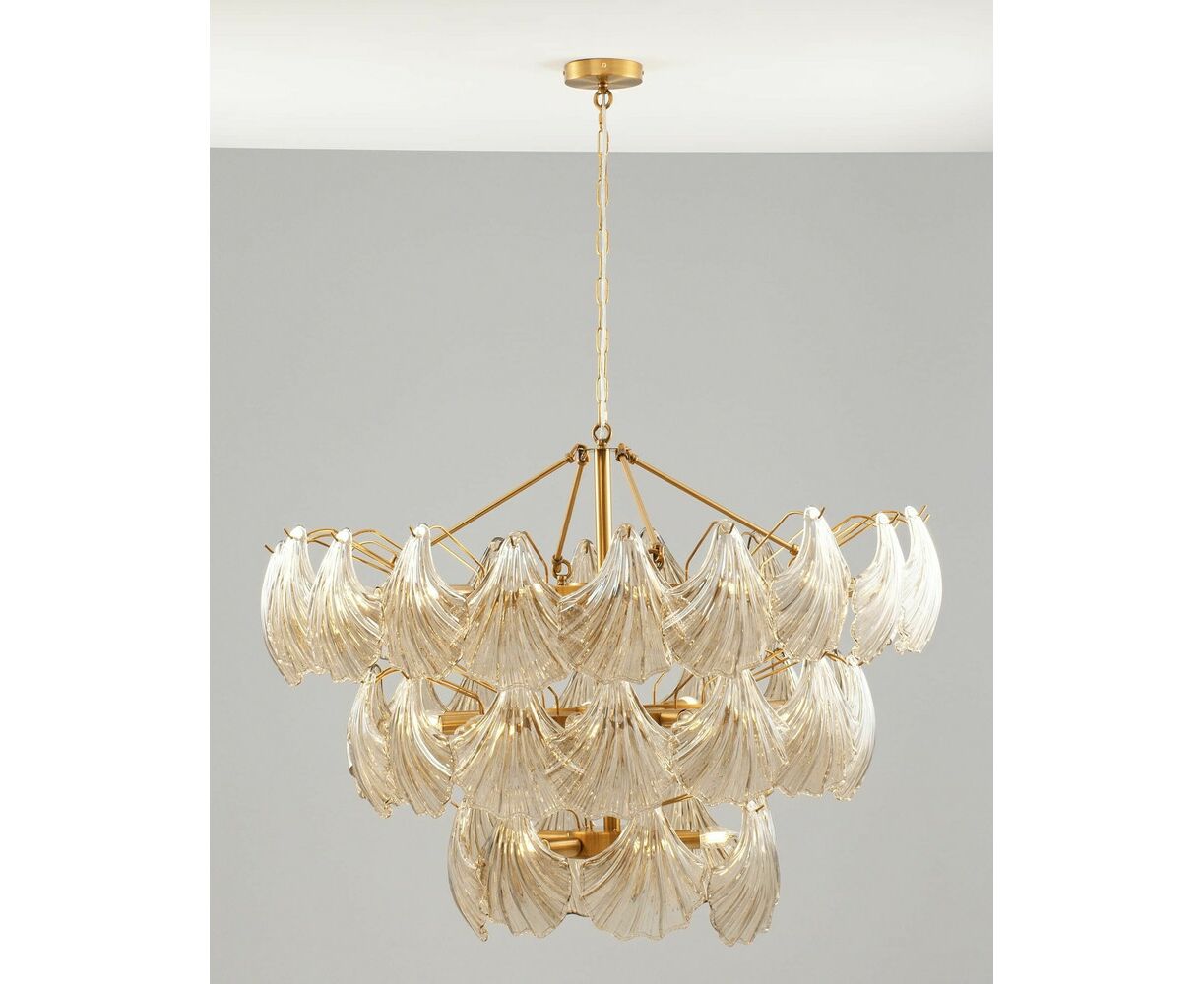 Роскошная люстра итальянского бренда в изысканном стиле. Стеклянные элементы в форме ракушек дают мягкий атмосферный свет и создают на стенах и потолке красивую игру света и тени. А сочетание латуни и фигурного стекла - это проверенное временем решение, которое подчеркивает хороший вкус. Люстра равномерно освещает площадь 50 кв.м. Диаметр 100 см. В комплекте представлены бра Moderli V10411-1W Justine.
