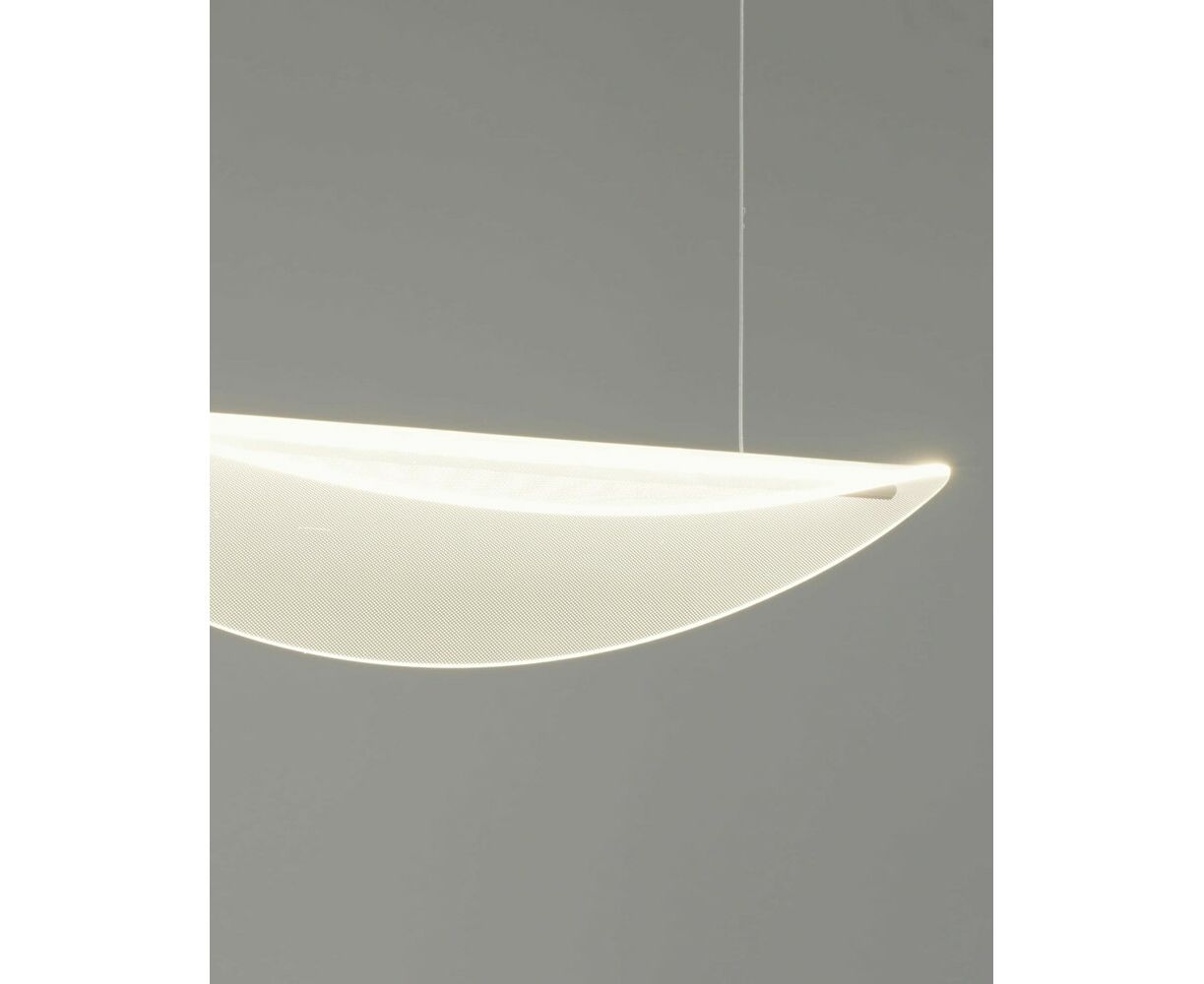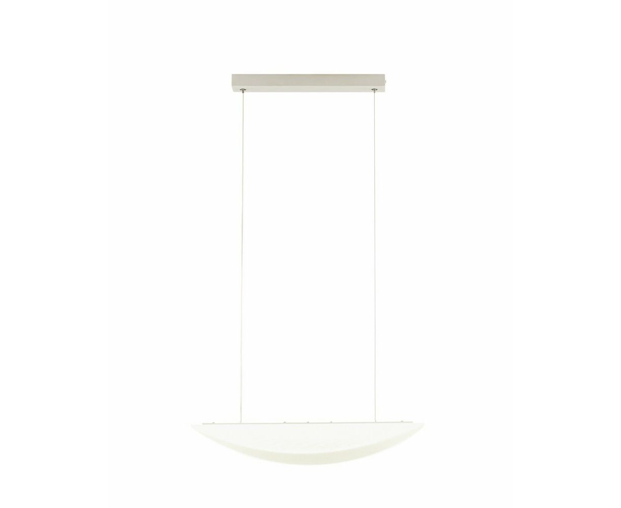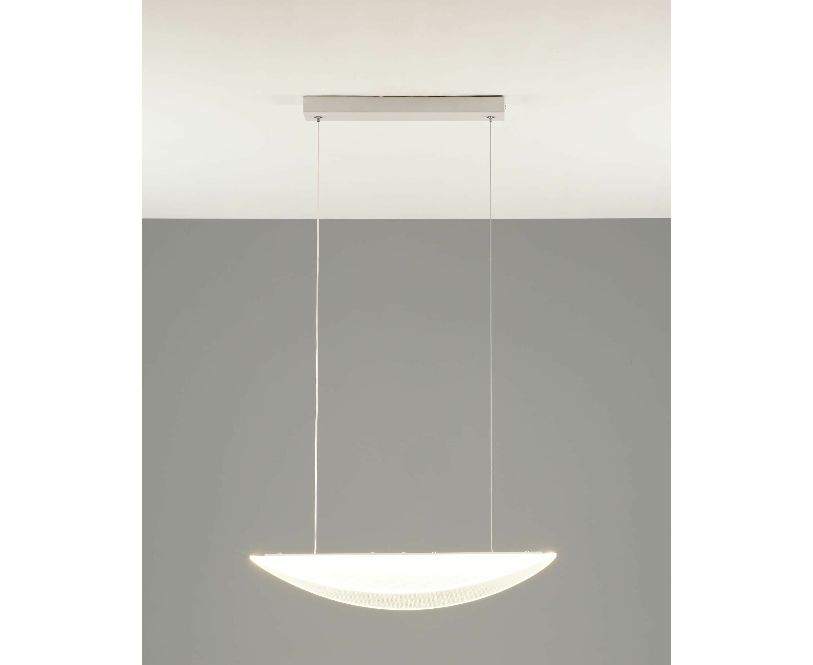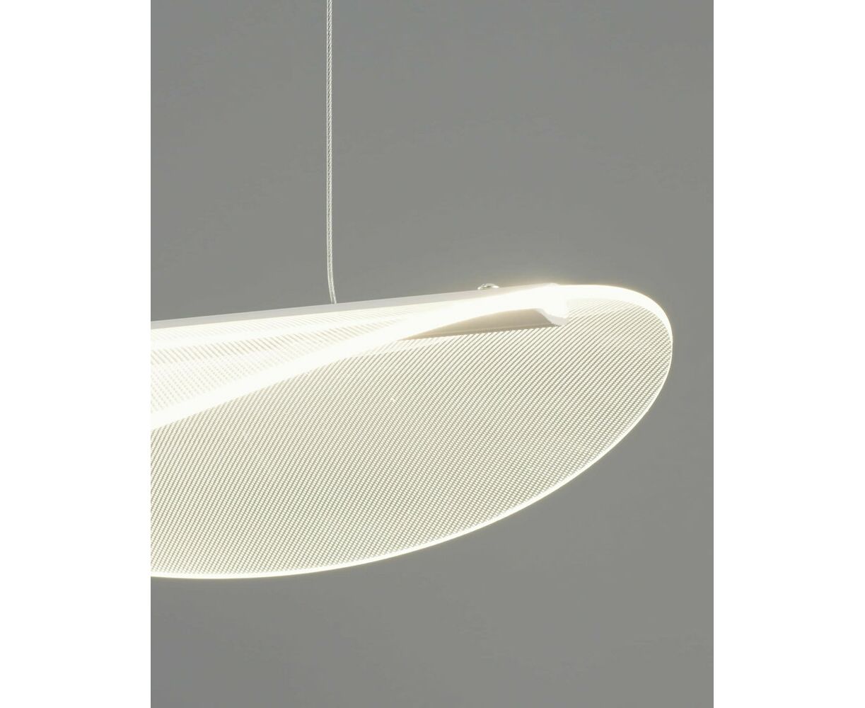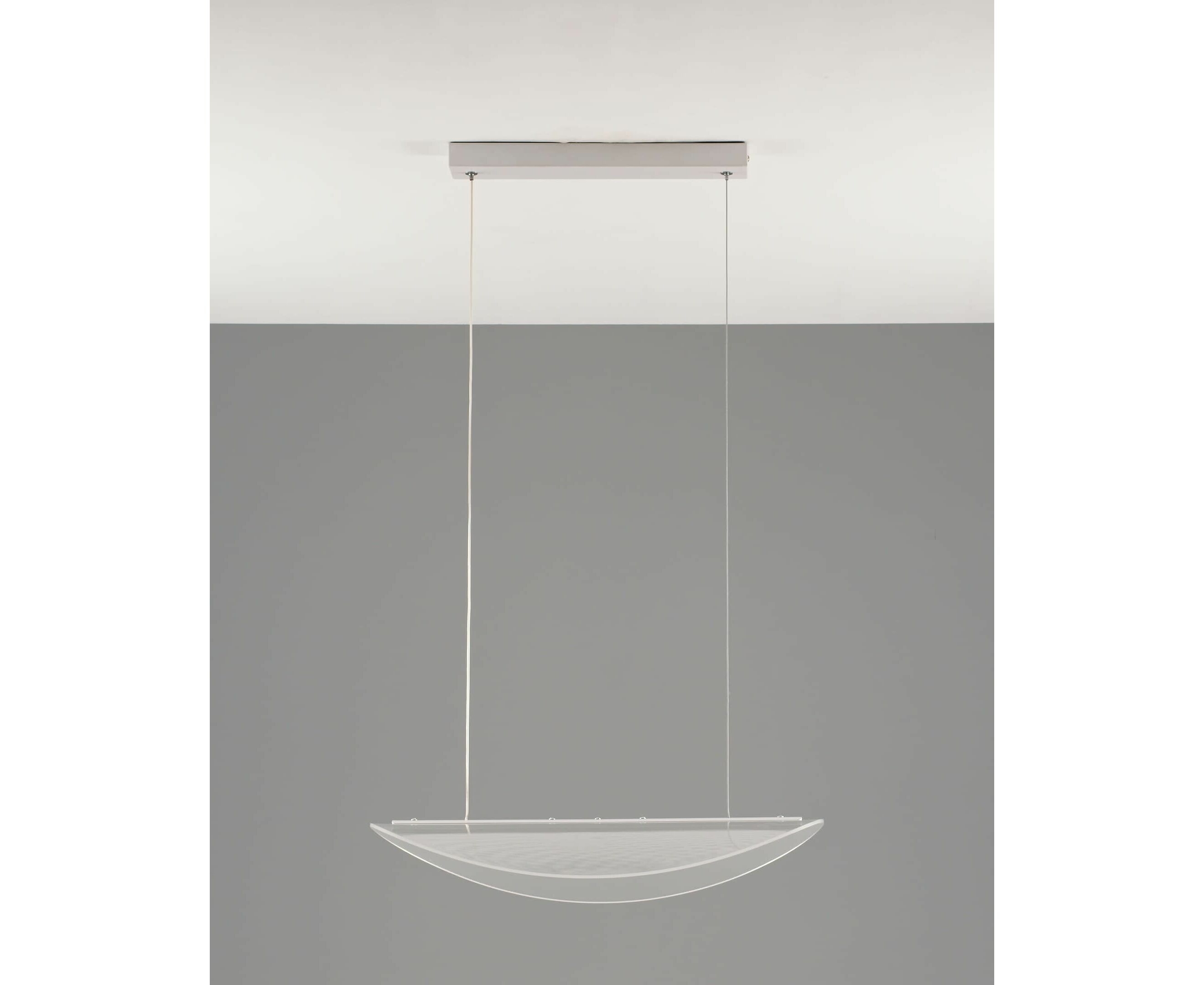 Современная подвесная люстра со светодиодной лентой. Воздушный и лаконичный дизайн достигается за счет изогнутого плафона из прозрачного акрила. Встроенная светодиодная лента мощностью 18 Вт и с цветовой температурой 4000 К создает мягкое нейтральное освещение. Люстра не нагромождает пространство и идеально дополнит современный интерьер кухни, обеденной и барной зоны.