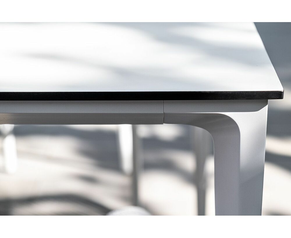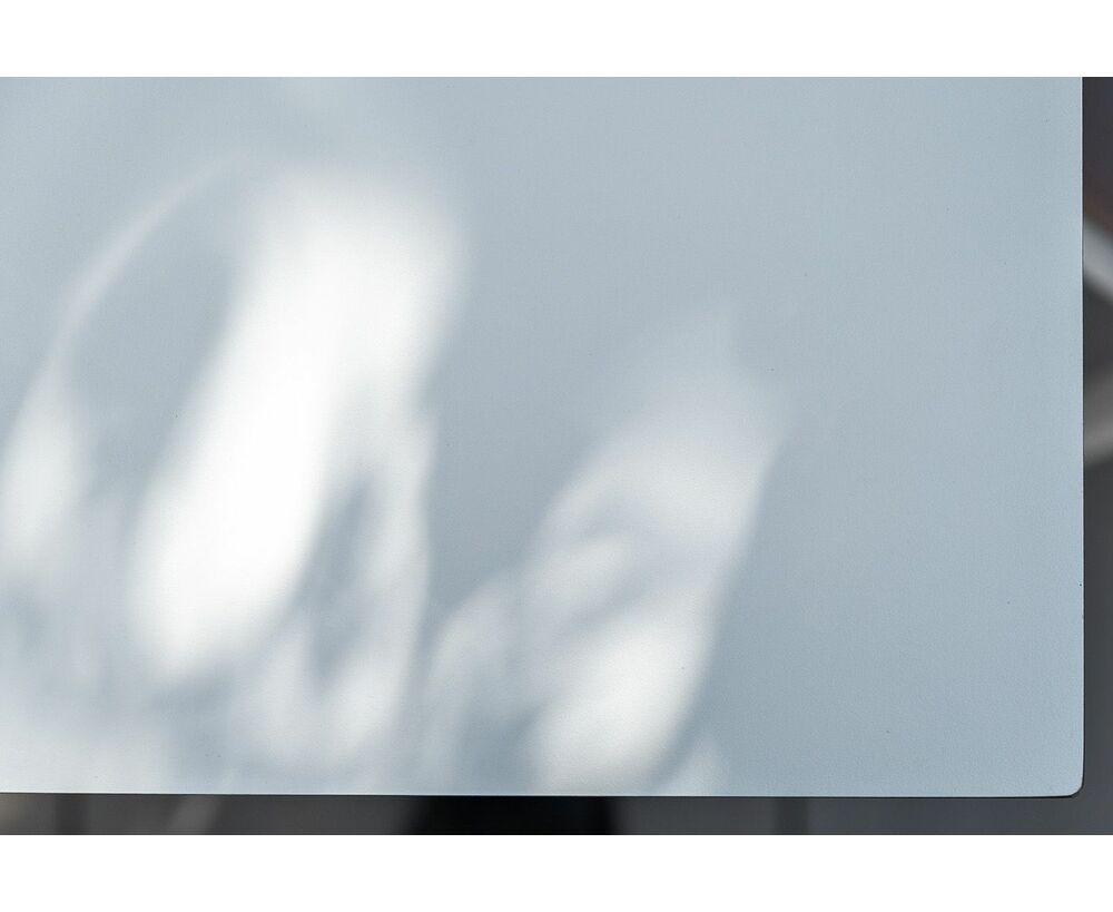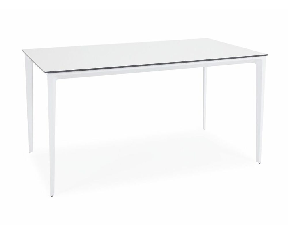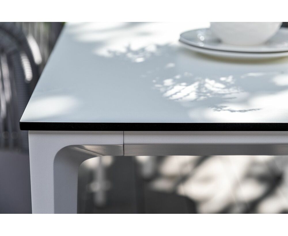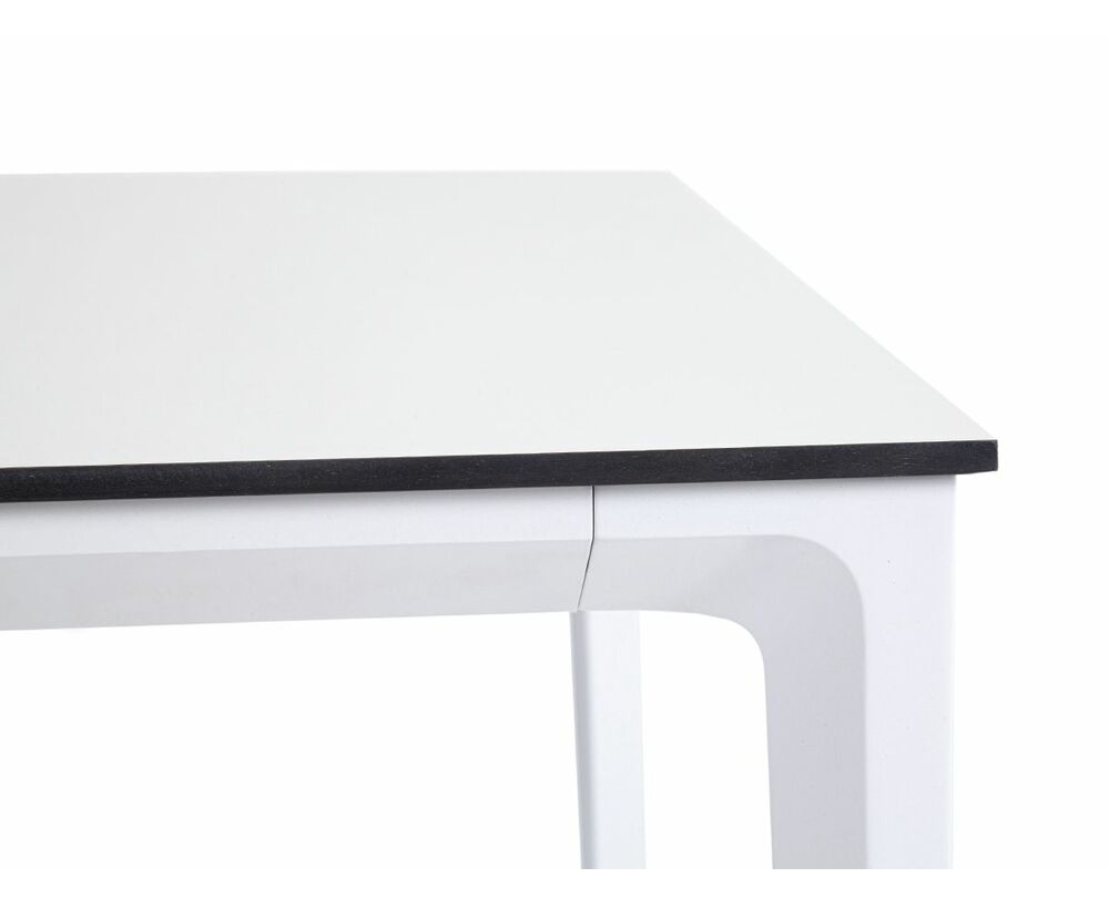 Столешница выполнена из современного высококачественного монолитного компакт-пластик HPL, толщиной 12 мм в молочном цветом. Материал устойчив к высоким температурам, попаданию влаги и может использоваться при любых погодных условиях. Подстолье изготовлено из крашеного алюминия белого цвета.