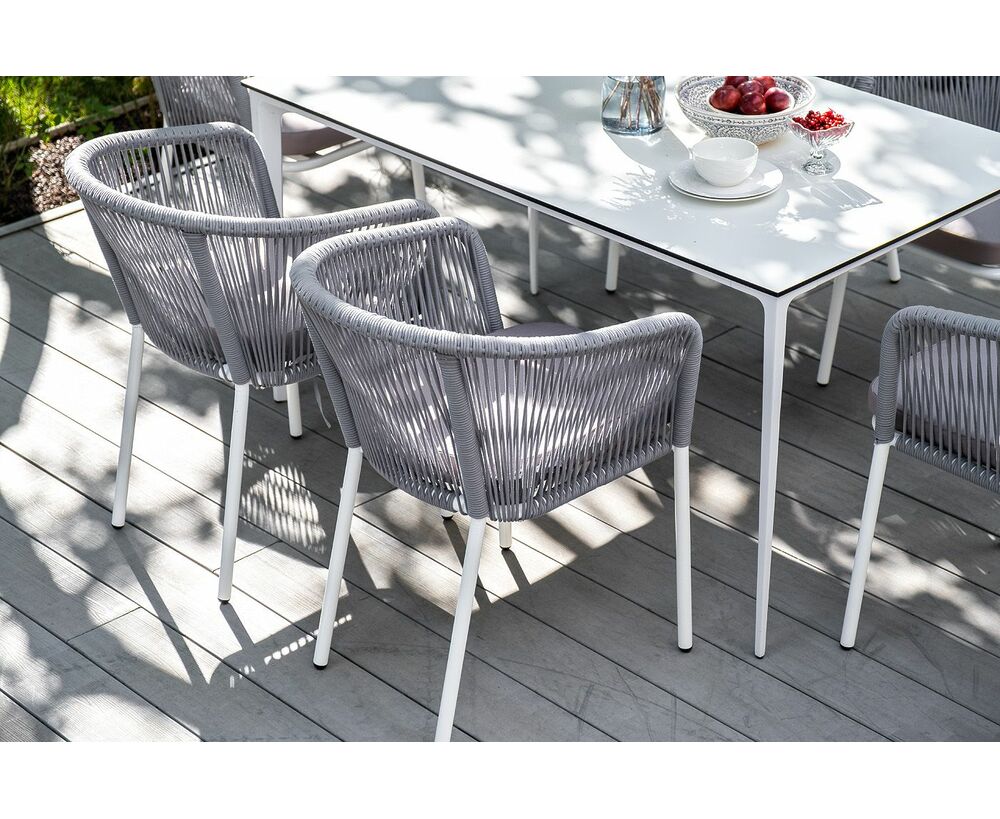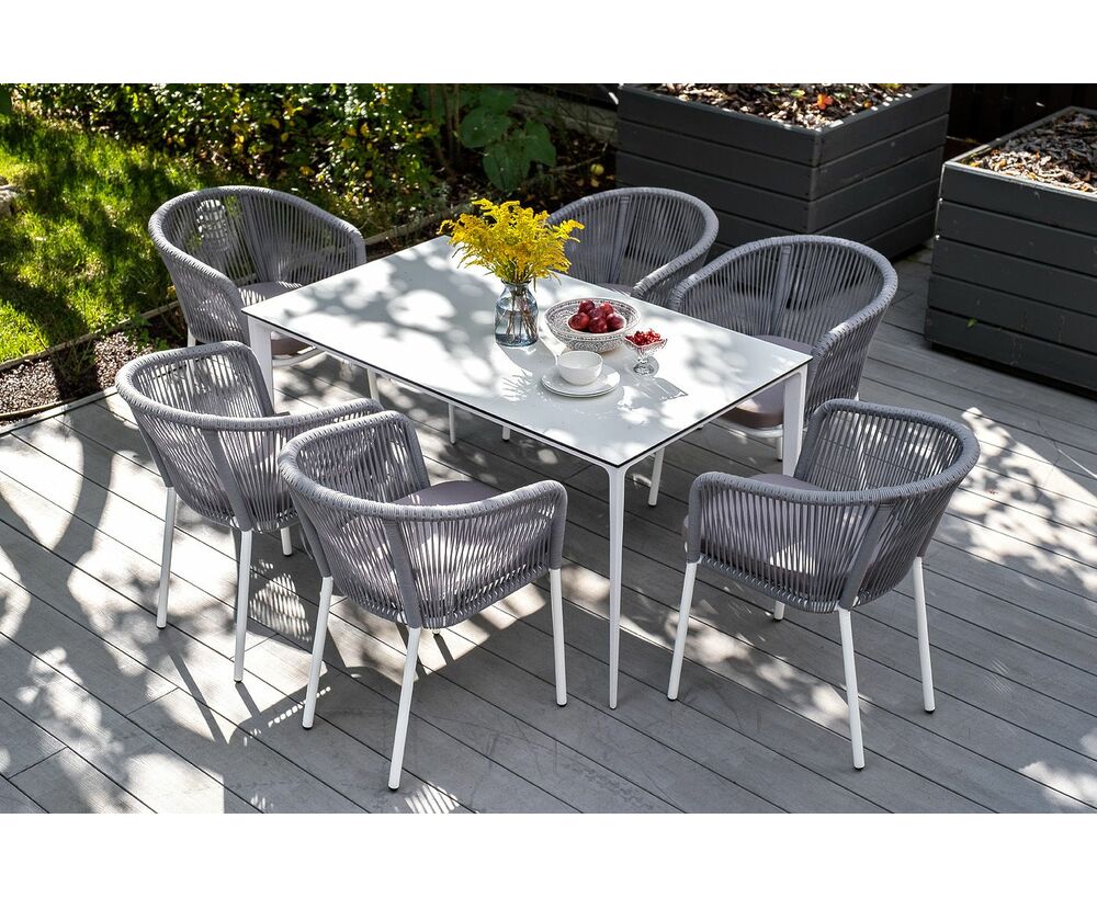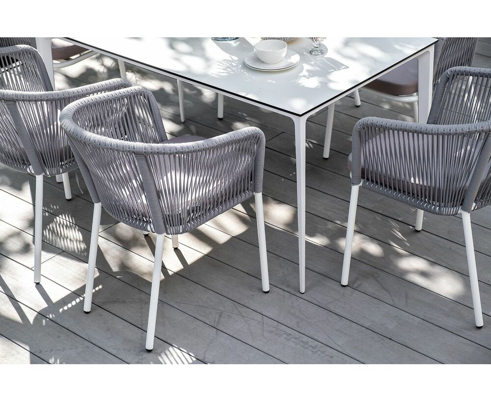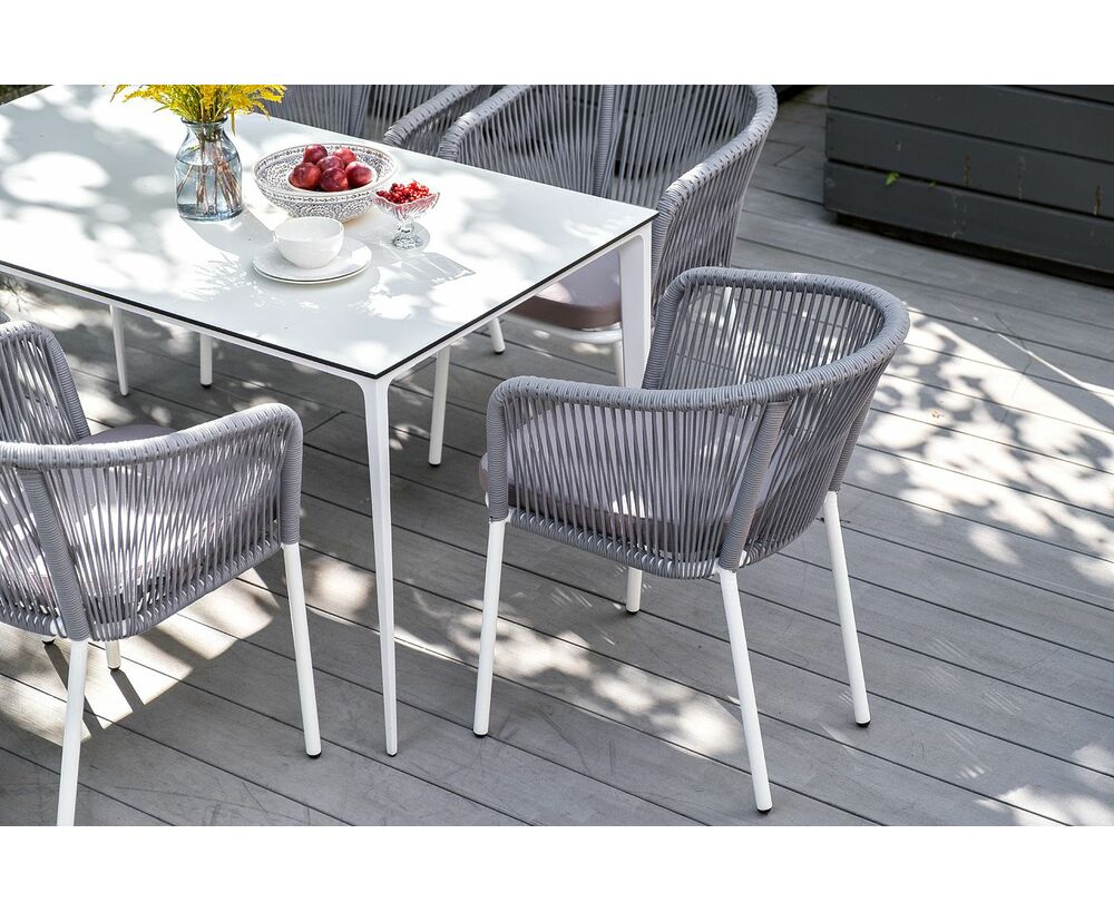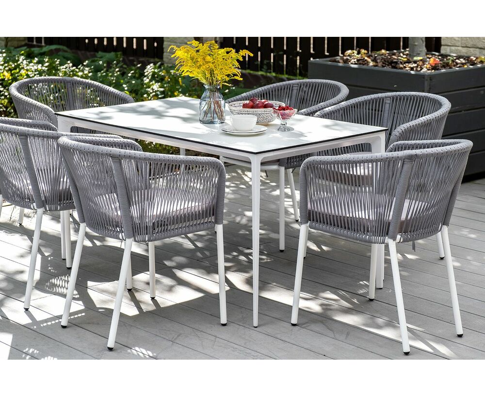 Столешница выполнена из современного высококачественного монолитного компакт-пластик HPL, толщиной 12 мм в молочном цветом. Материал устойчив к высоким температурам, попаданию влаги и может использоваться при любых погодных условиях. Подстолье изготовлено из крашеного алюминия белого цвета.