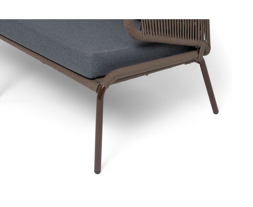 Диван имеет алюминиевый каркас, окрашенный порошковой краской в коричневый (RAL8016) цвет. Боковины каркаса и спинка вручную оплетены роупом - эластичными синтетическими лентами, изготовленными из высокопрочных полиэфирных волокон. Цвет оплетки – коричневый.