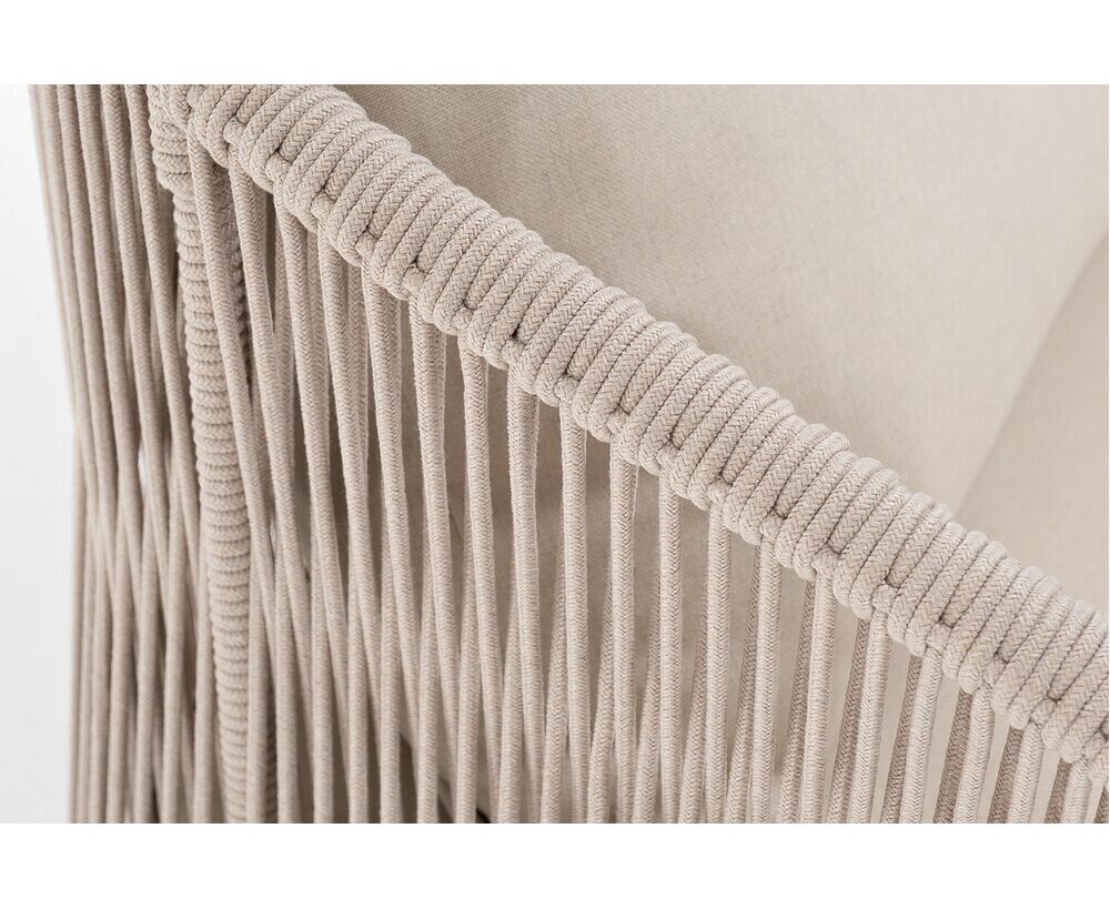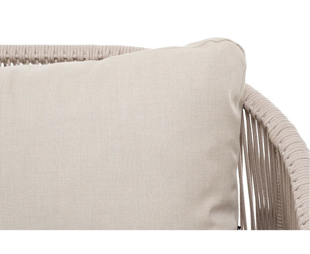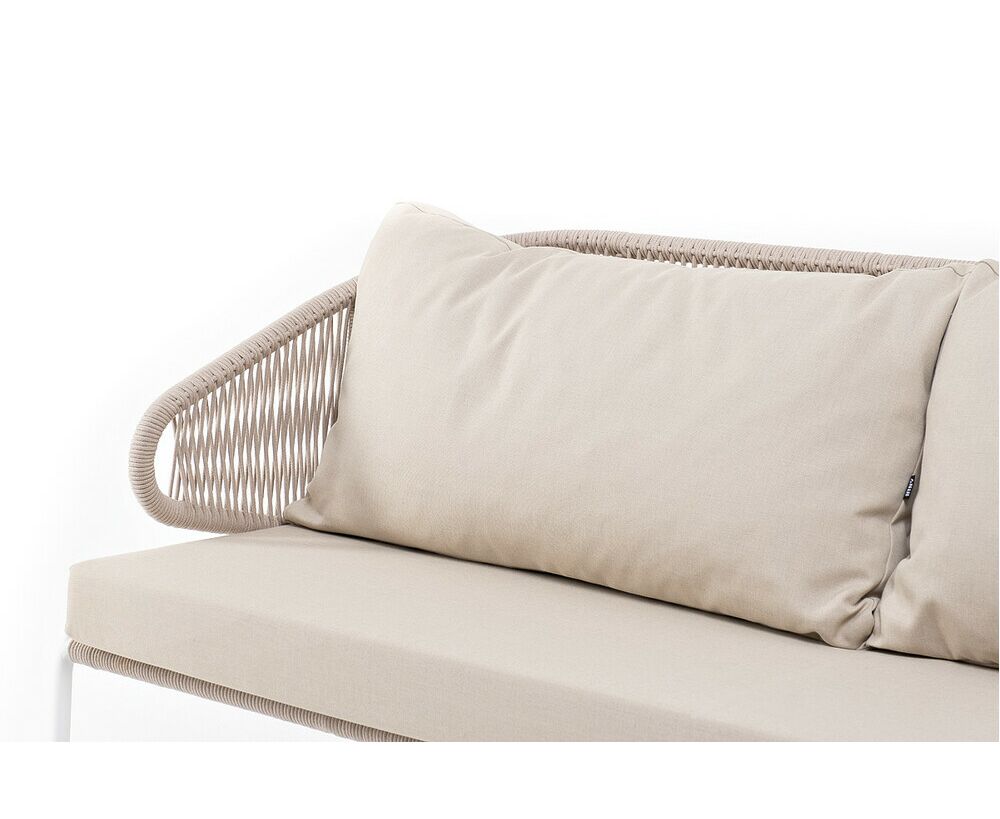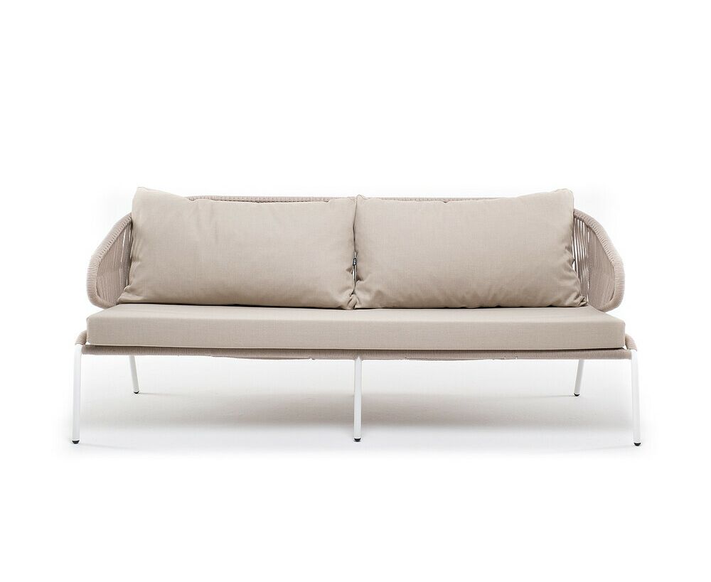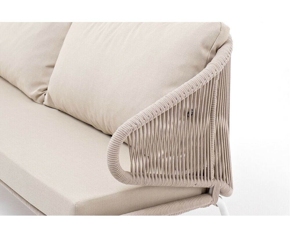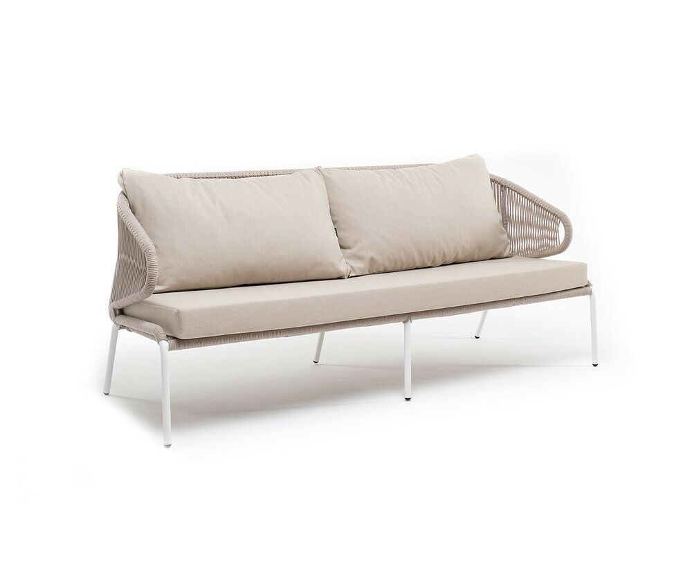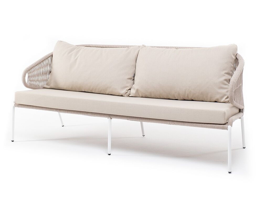 "Милан" диван 3-местный плетеный из роупа, каркас алюминий белый муар, роуп бежевый круглый, ткань бежевая 15052