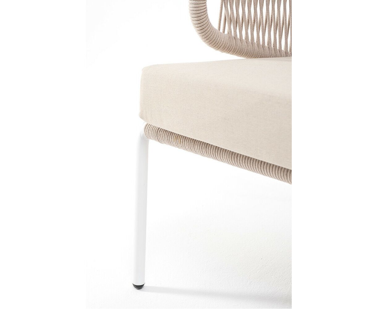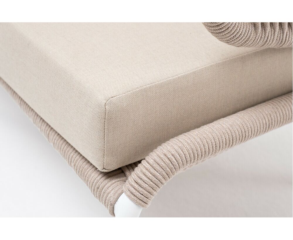 Диван имеет алюминиевый каркас, окрашенный порошковой краской в белый цвет. Боковины каркаса и спинка вручную оплетены роупом - эластичными синтетическими лентами, изготовленными из высокопрочных полиэфирных волокон. Цвет оплетки – бежевый.