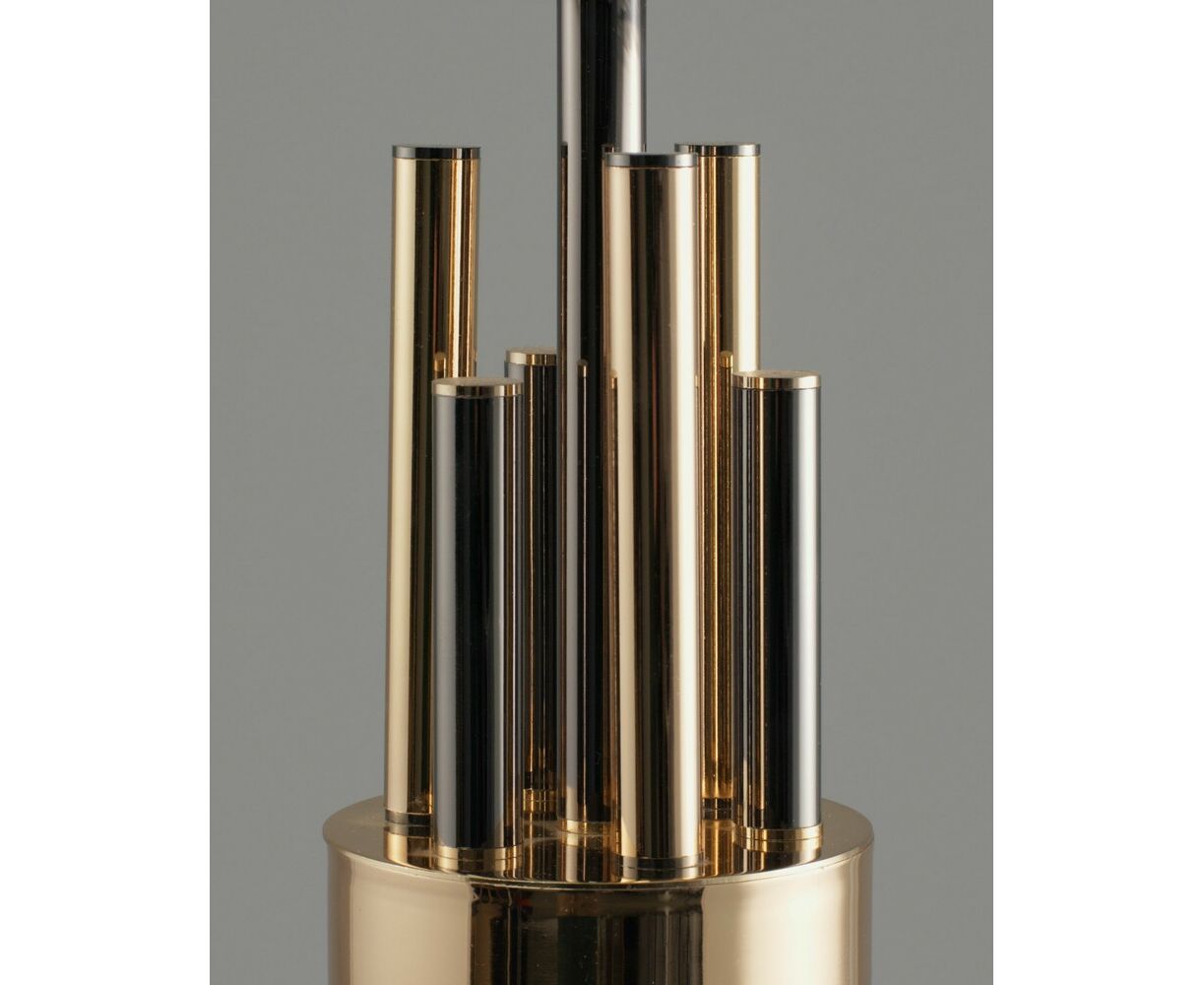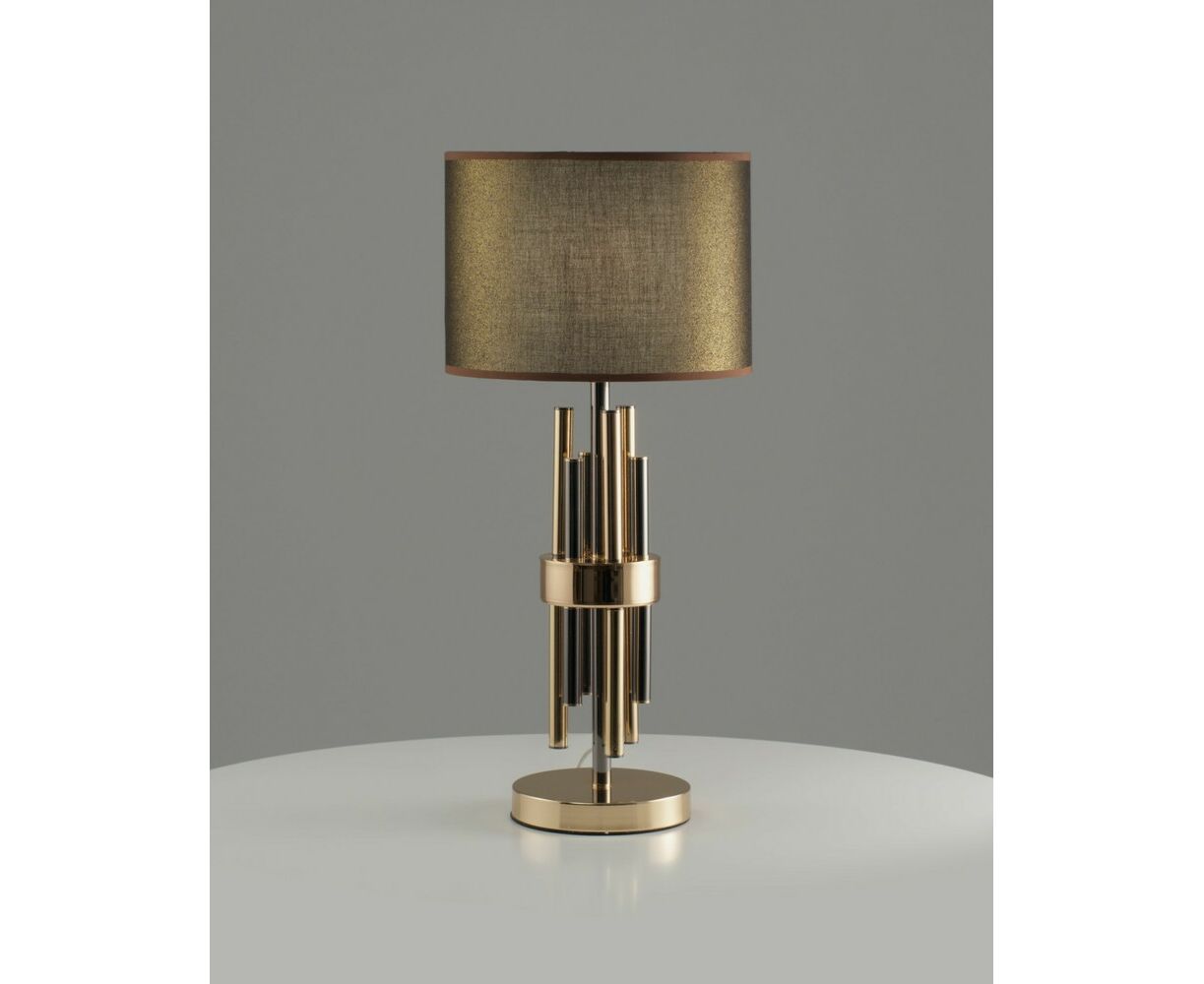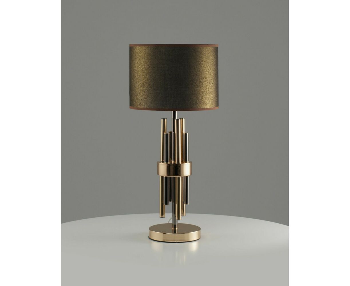 Настольная лампа из коллекции Trio в стиле модерн. Абажур из тёмной ткани приглушает свет и создаёт расслабленную и комфортную обстановку. Для освещения подходят лампы накаливания или LED с цоколем E27. Каркас выполнен из металла и декорирован цилиндрическими стержнями золотого и тёмного цвета, которые придают объём и элегантный вид всей конструкции. Отличный вариант для спальни, гостиной и рабочего кабинета.