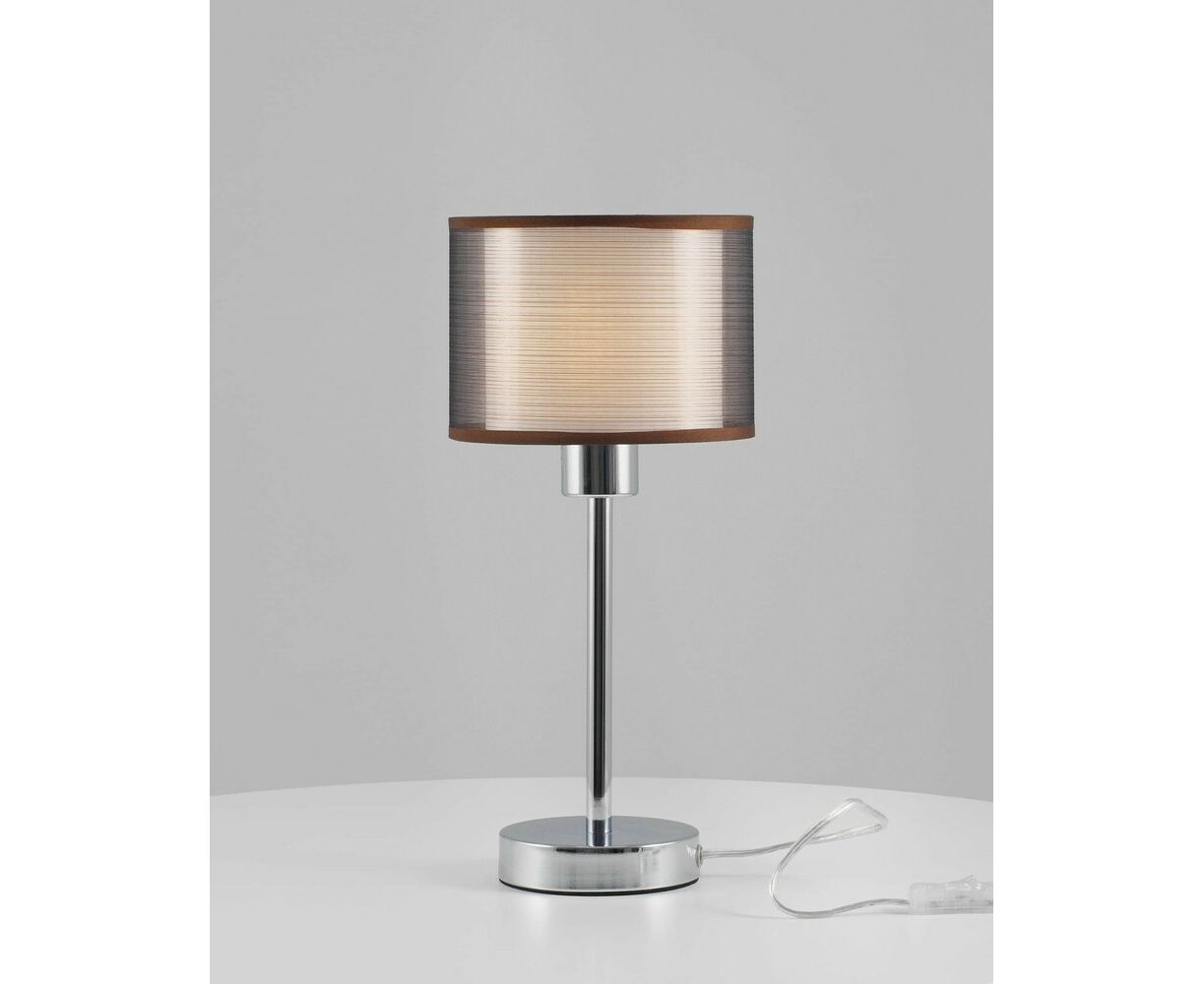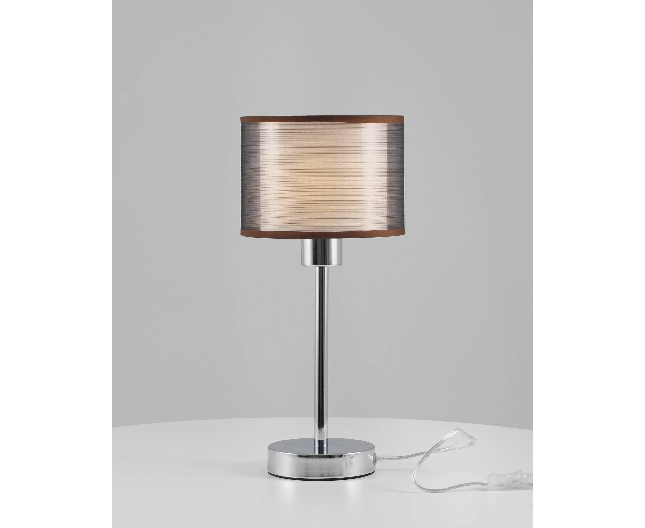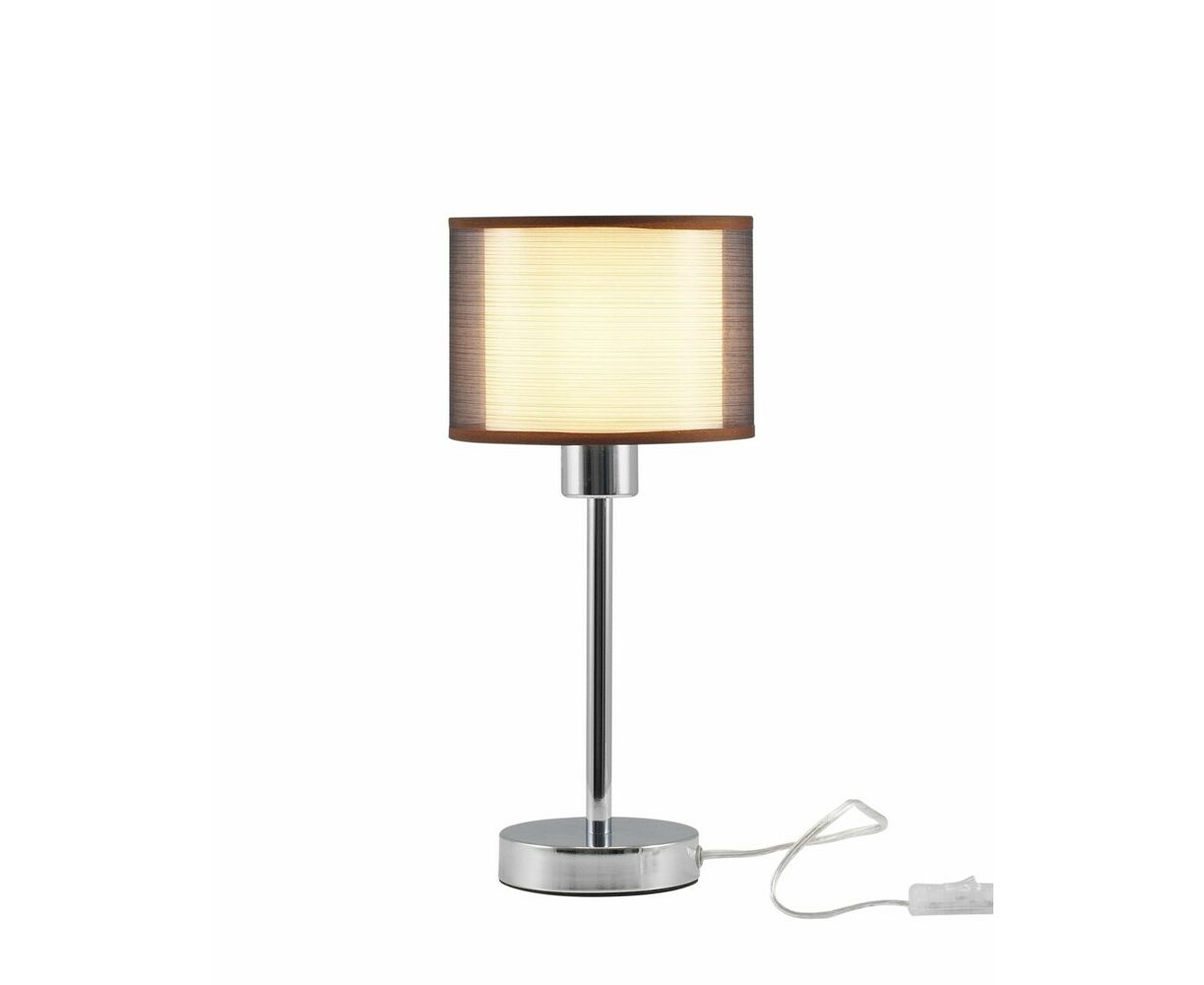 Современный настольный светильник из серии Room. Абажур имеет два слоя ткани, внутренняя светлая ткань мягко рассеивает свет, а внешняя тёмная приглушает её для комфортного освещения. Корпус и устойчивое основание выполнены из металла цвета хром. Лаконичный дизайн и спокойная цветовая гамма настольной лампы поможет украсить любой интерьер в современном стиле.