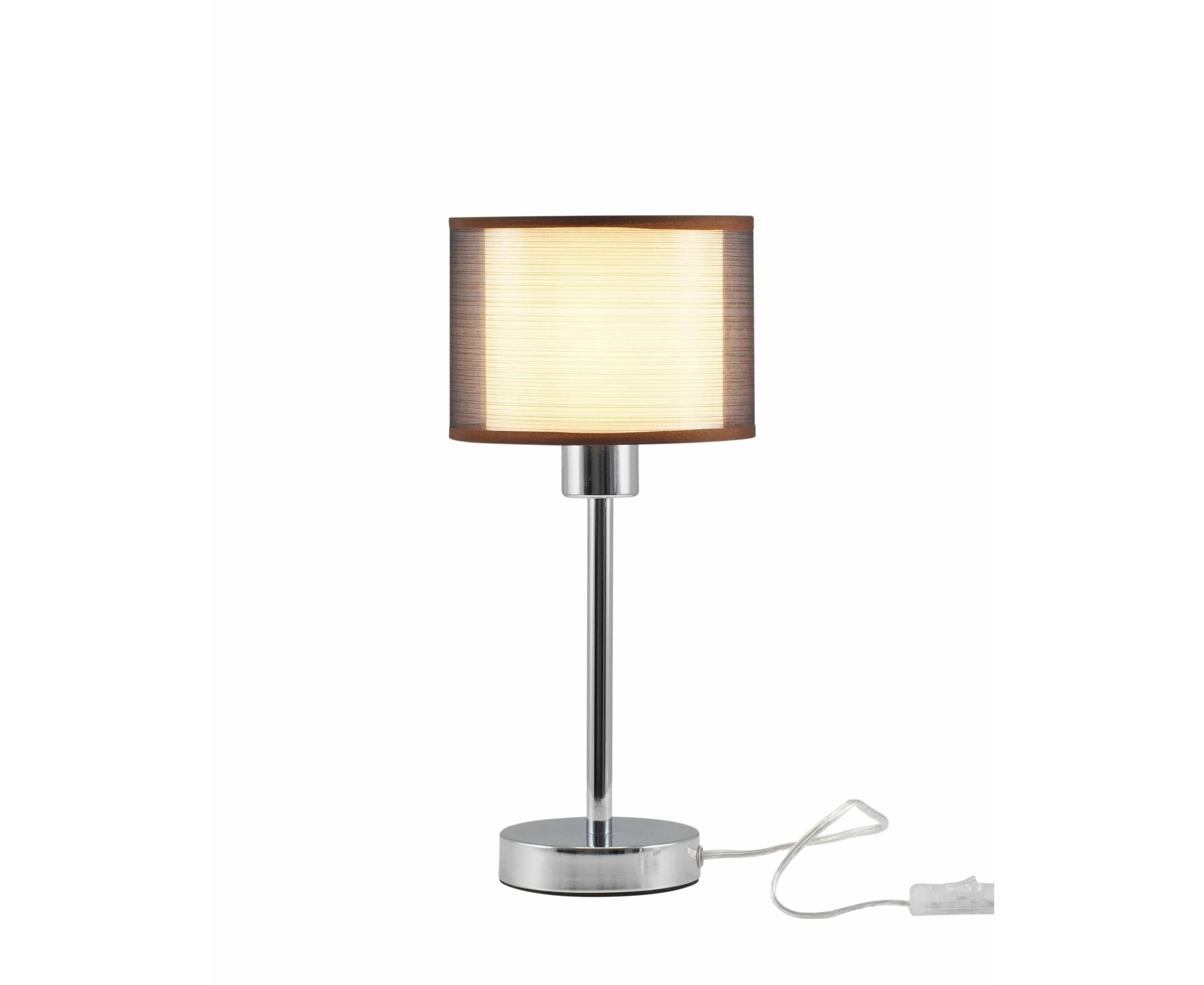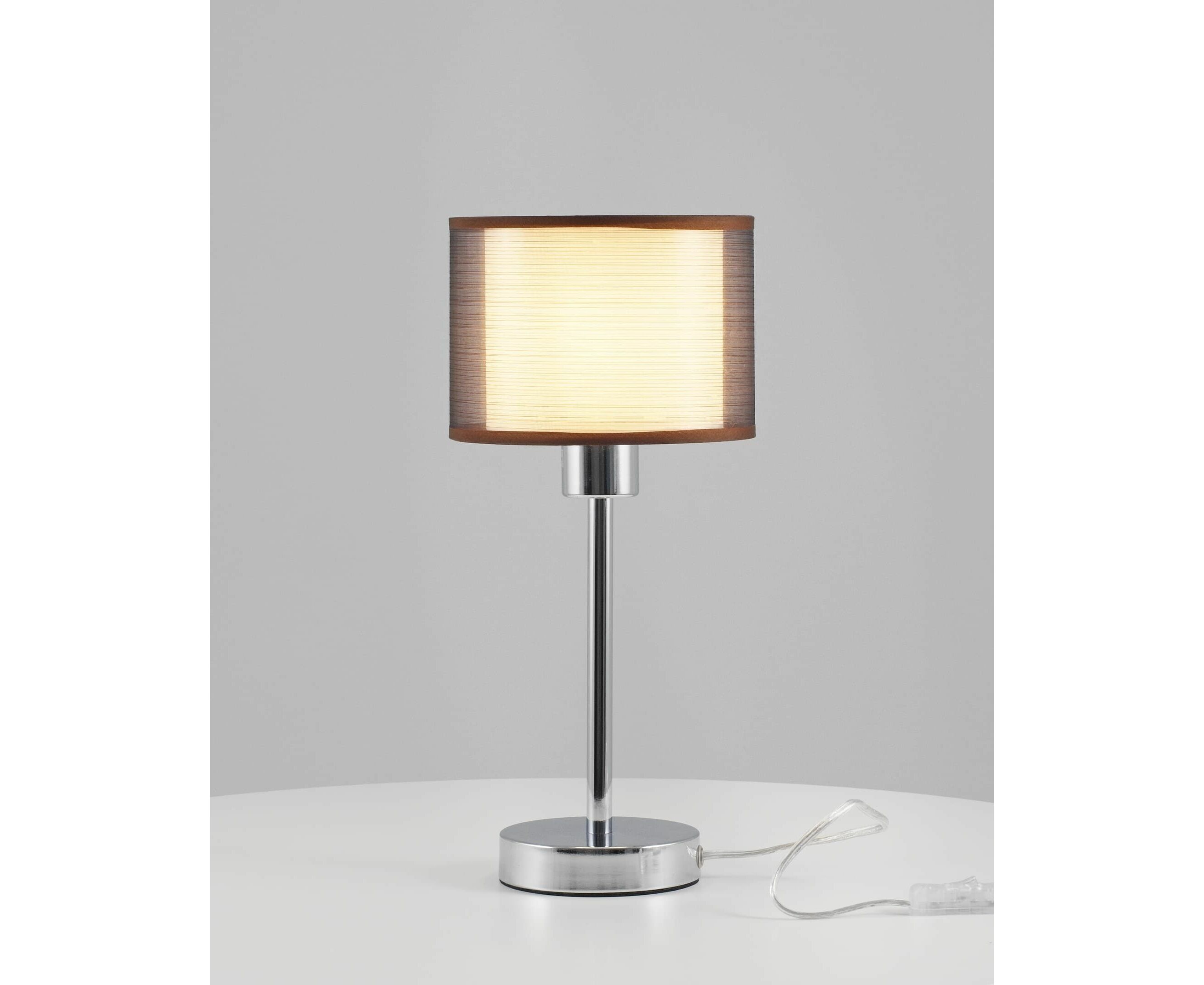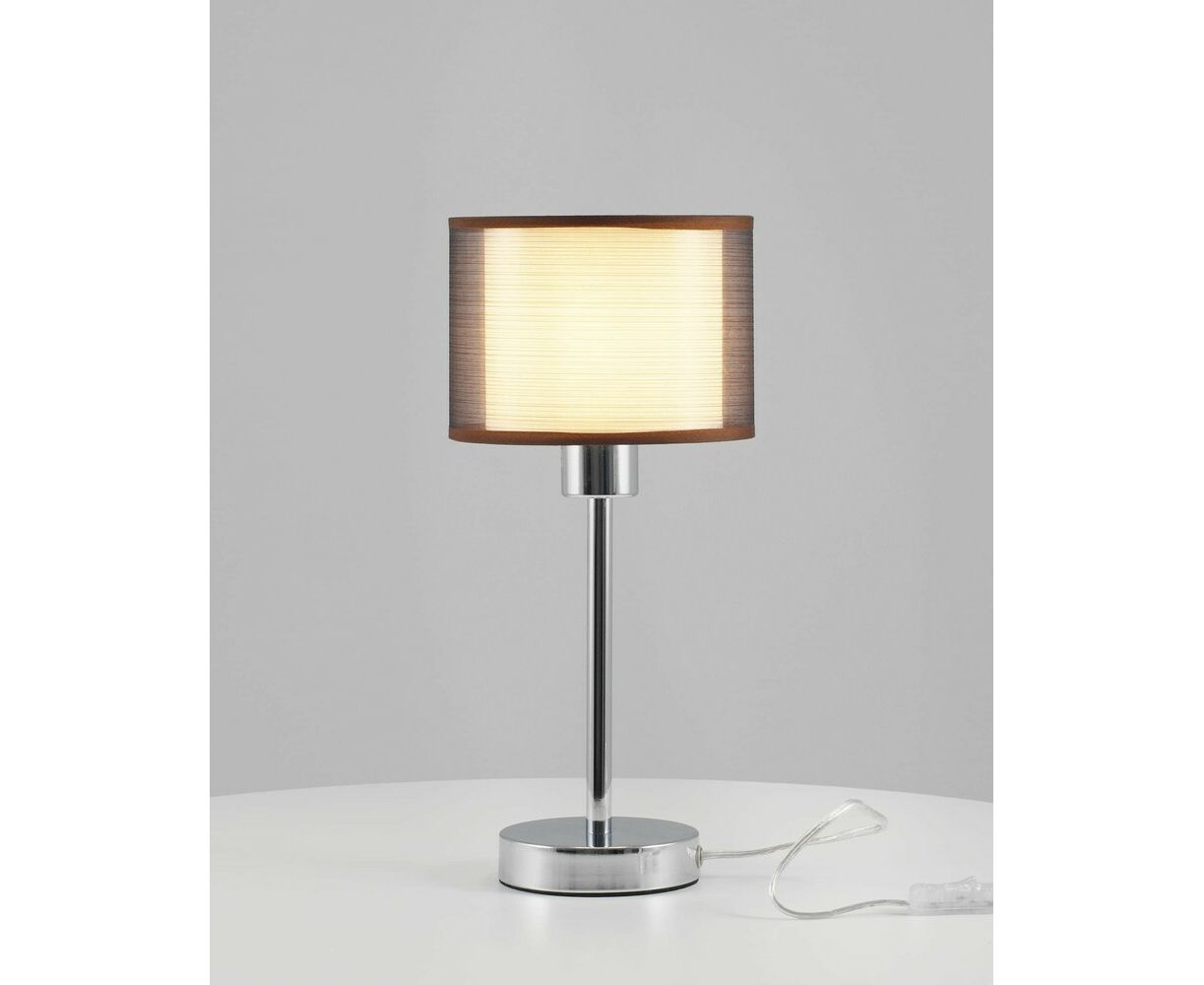 Современный настольный светильник из серии Room. Абажур имеет два слоя ткани, внутренняя светлая ткань мягко рассеивает свет, а внешняя тёмная приглушает её для комфортного освещения. Корпус и устойчивое основание выполнены из металла цвета хром. Лаконичный дизайн и спокойная цветовая гамма настольной лампы поможет украсить любой интерьер в современном стиле.
