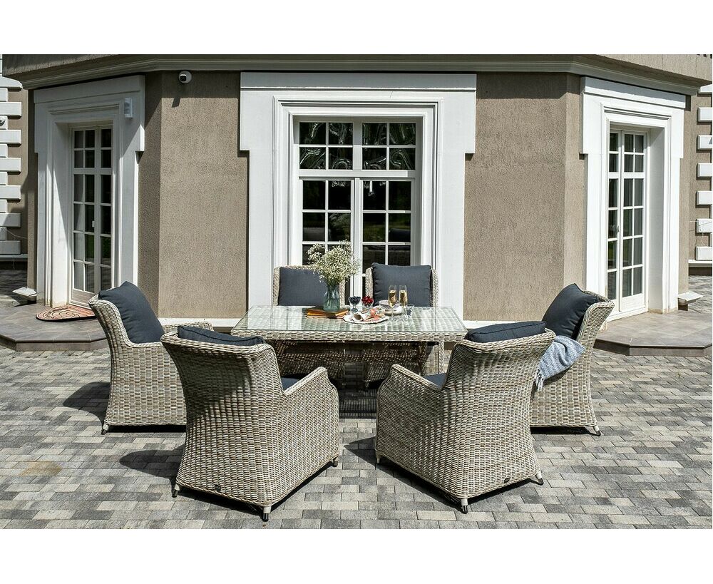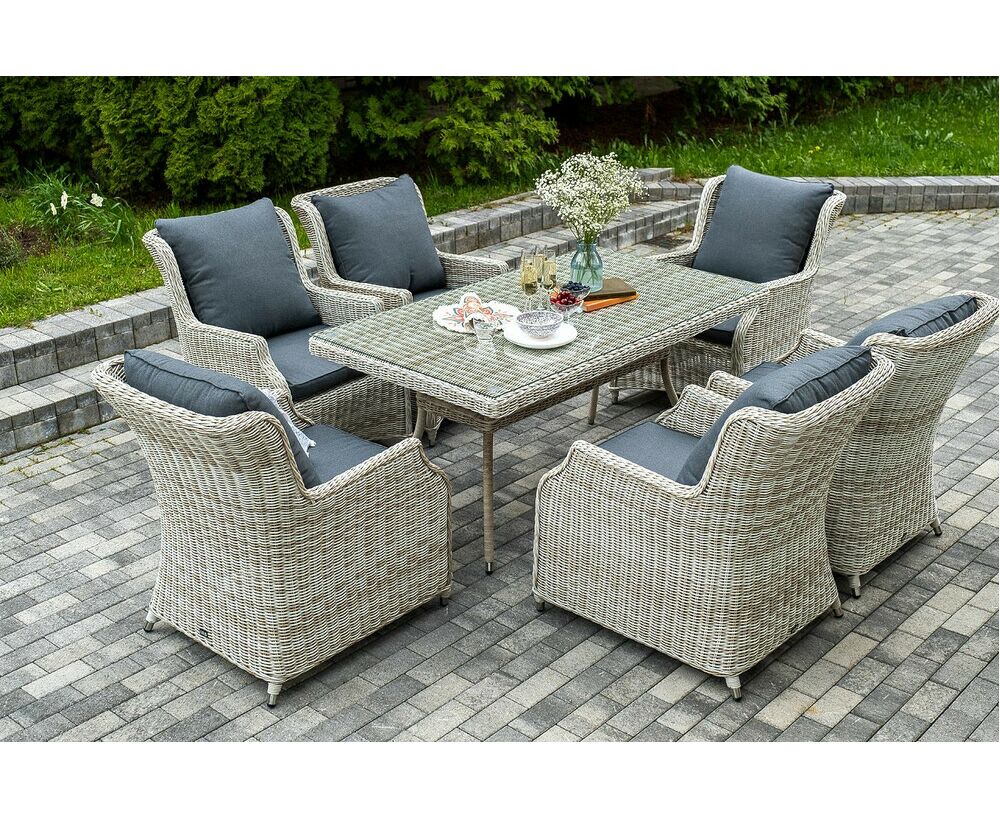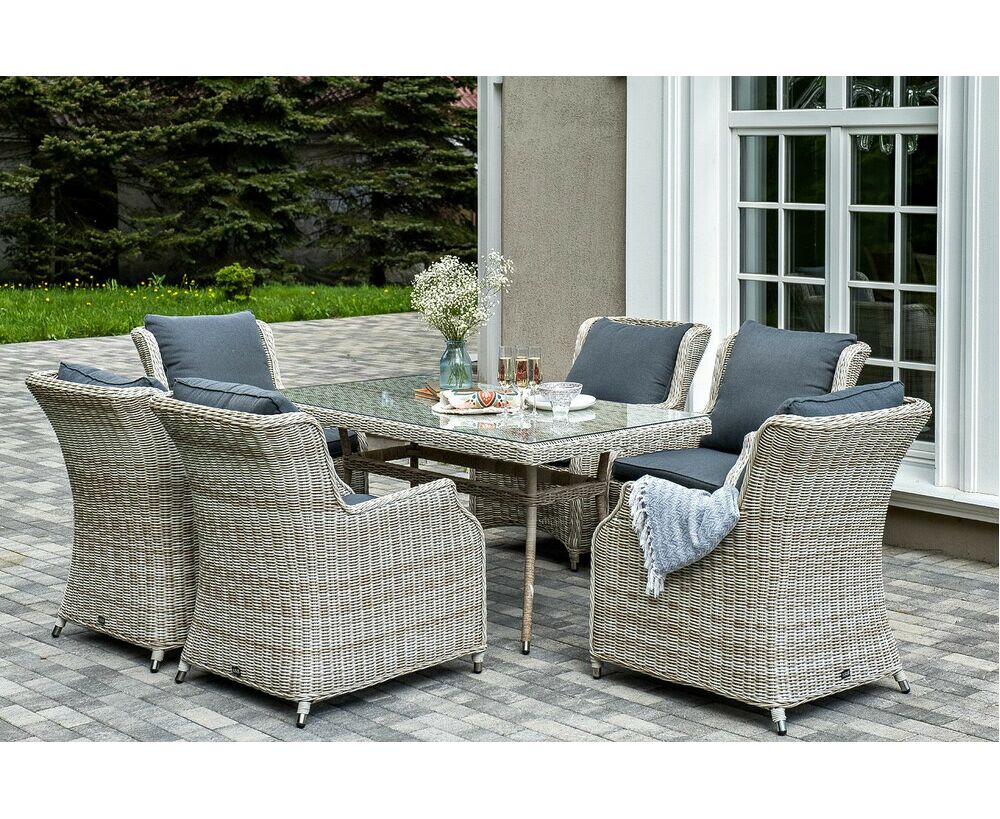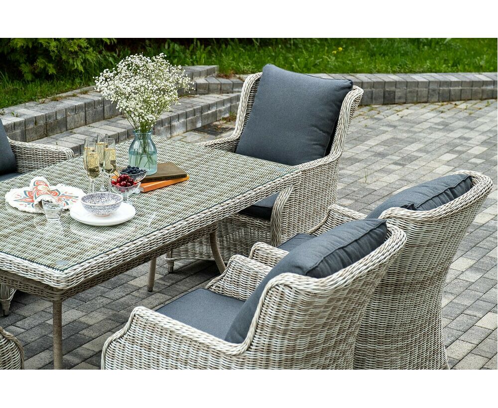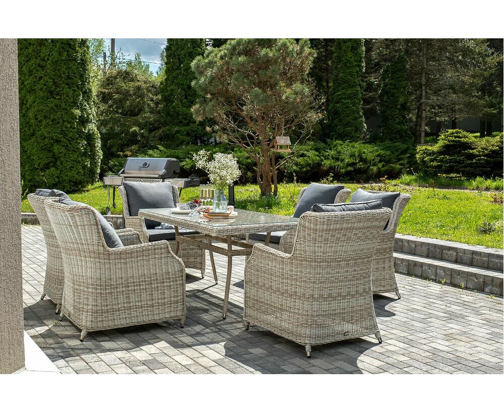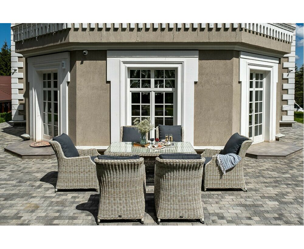 Столешница укомплектована ударопрочным стеклом, толщиной 5 мм. Данное стекло крепится к столу при помощи четырех вакуумных силиконовых присосок и поставляется в собранном виде. Плетеные стулья для удобства использования оснащены подлокотниками и подушками серого цвета на спинках и сидениях. Ткань обработана влагоотталкивающей пропиткой.