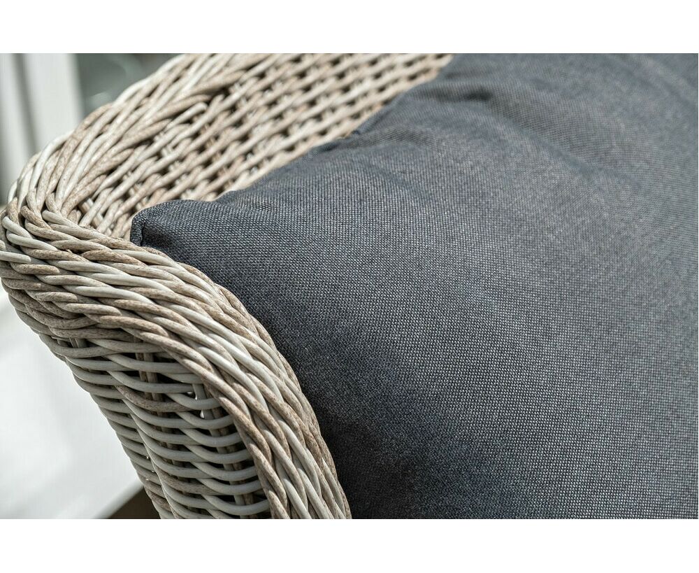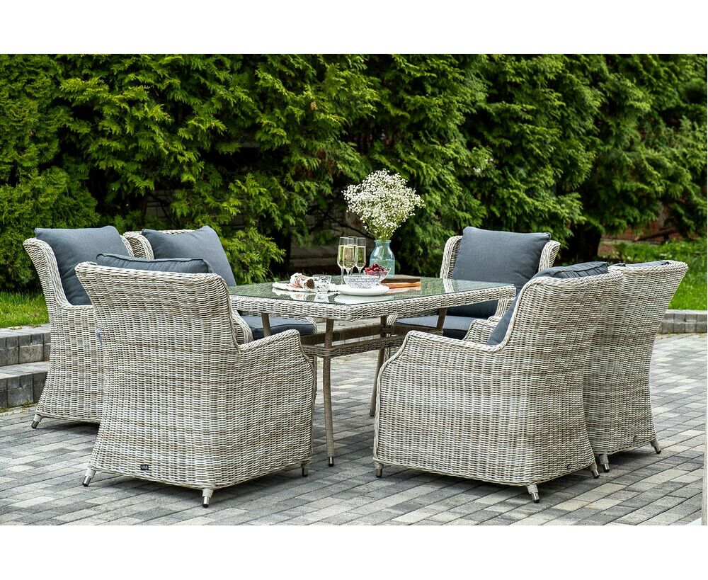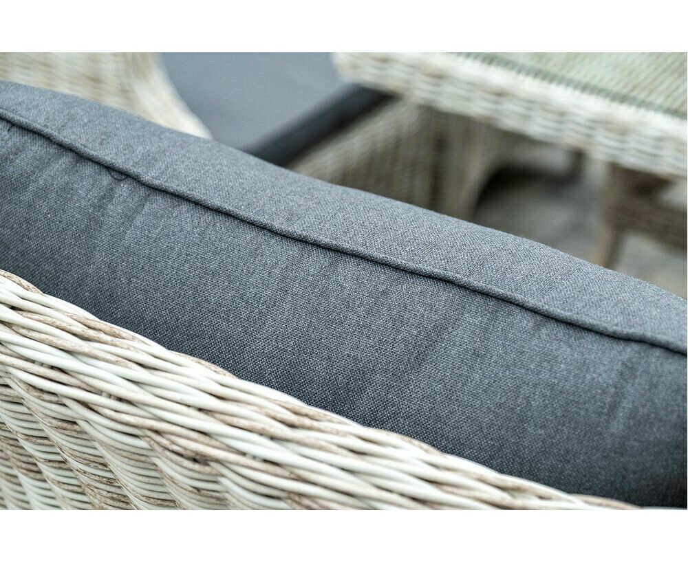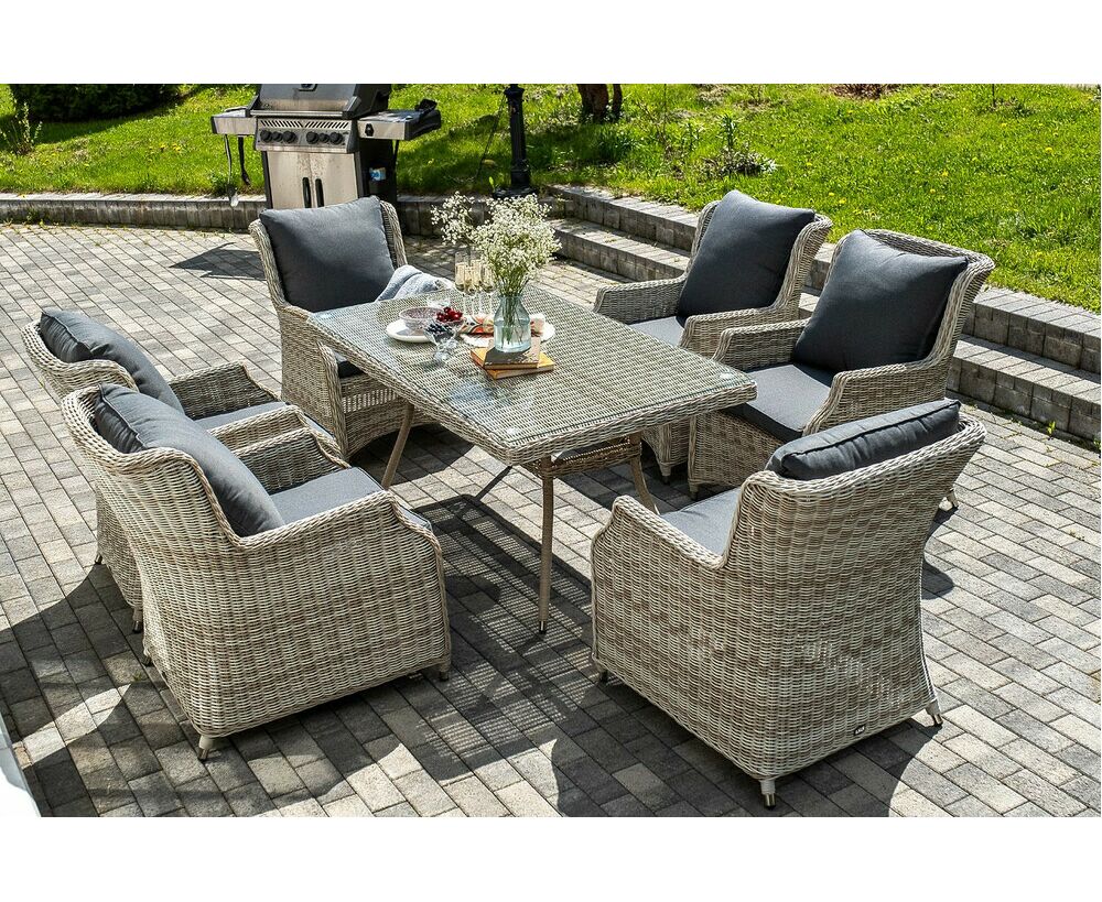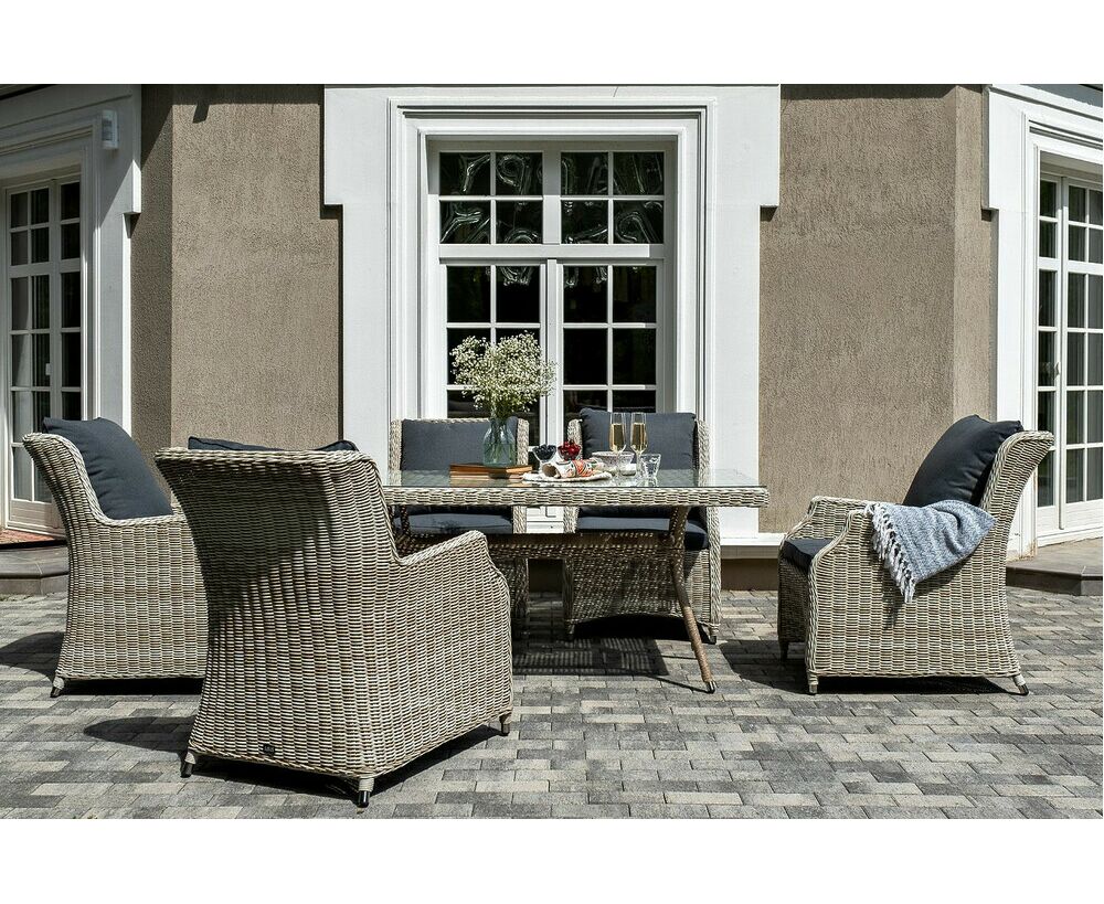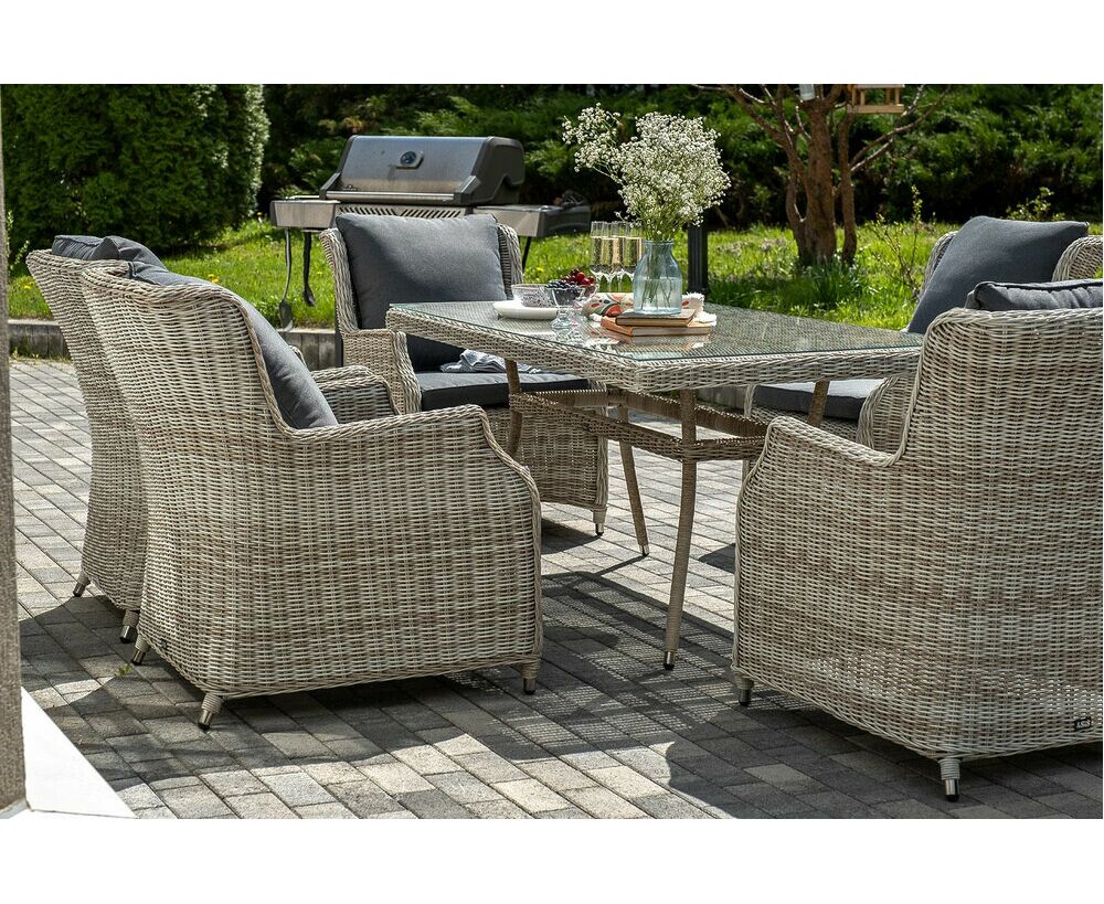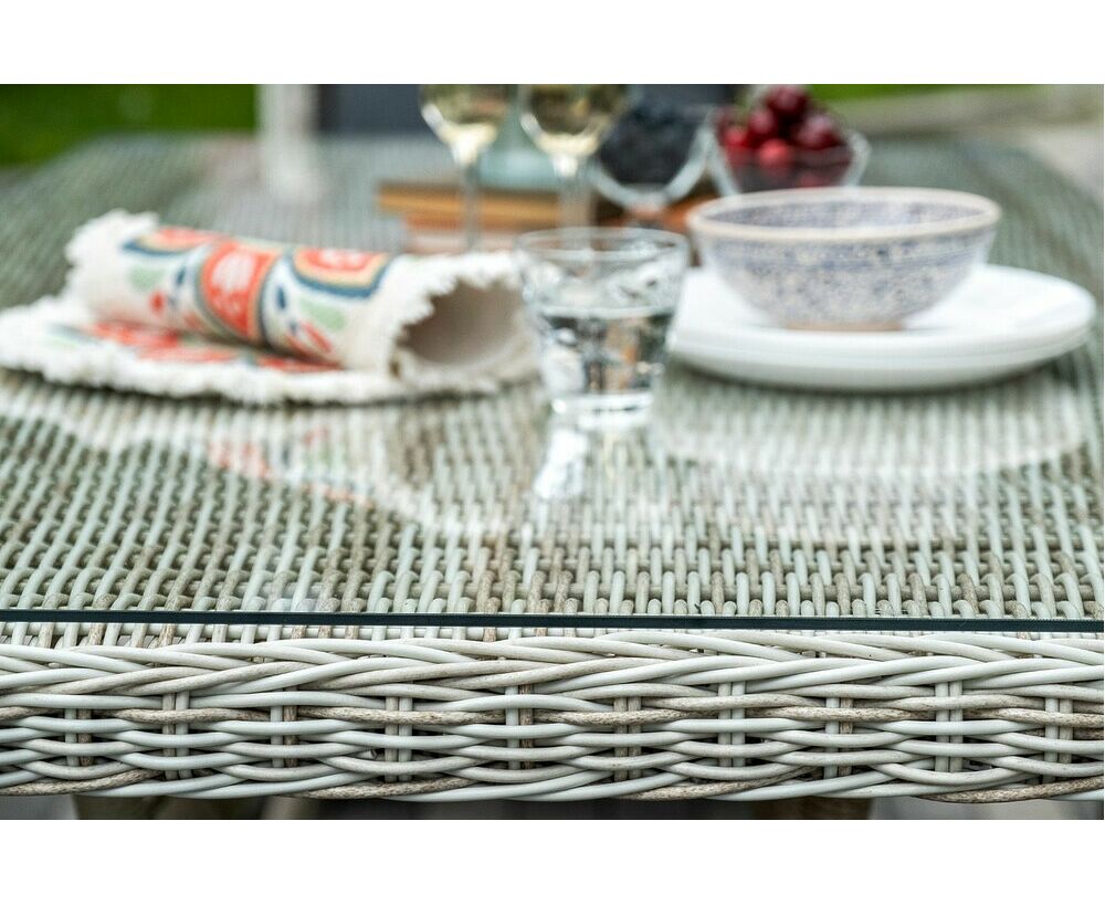 Столешница укомплектована ударопрочным стеклом, толщиной 5 мм. Данное стекло крепится к столу при помощи четырех вакуумных силиконовых присосок и поставляется в собранном виде. Плетеные стулья для удобства использования оснащены подлокотниками и подушками серого цвета на спинках и сидениях. Ткань обработана влагоотталкивающей пропиткой.
