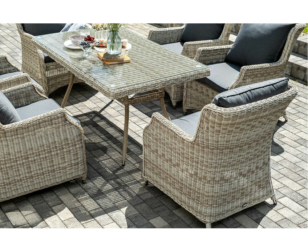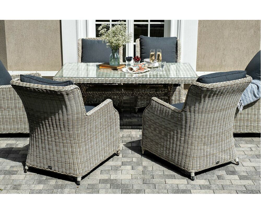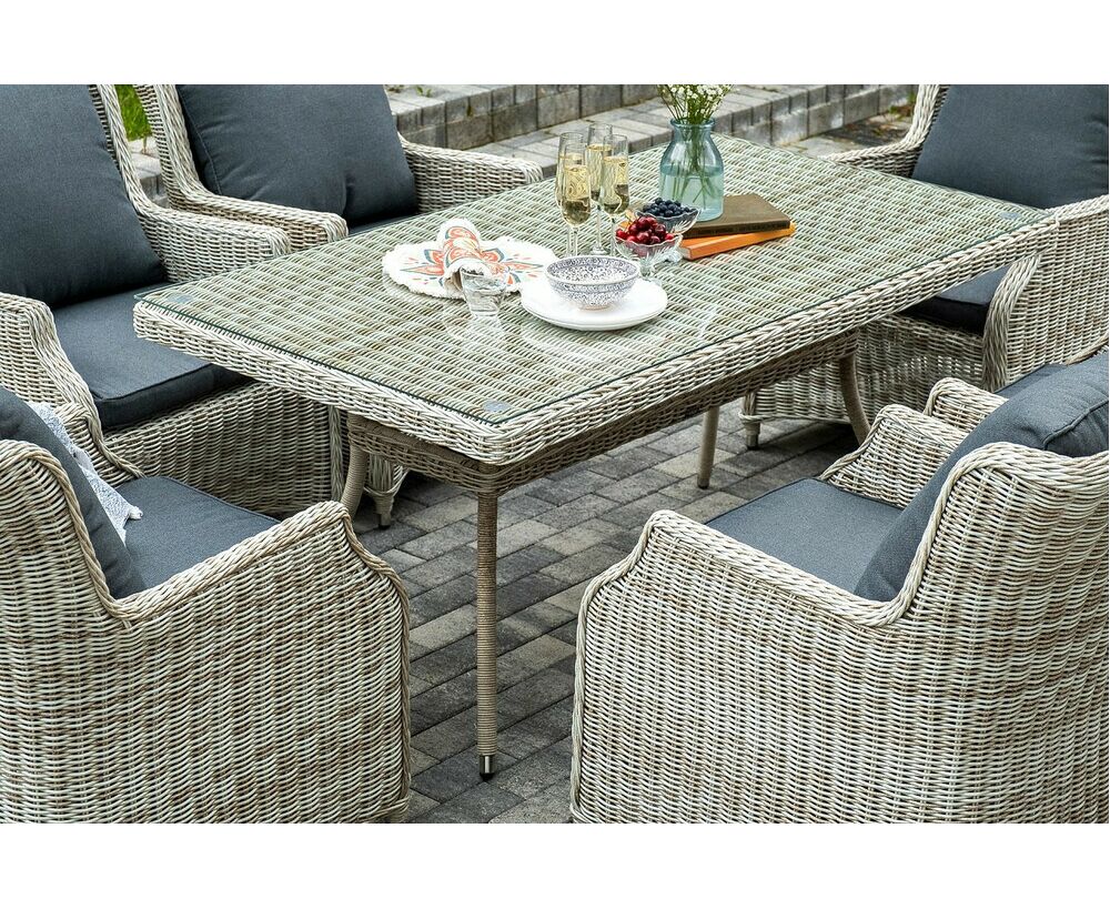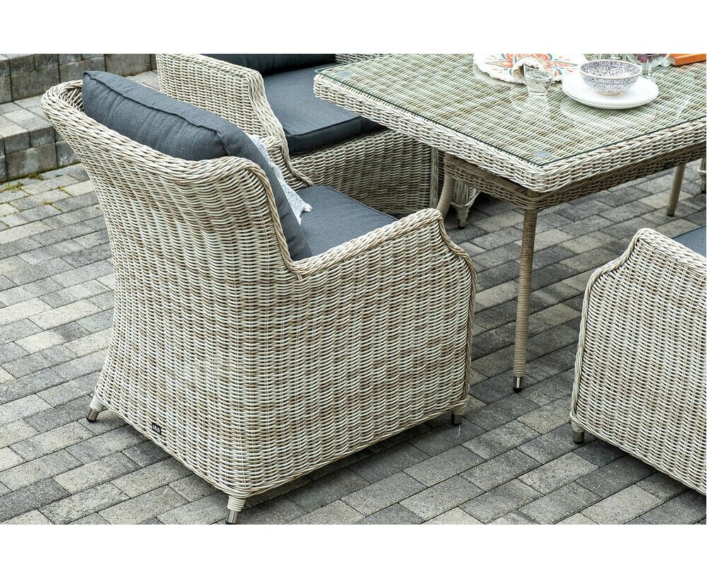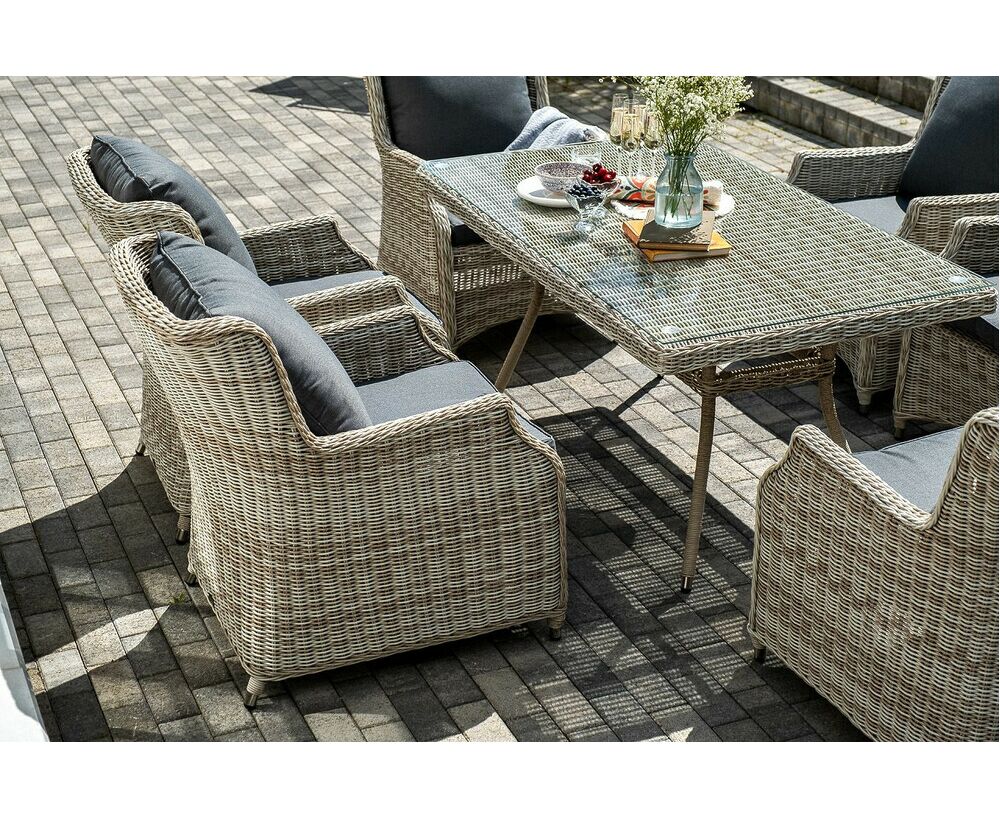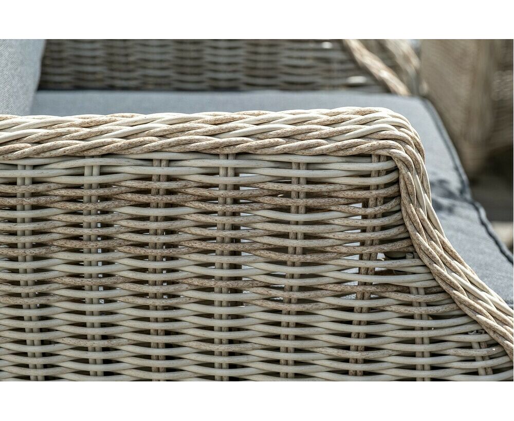 Столешница укомплектована ударопрочным стеклом, толщиной 5 мм. Данное стекло крепится к столу при помощи четырех вакуумных силиконовых присосок и поставляется в собранном виде. Плетеные стулья для удобства использования оснащены подлокотниками и подушками серого цвета на спинках и сидениях. Ткань обработана влагоотталкивающей пропиткой.