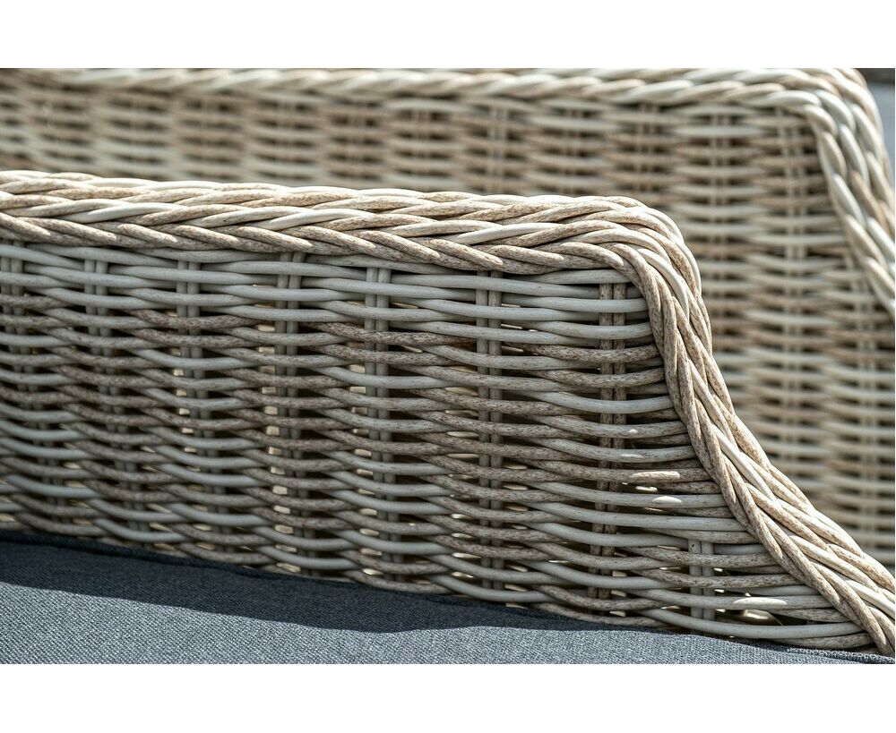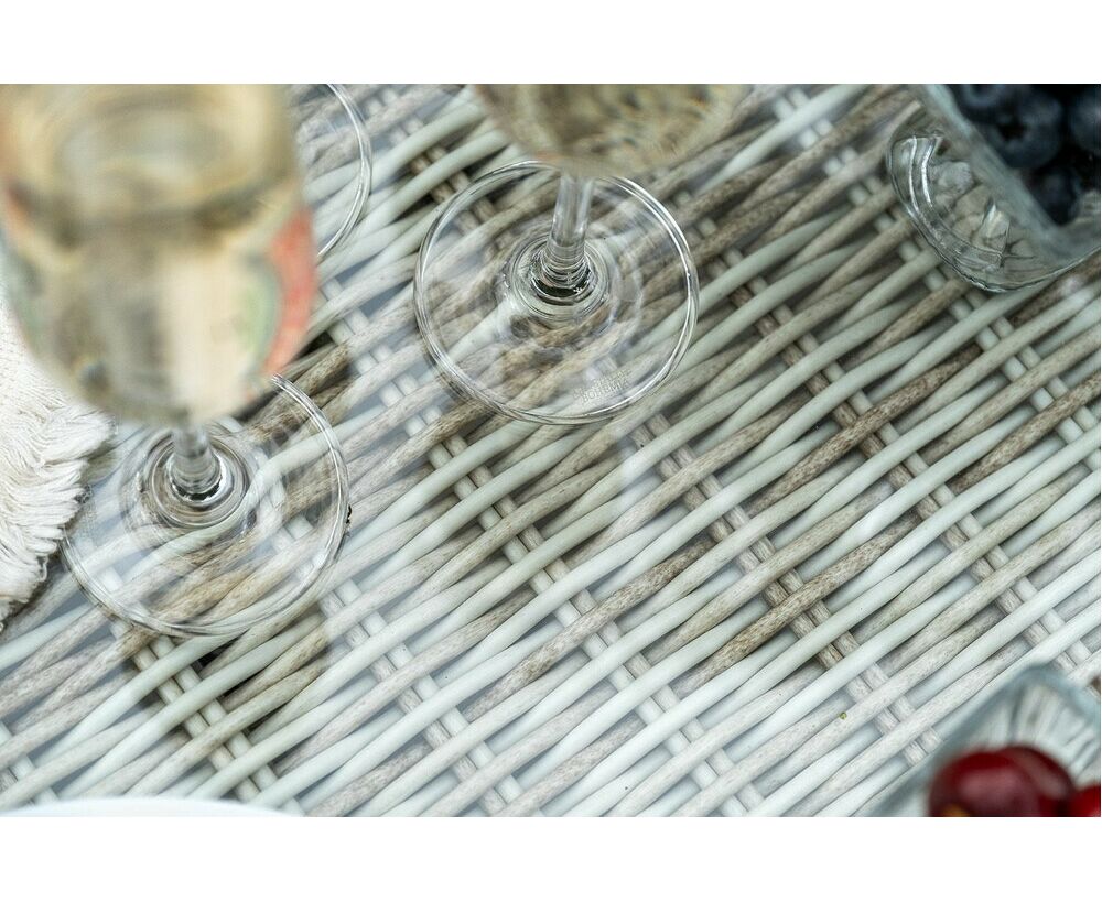 Каркас всех изделий выполнен из легкого и долговечного алюминия, оплетенного вручную круглым искусственным ротангом натурального бежевом цвета.