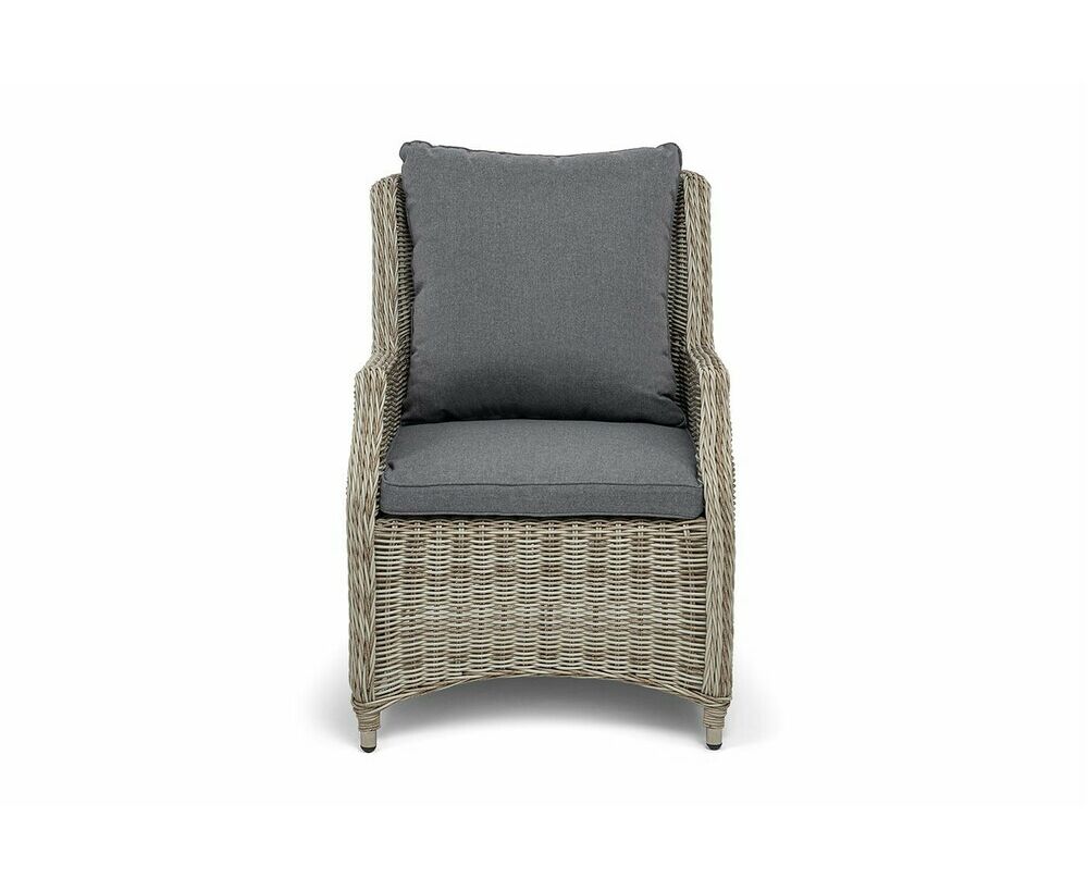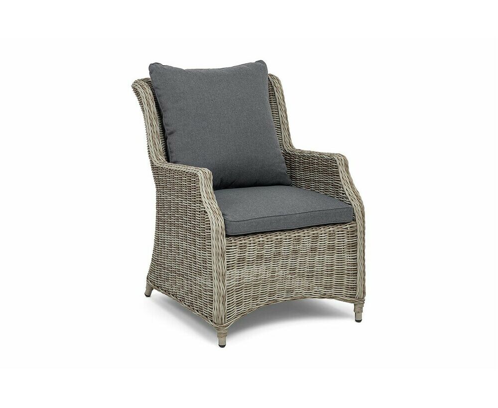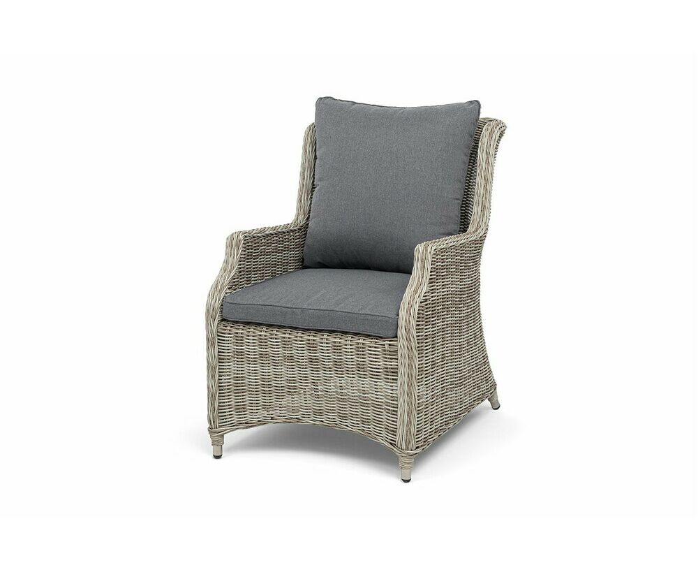 Плетенный стул дополняют мягкие подушки. Они выполнены в сером оттенке. Пошиты изделия из плотного полиэстера 230гр/м2. Ткань предварительно обрабатывается влагоотталкивающей пропиткой.