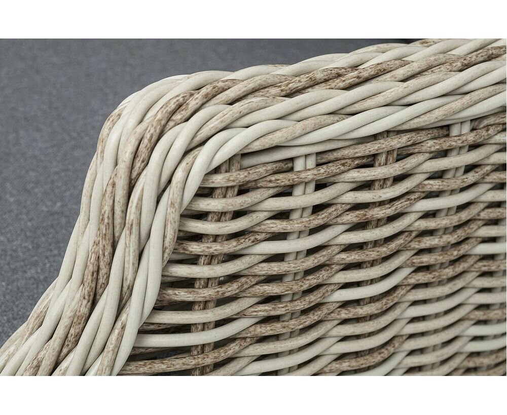 Спинка и подлокотники имеют планые линии, благодаря своим закругленным формам. Каркас мебели сделан из алюминия. Присутствует ручное круглое плетение, при изготовлении которого используется искусственный ротанг. Представлено в бежевом цвете.