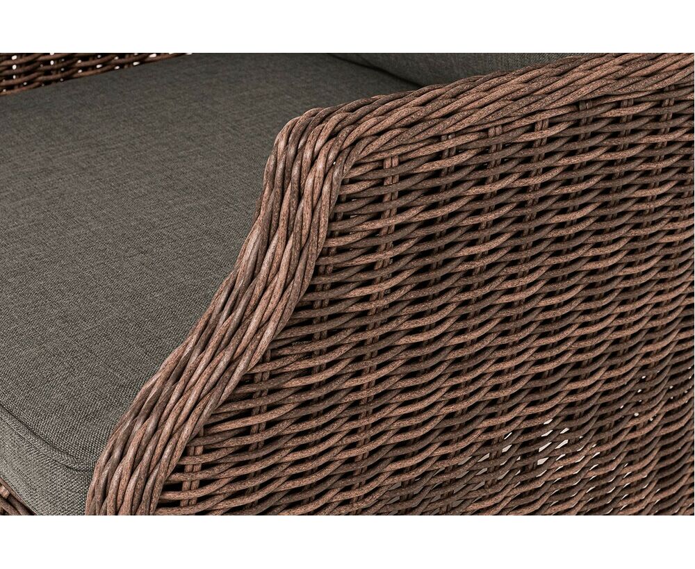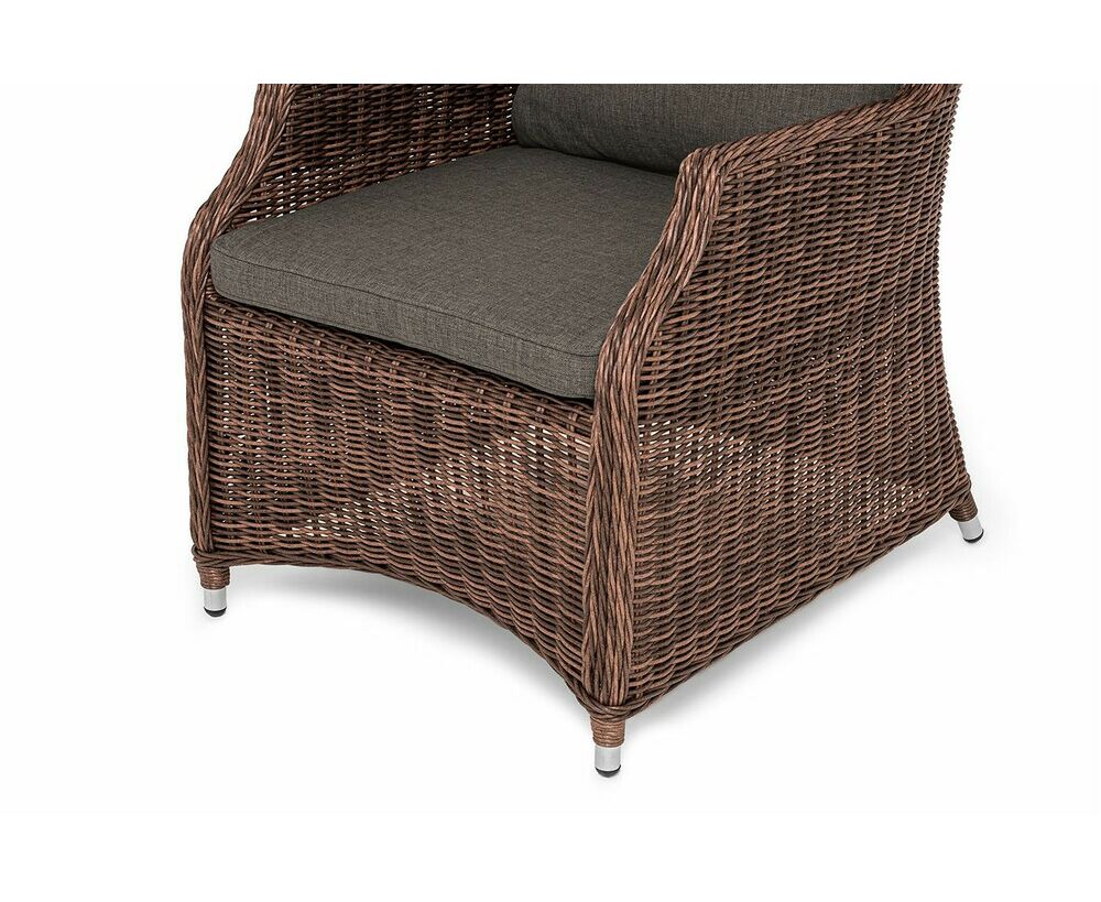 Спинка и подлокотники имеют планые линии, благодаря своим закругленным формам. Каркас мебели сделан из алюминия. Присутствует ручное круглое плетение, при изготовлении которого используется искусственный ротанг. Представлено в коричневом цвете.