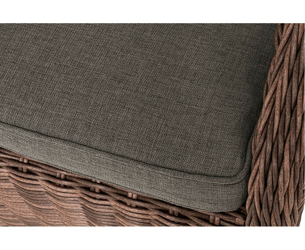 Плетенный стул дополняют мягкие подушки. Они выполнены в серо-коричневом оттенке. Пошиты изделия из плотного полиэстера 230гр/м2. Ткань предварительно обрабатывается влагоотталкивающей пропиткой.