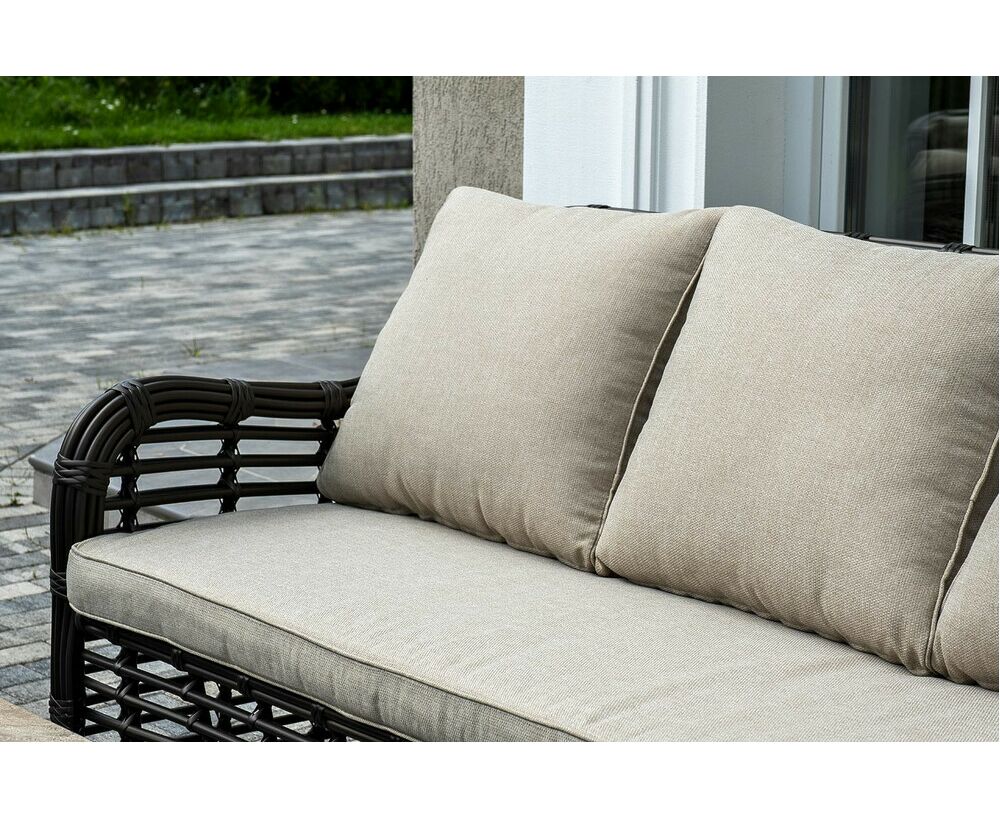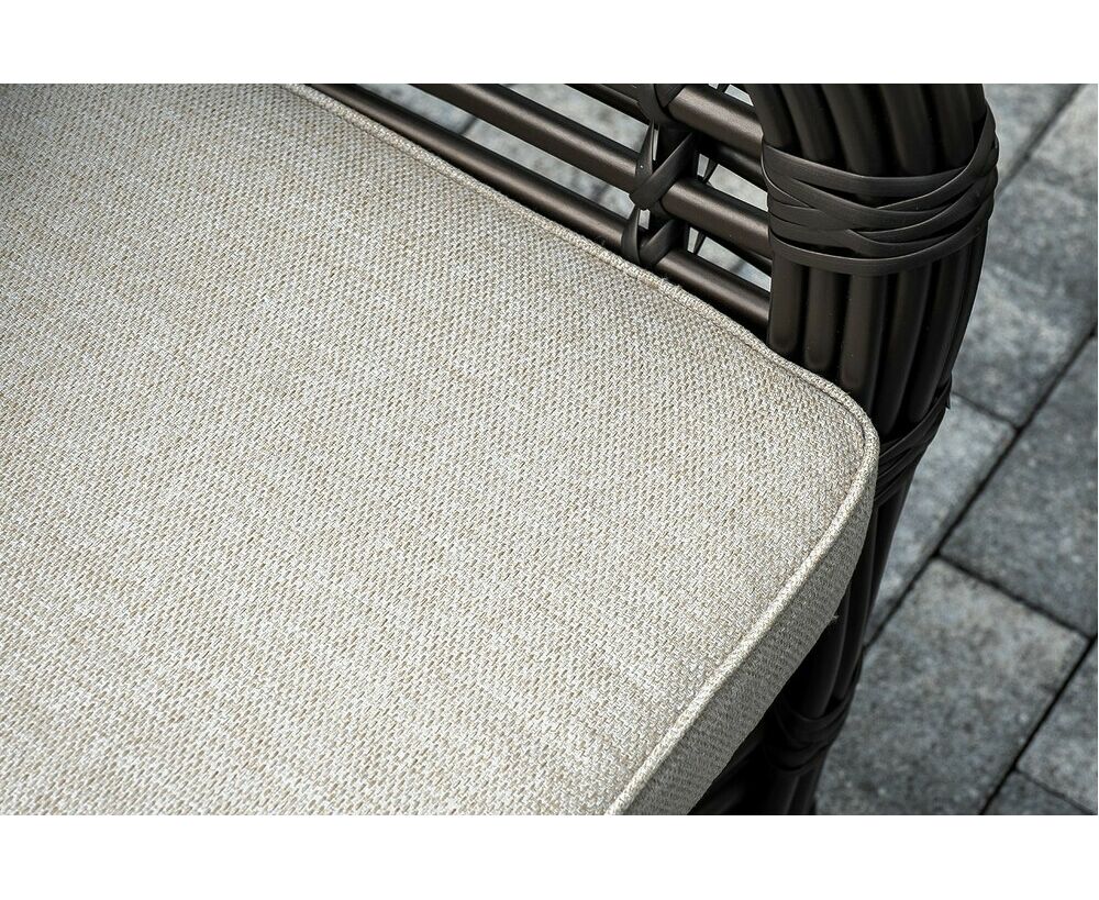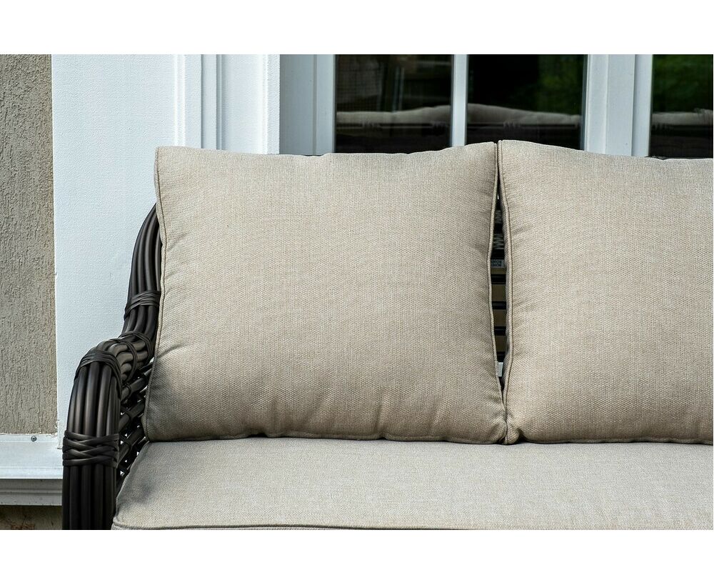 Плетеная мебель дополнена удобными подушками в бежевых чехлах. При их изготовлении используют полиэстер, плотность – 300гр/м2. Он обрабатывается влагоотталкивающей пропиткой для повышения защитных свойств материала.