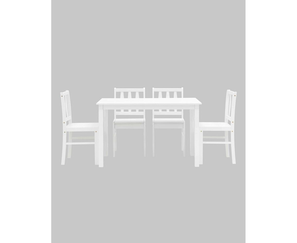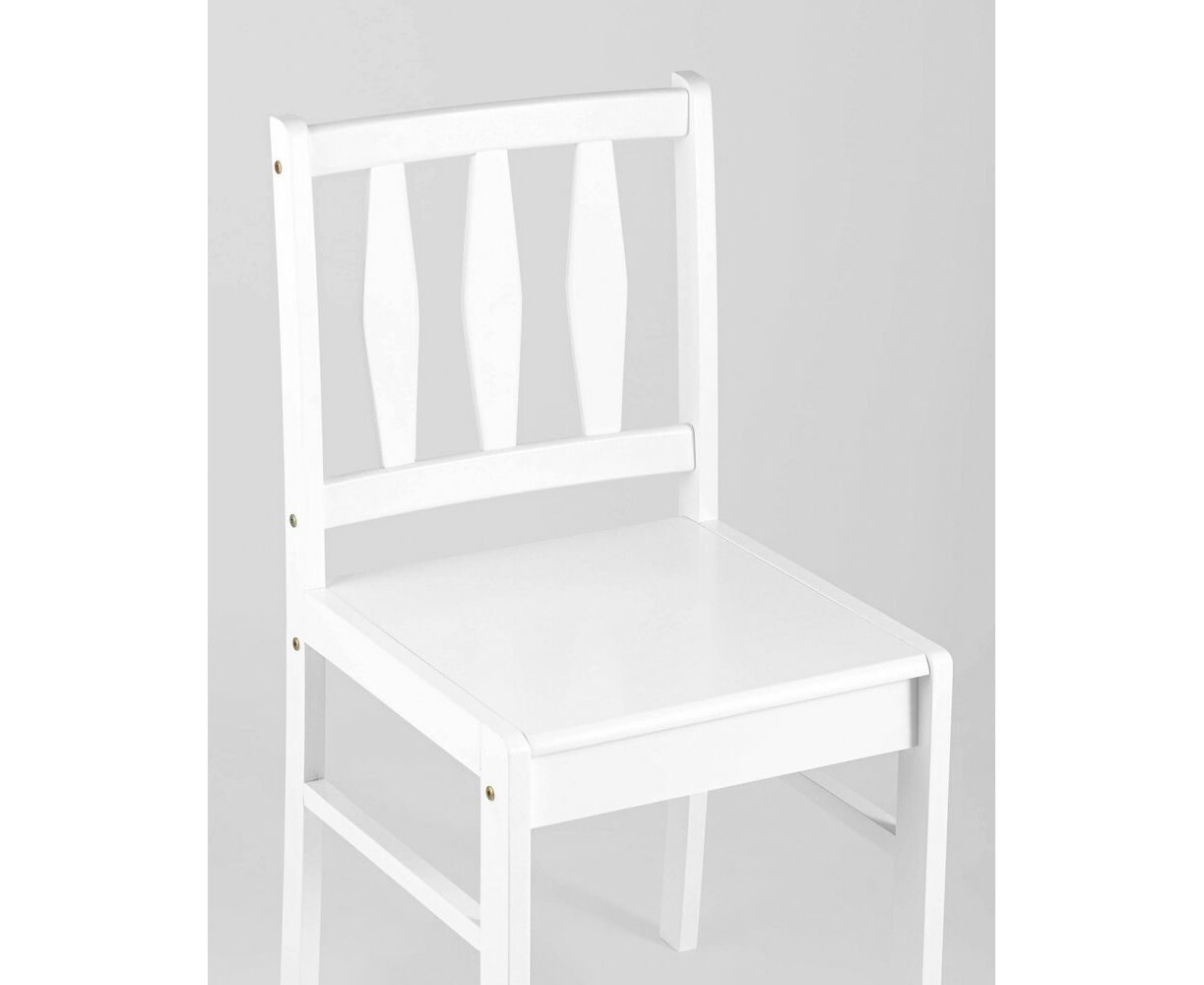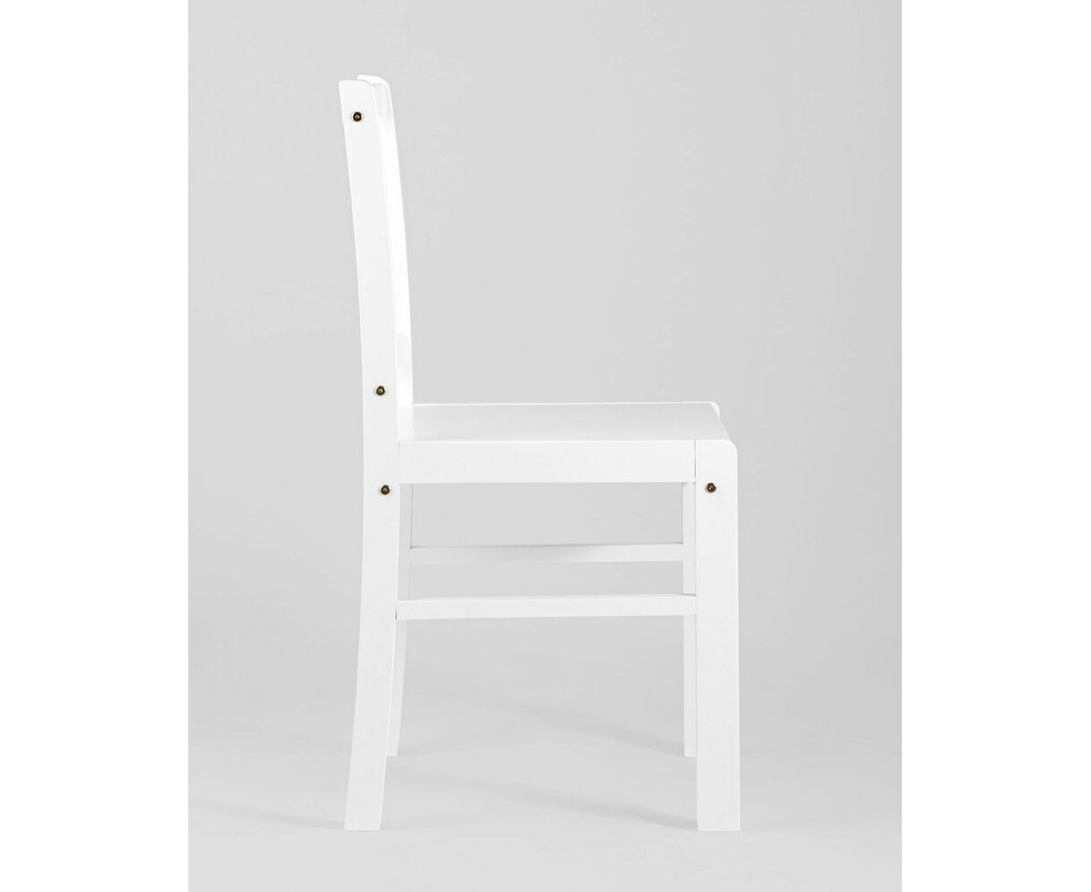 Стулья и ножки стола выполнены из массива дерева гевеи, которое отличается высокой влагостойкостью, устойчивостью к изменениям температур и прочностью. Цвет стульев и стола - белый, классический вариант для любой современной кухни.