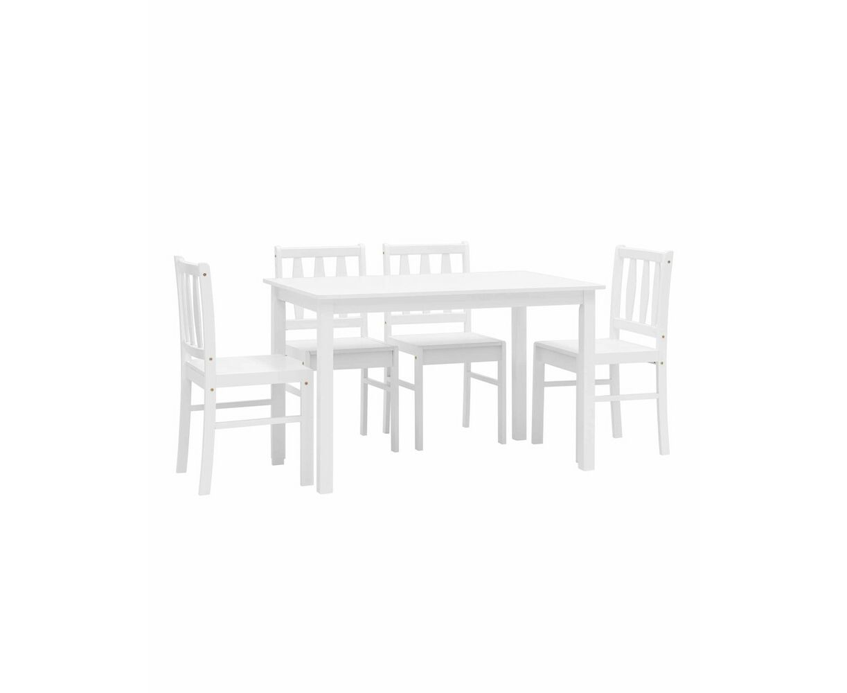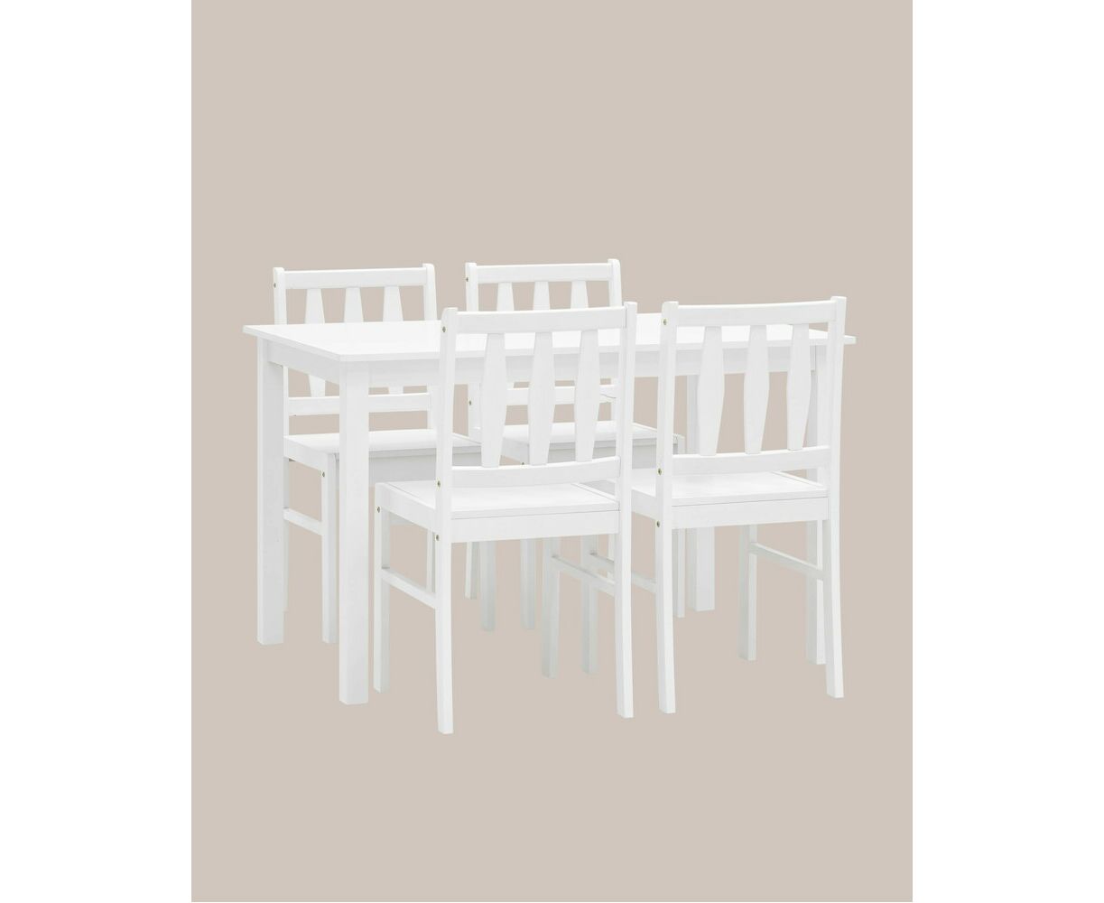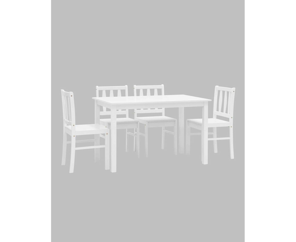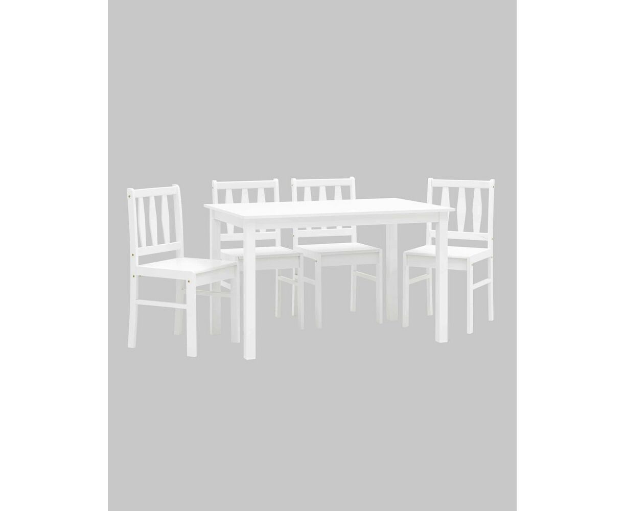 Стулья и ножки стола выполнены из массива дерева гевеи, которое отличается высокой влагостойкостью, устойчивостью к изменениям температур и прочностью. Цвет стульев и стола - белый, классический вариант для любой современной кухни.