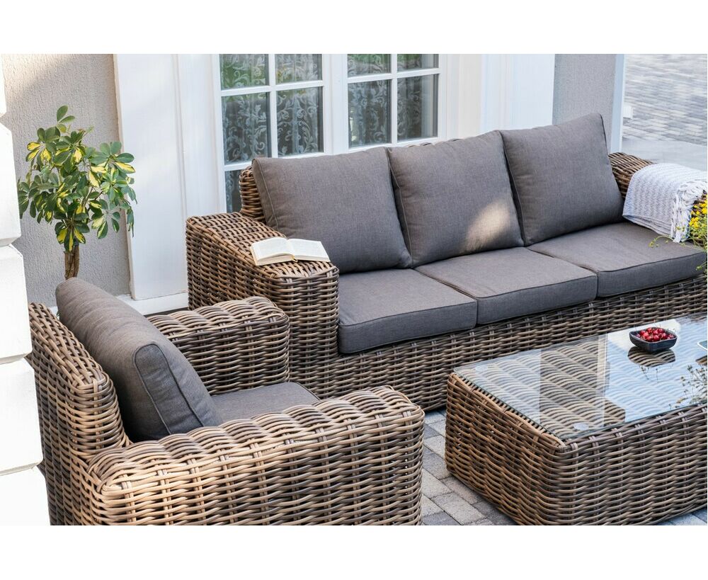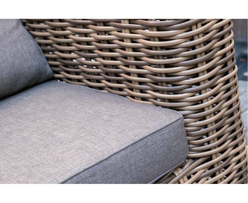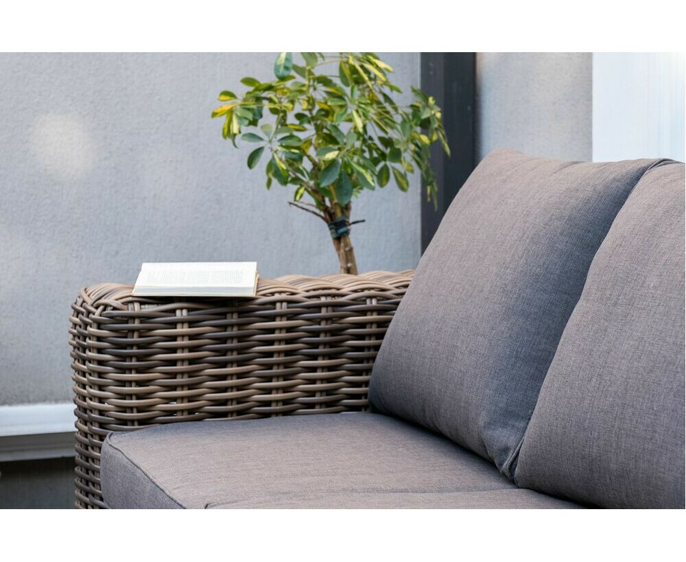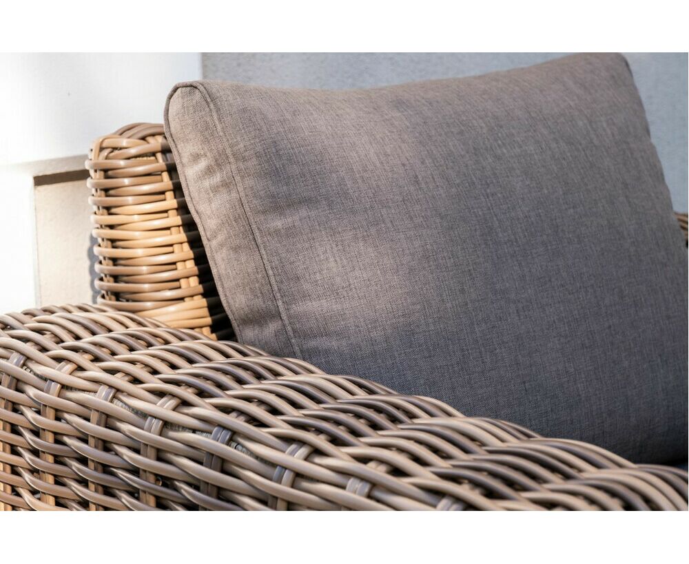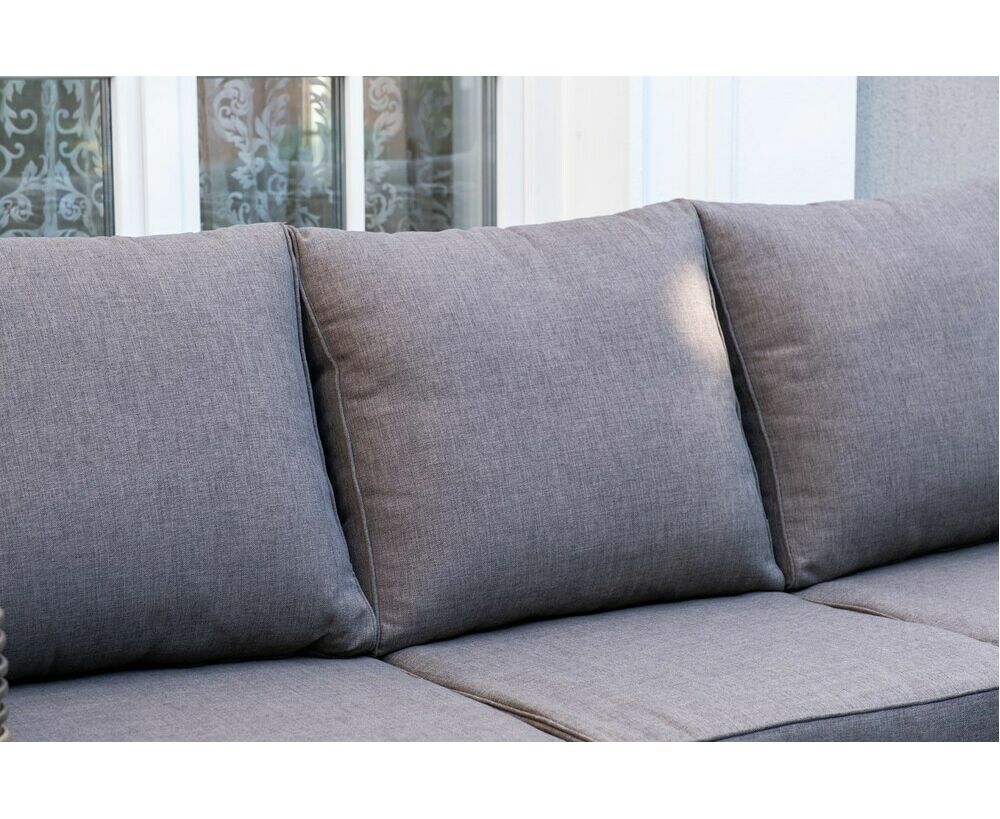 Плетеная мебель дополнена удобными подушками в серо-коричневых чехлах. При их изготовлении используют полиэстер, плотность – 230гр/м2. Он обрабатывается влагоотталкивающей пропиткой для повышения защитных свойств материала.