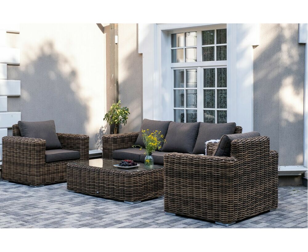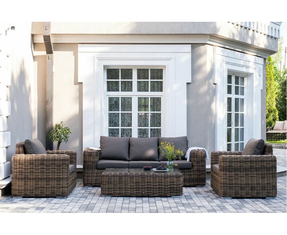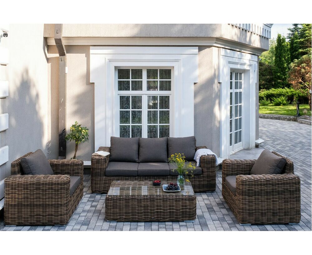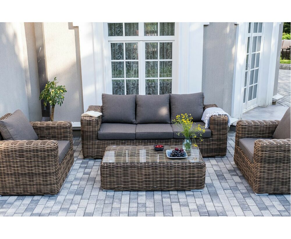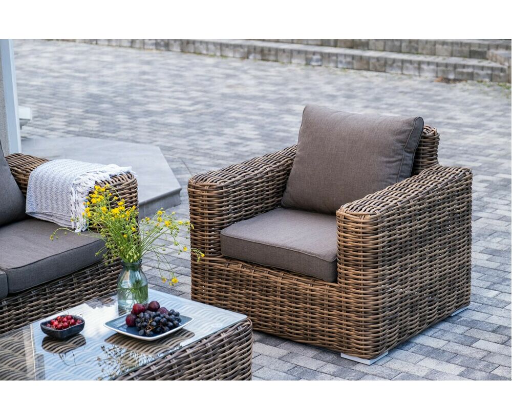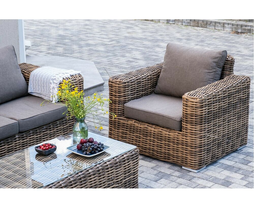 Плетеная мебель дополнена удобными подушками в серо-коричневых чехлах. При их изготовлении используют полиэстер, плотность – 230гр/м2. Он обрабатывается влагоотталкивающей пропиткой для повышения защитных свойств материала.