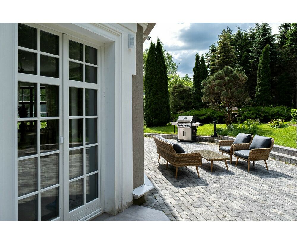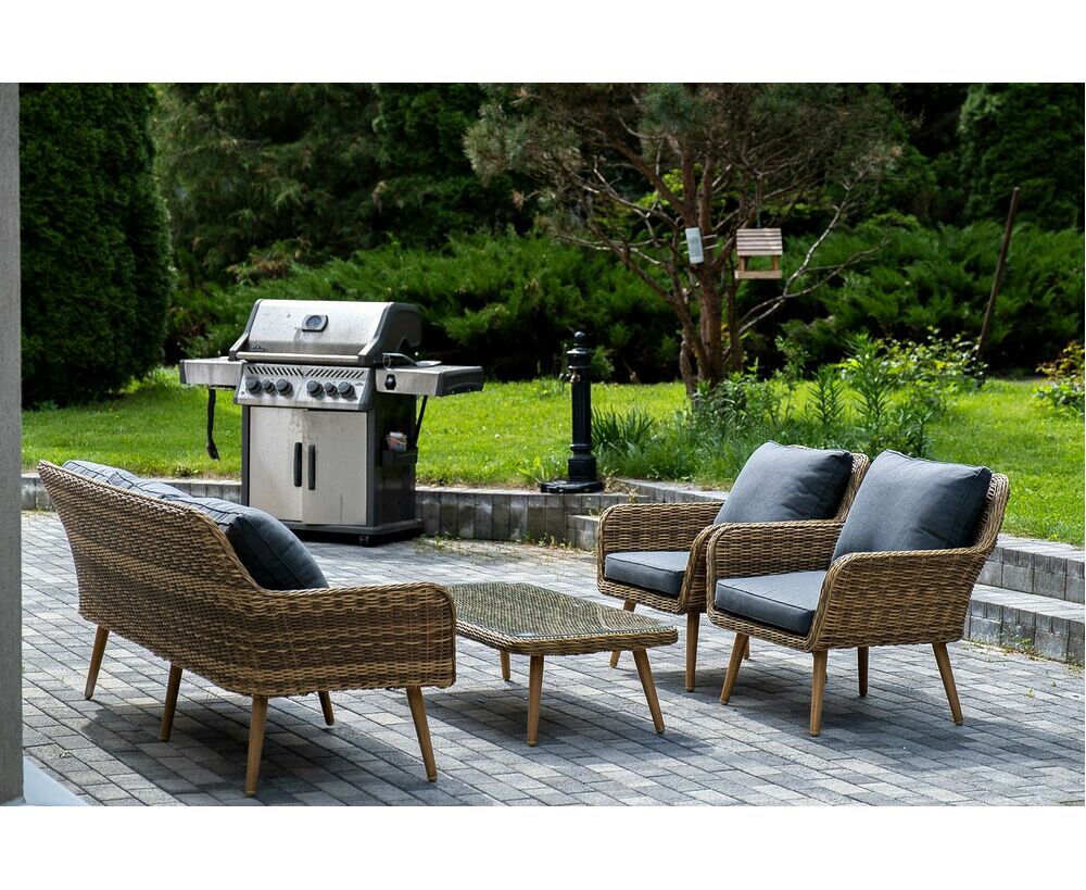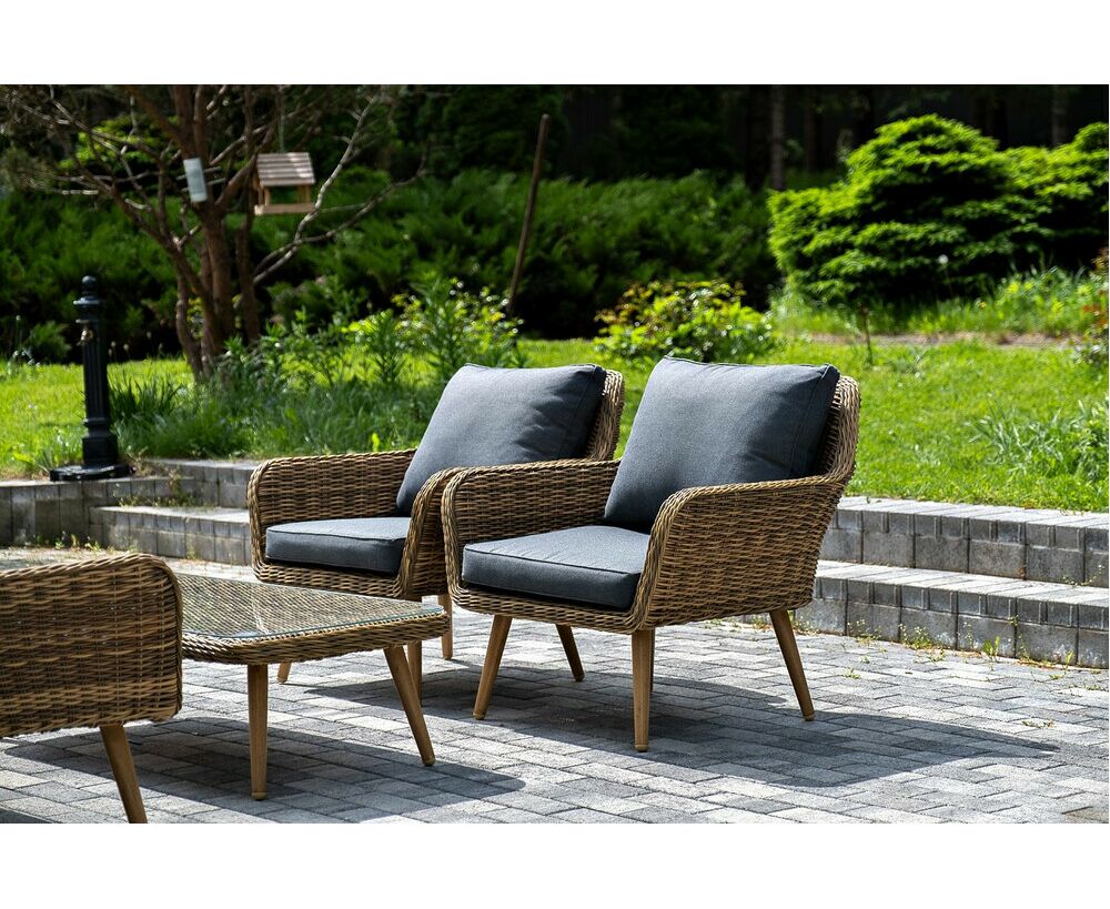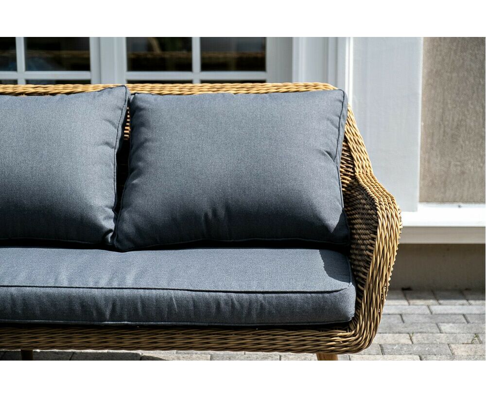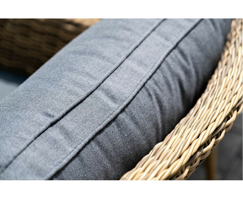 Плетеная мебель дополнена удобными подушками в серо-коричневых чехлах. При их изготовлении используют полиэстер, плотность – 230гр/м2. Он обрабатывается влагоотталкивающей пропиткой для повышения защитных свойств материала.