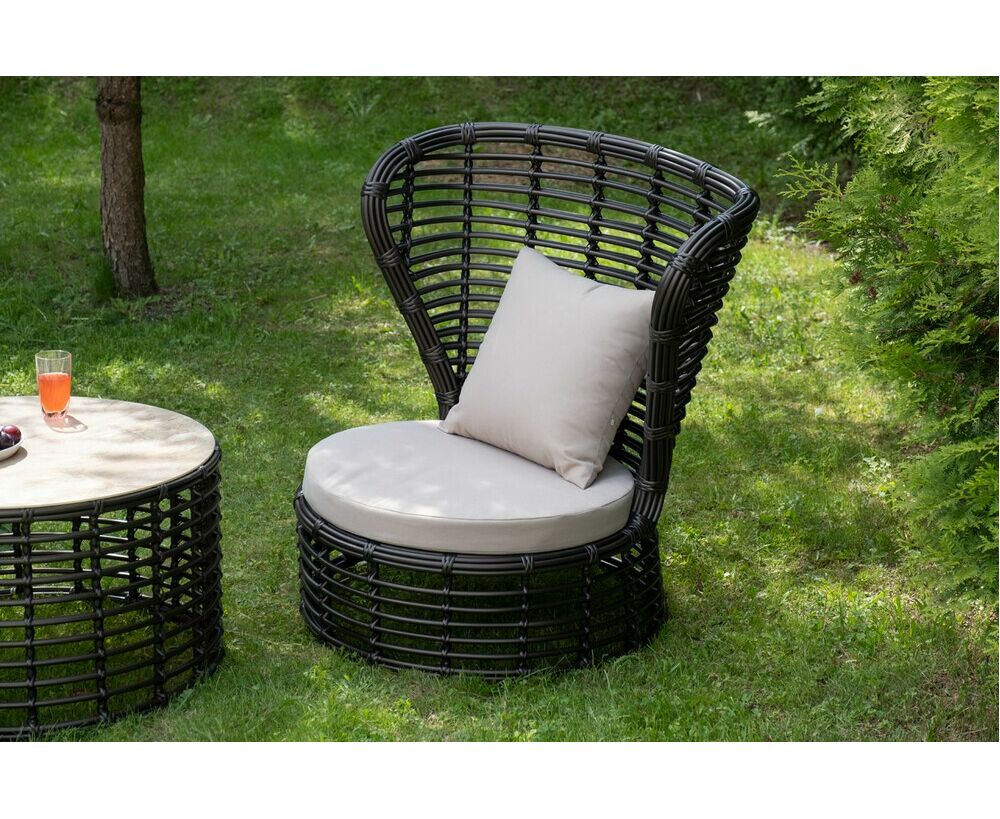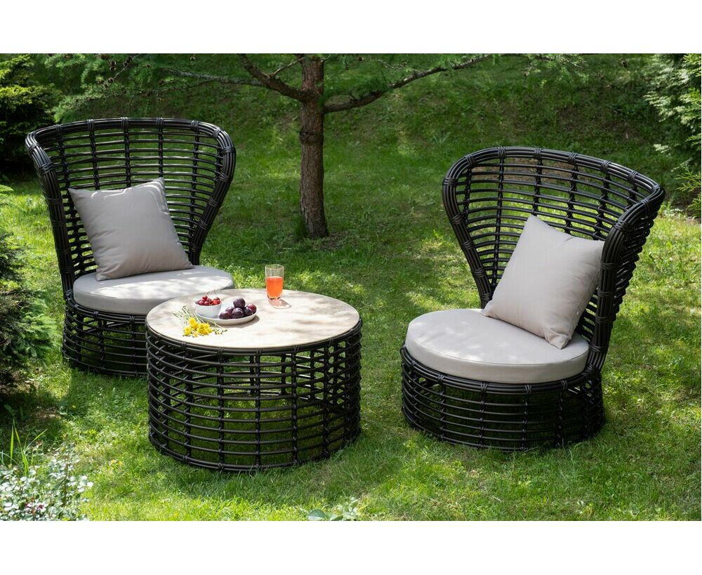 Плетение выполнено вручную круглым искусственным ротангом бронзового цвета, кресло укомплектовано подушками из 100% полиэстера, которые пропитаны специальным составом, обладающим влагоотталкивающим свойством. "Парма" журнальный столик из искусственного ротанга, цвет бронзовый 1шт. 900Х900Х450, "Парма" кресло из искусственного ротанга, цвет бронзовый 2шт. 1 070Х1 020Х1 130,