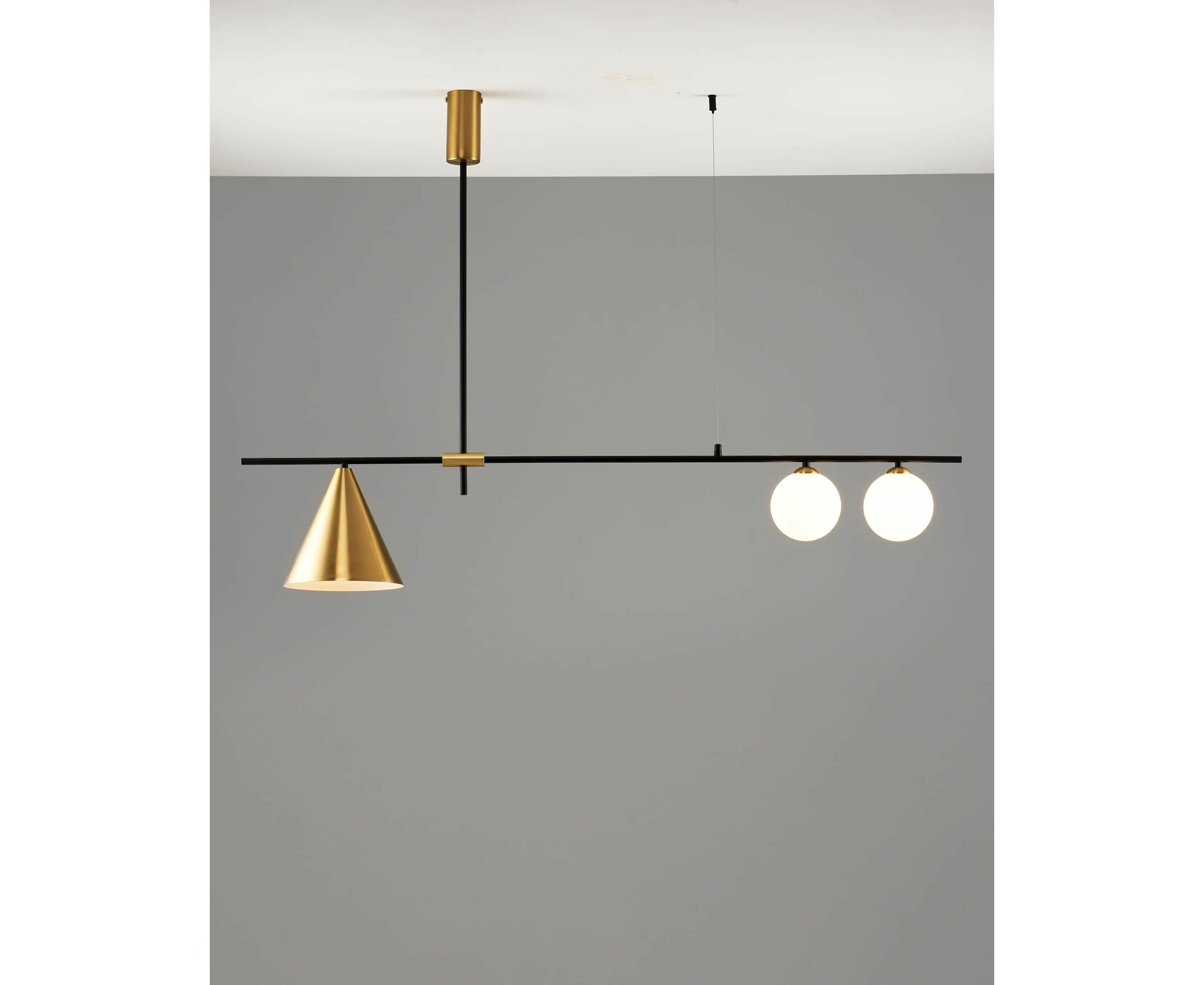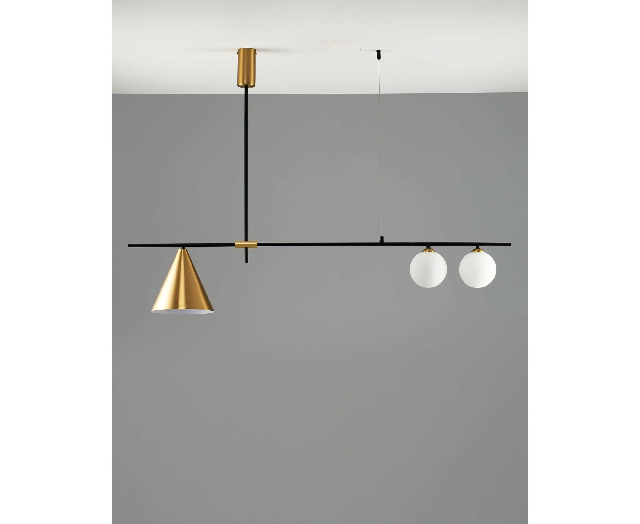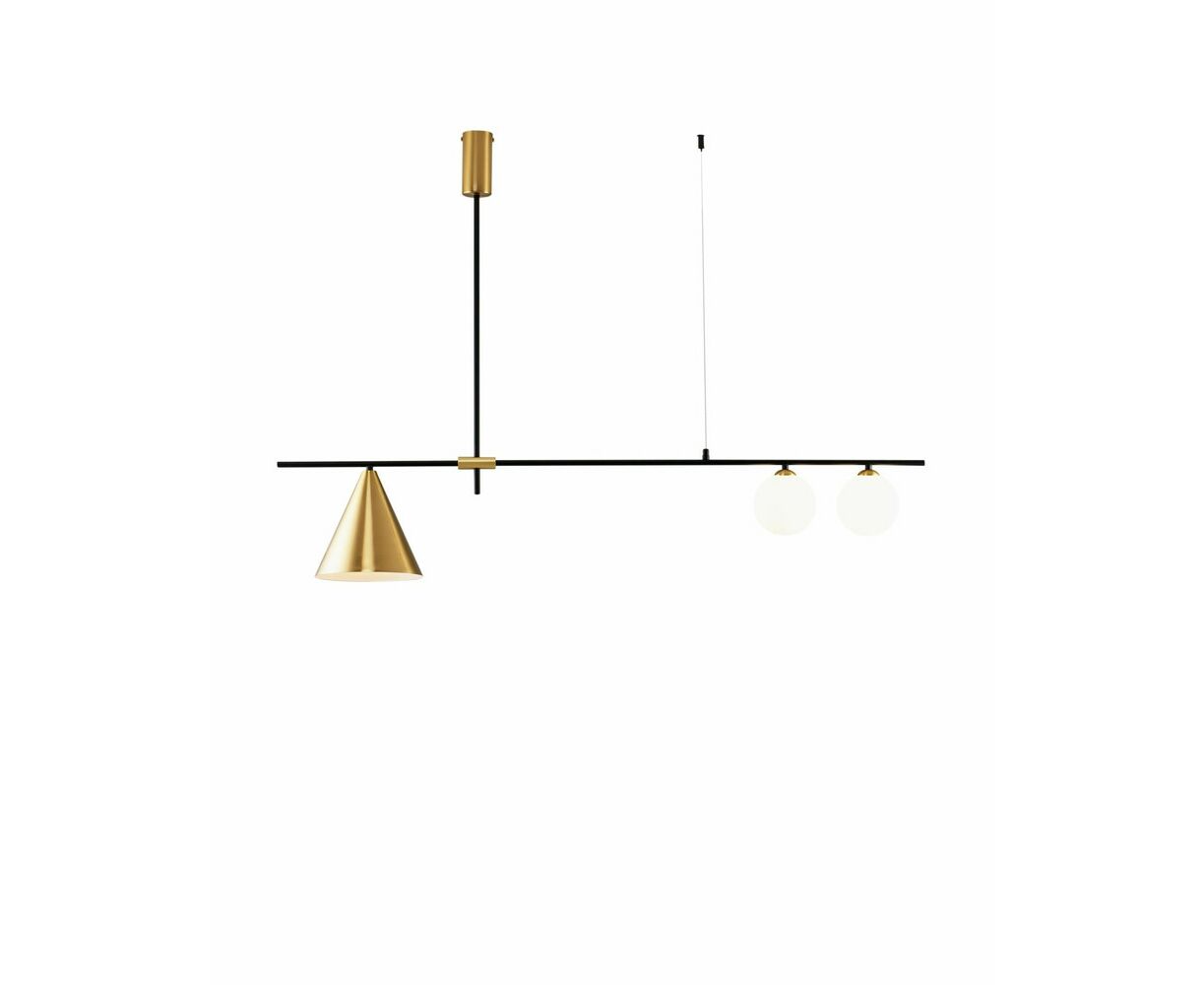 Стильный и оригинальный подвесной светильник Dellay. Светильник сочетает в себе геометрическую композицию из объемных фигур. Один плафон конусной формы создаёт приглушённое и точечное освещение, а два шарообразных плафона из матового стекла мягко рассеивают свет. Металлический каркас надёжно крепится к потолку с помощью планки и дополнительного троса. Длина каркаса в 123 см позволяет разместить светильник в больших и просторных комнатах, площадь освещения составляет 16 м². Данная модель идеальный вариант для коридора, кухни или барной зоны.