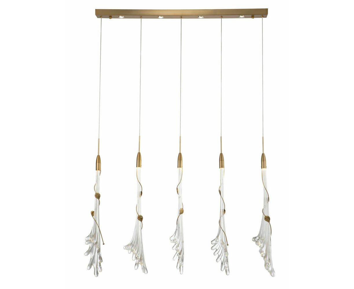 Подвесной светильник из серии Melburn. Изящные стеклянные плафоны в виде цветка украшены листьями лозы золотого цвета. В качестве источника света служат LED лампы с общей мощностью 5Вт и со световым потоком 600 Лм. Светильник прекрасно смотрится в комплекте из нескольких штук, так и в единичном экземпляре, подходит для точечного освещения и зонирования комнаты. Высоту светильника можно отрегулировать при монтаже с помощью подвесных тросов.
