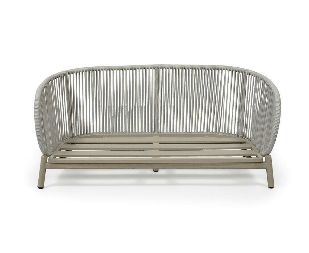 Прочная и надежная основа дивана – это алюминиевый каркас, искусно имитирующий текстуру дерева. В сочетании с светло-серой оплеткой из искусственного ротанга, диван приобретает неповторимый облик, выделяясь на фоне стандартных моделей.
