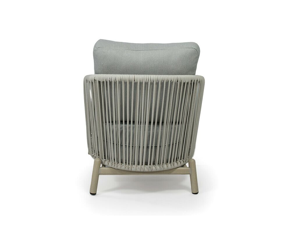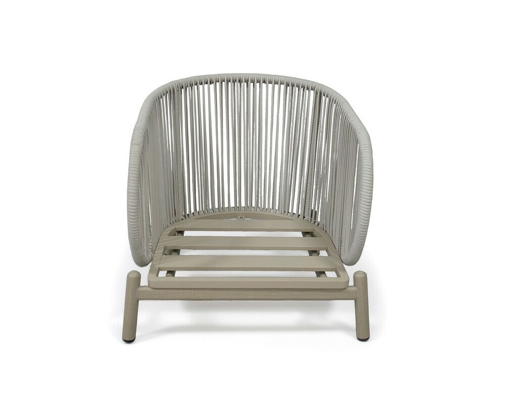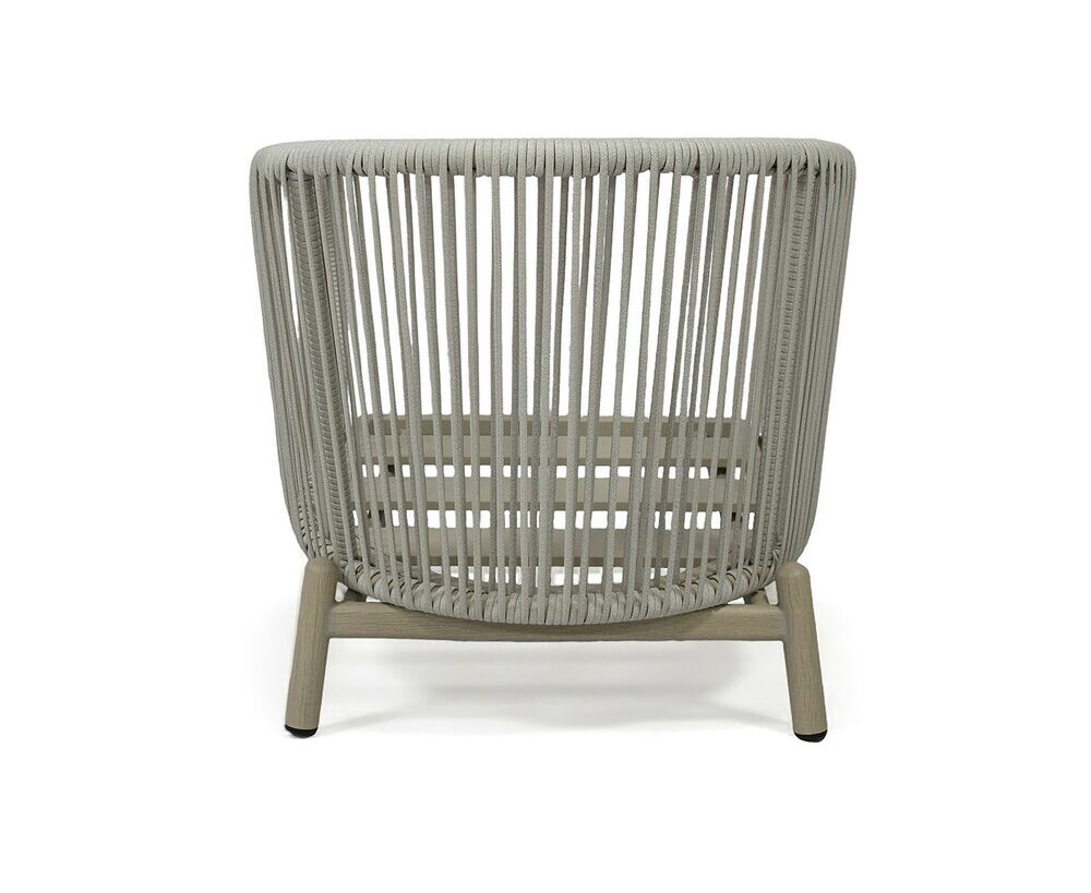 Алюминиевый каркас, мастерски замаскированный под дерево, дарит креслу ощущение природной гармонии. Серая оплетка из искусственного ротанга, добавляет текстуры и изысканности.