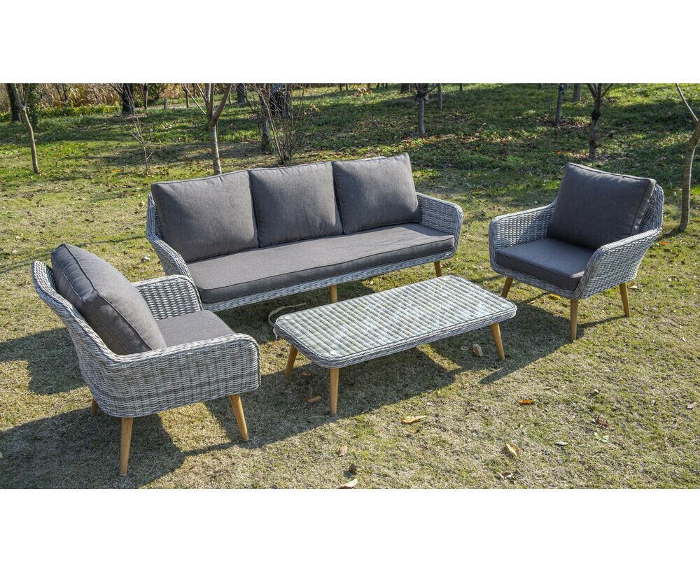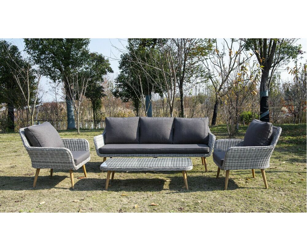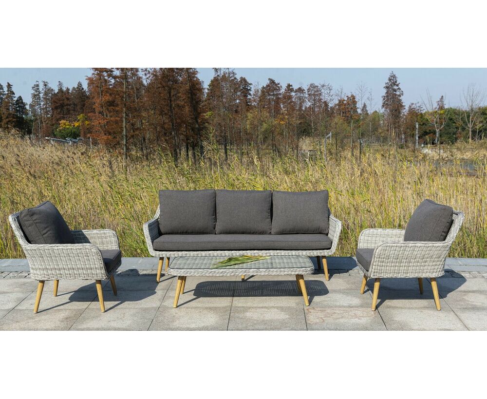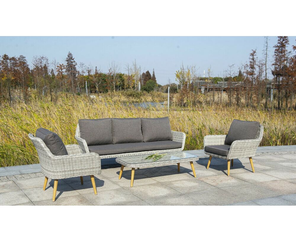 Размер модели – 1900×800×770 мм. Для оплетки каркаса используется высококачественный искусственный ротанг. Мебель выполнена в бежевом оттенке.