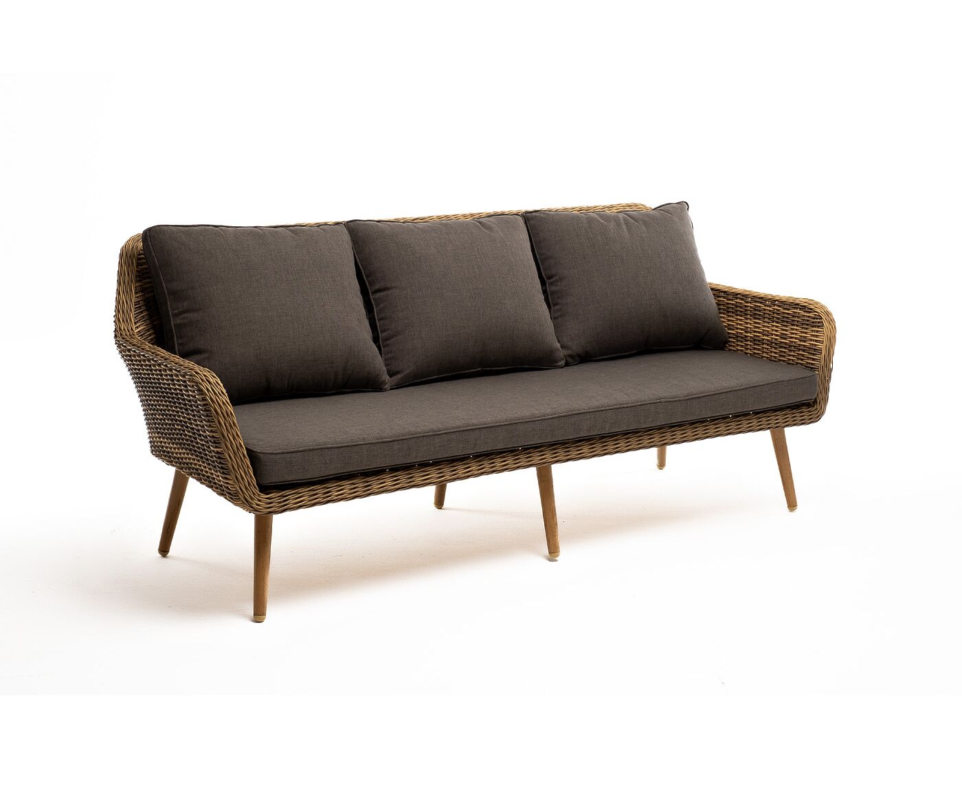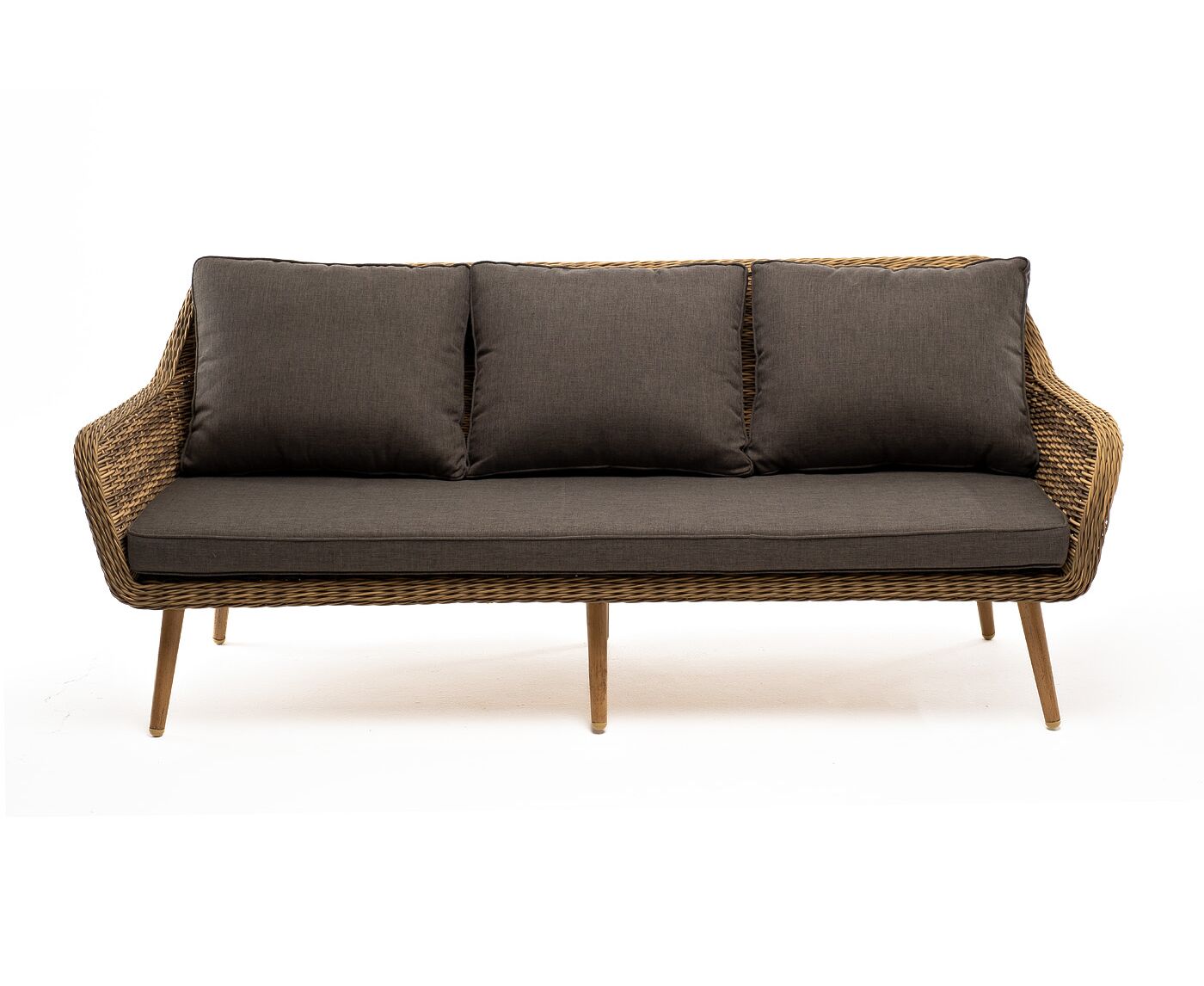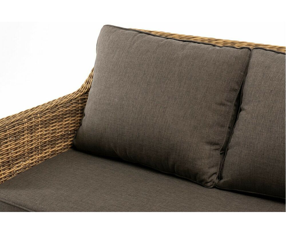 Трехместный диван дополняют мягкие подушки в серо-коричневом цвете со съёмными чехлами. Тканевые изделия выполнены из прочного полиэстера плотностью 230гр/м2. Материал имеет влагоотталкивающую пропитку.