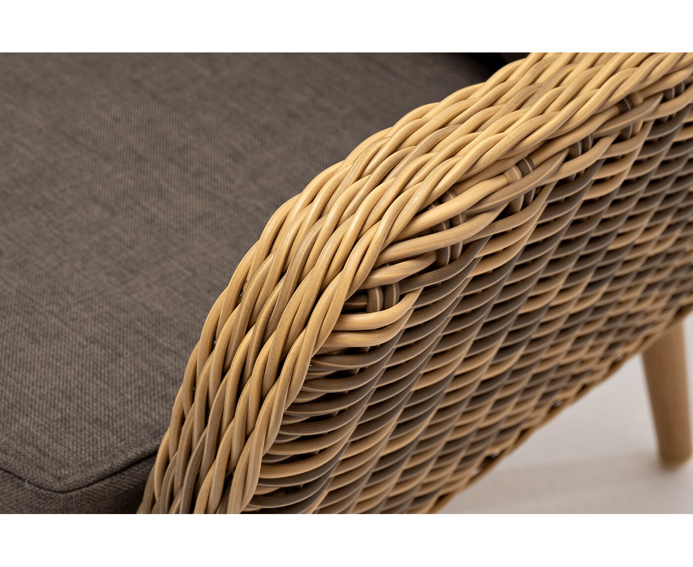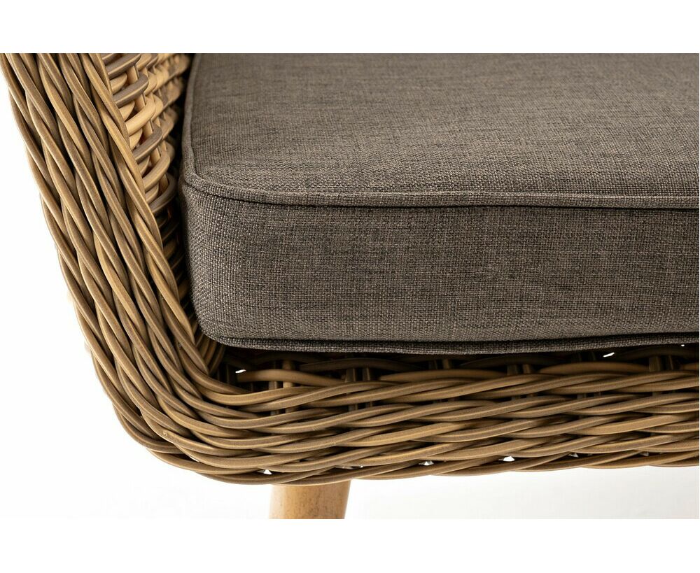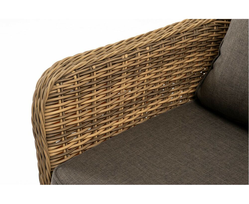 Размер модели – 1900×800×770 мм. Для оплетки каркаса используется высококачественный искусственный ротанг. Мебель выполнена в соломенном оттенке.