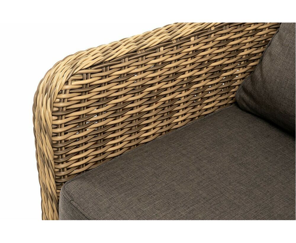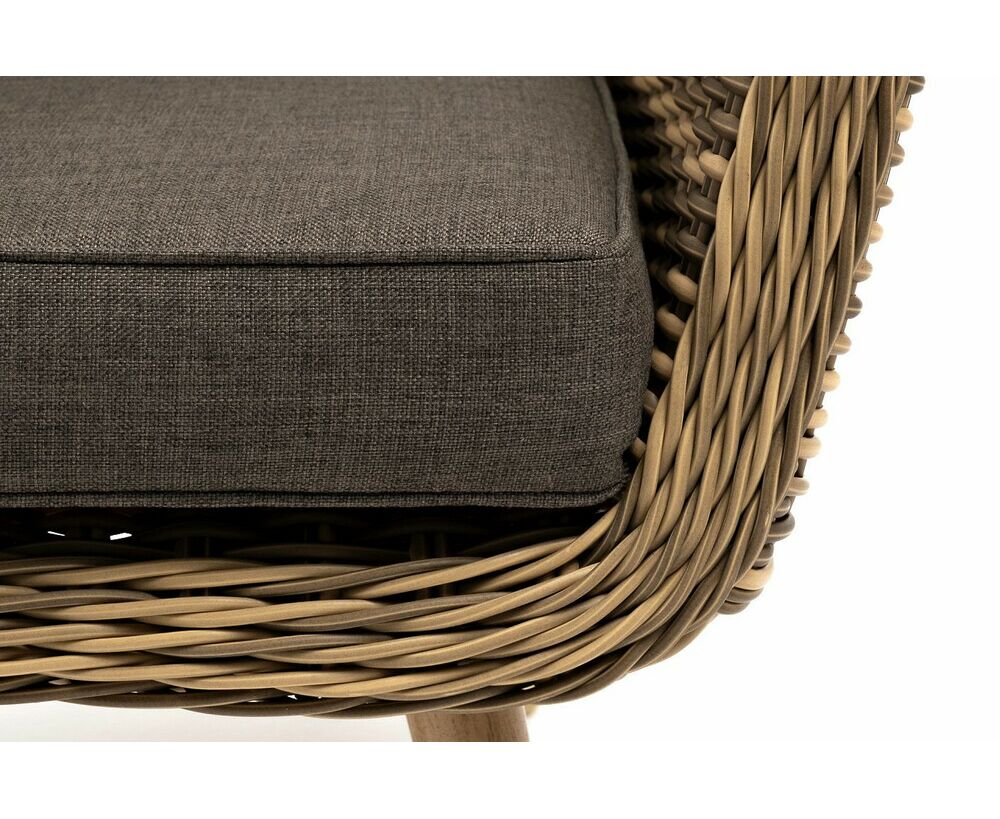 Надежность и износостойкость мебели гарантирует каркас, который сделан из качественного алюминия. Ее дополняет ручное плетение, при изготовлении которого используется искусственный ротанг. Представлена модель в соломенном цвете.