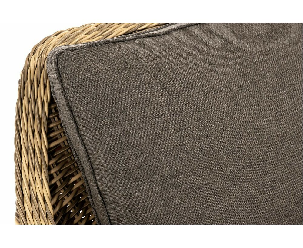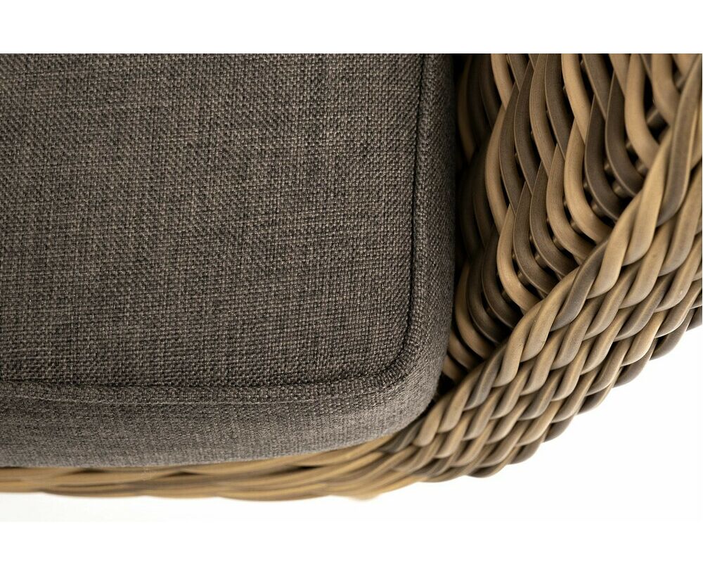 В комплекте с уличным ротанговым креслом идут мягкие подушки со съемными чехлами серо-коричневого оттенка. Они пошиты из полиэстера, который не боится повышенной влажности благодаря наличию влагоотталкивающей пропитки. Плотность ткани составляет 230гр/м2.