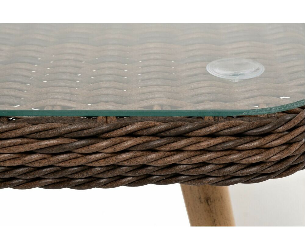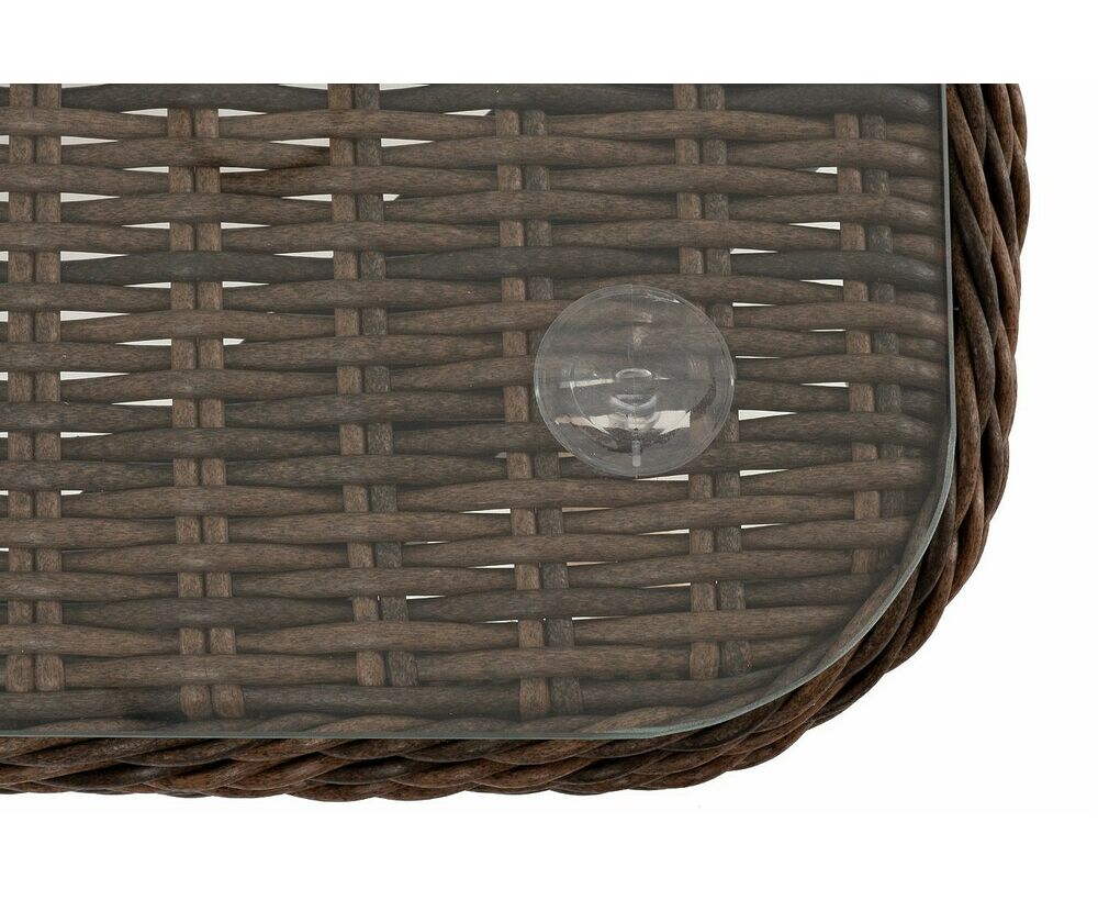 Столешницу из ротангового плетения дополняет прочное стекло, используемое для изготовления мебели. Стекло крепится с помощью держателей на силиконовых присосках и транспортируется в собранном виде.